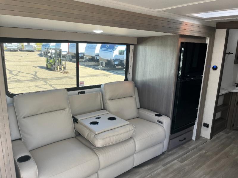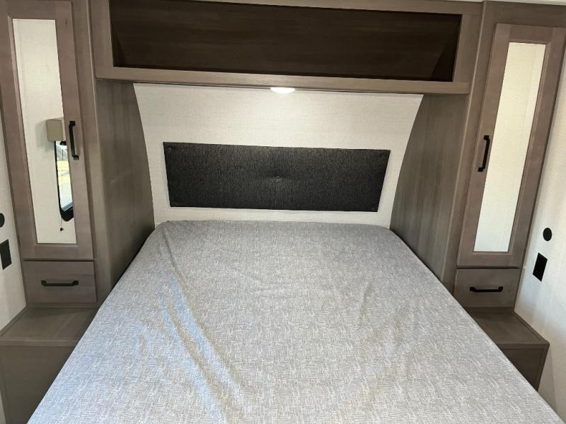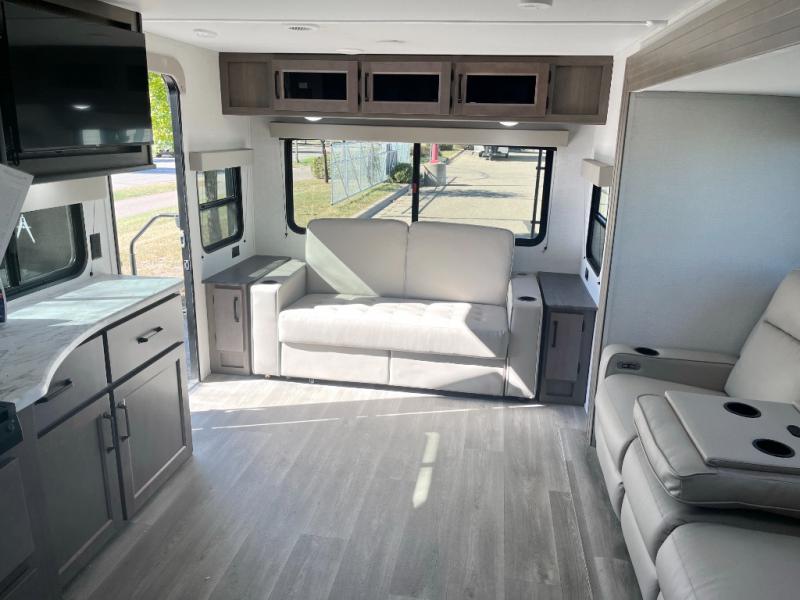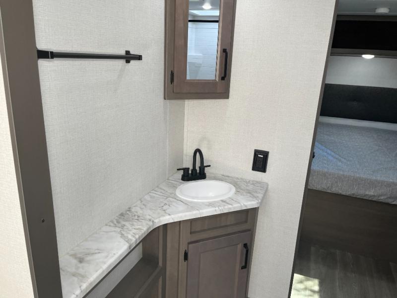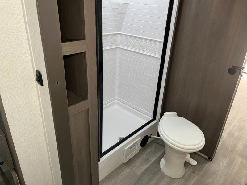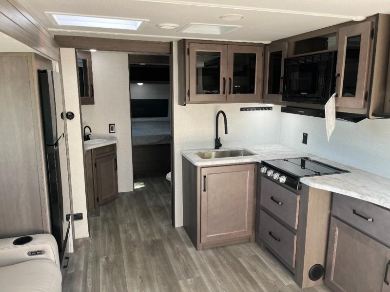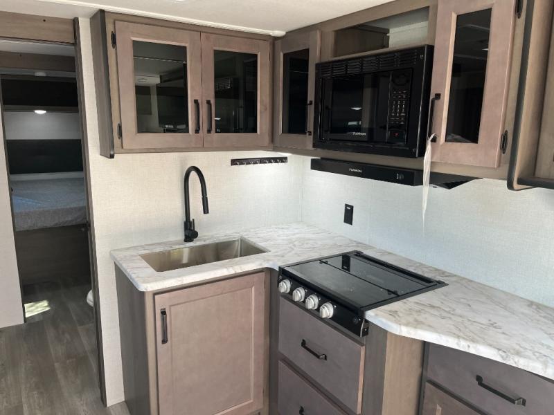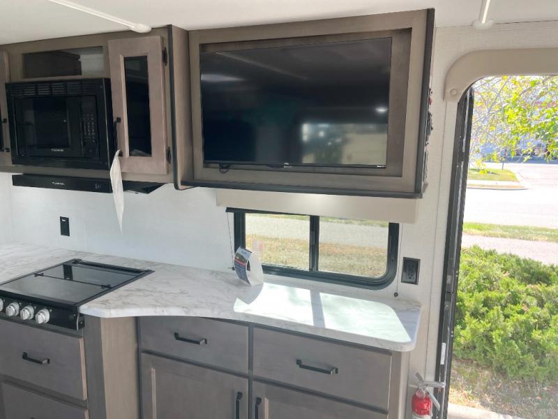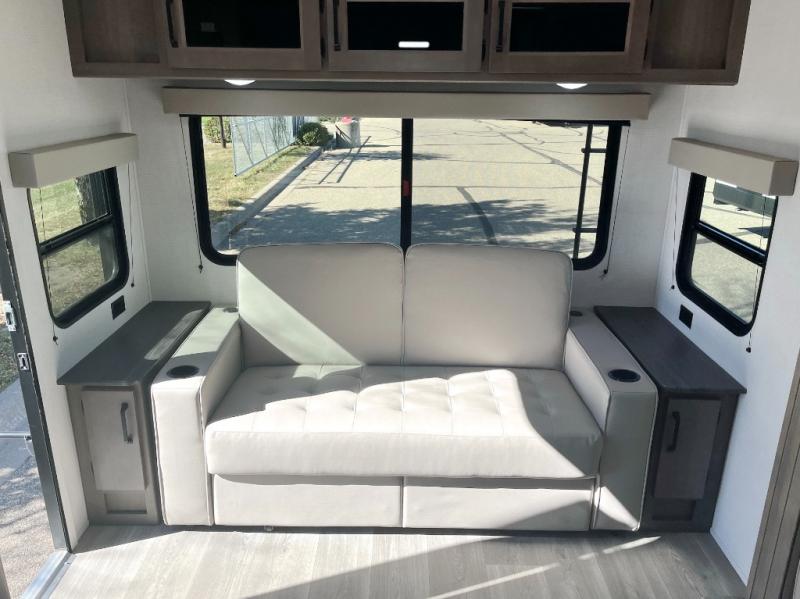 This dual-entry travel trailer will allow you to enjoy weekend getaways in complete comfort. The rear living area includes a U-shaped dinette and a 70" sleeper sofa that will double as seating and sleeping space for guests. Or, you can choose the optional theater seats in place of the dinette if you don't need the extra sleeping space. It will be so easy to fill the dog's food bowl with a convenient pet dish under the refrigerator, and you'll find plenty of storage throughout this model for all your belongings. The walk-through bath leads to the front master bedroom where you'll find a queen bed, overhead storage, and TV prep if you choose to add your own television.