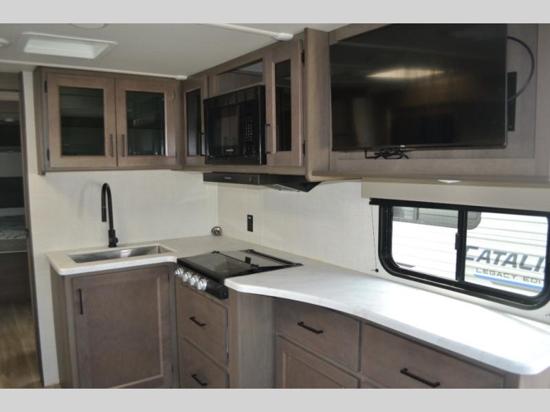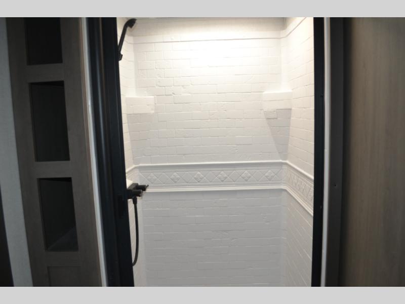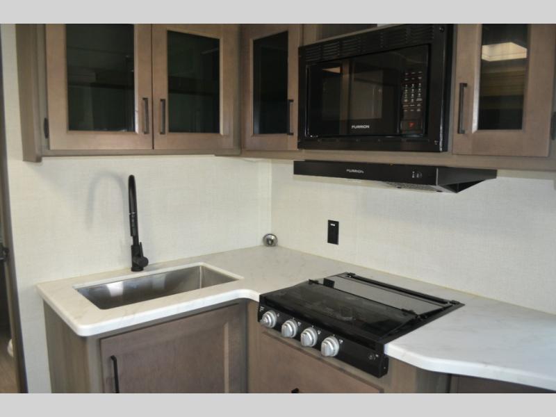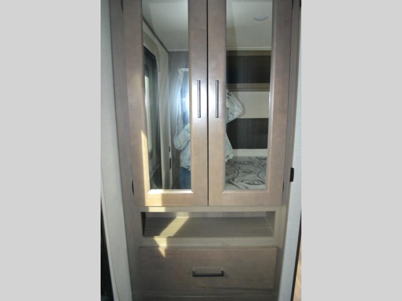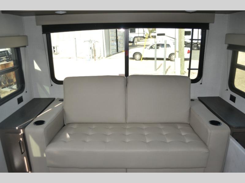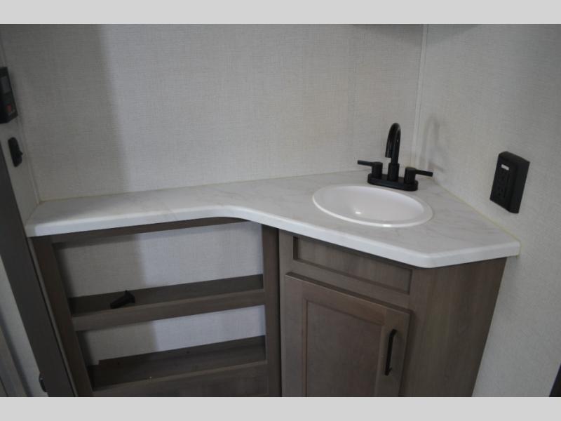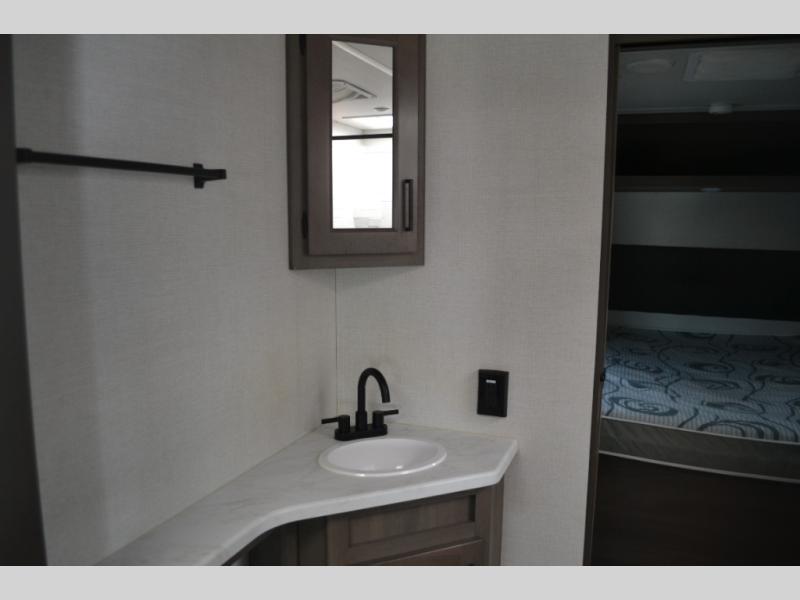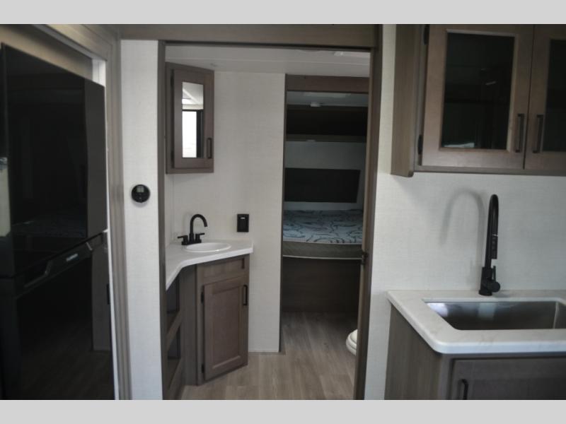 This dual-entry travel trailer will allow you to enjoy weekend getaways in complete comfort. The rear living area includes a U-shaped dinette and a 70" sleeper sofa that will double as seating and sleeping space for guests. Or, you can choose the optional theater seats in place of the dinette if you don't need the extra sleeping space. It will be so easy to fill the dog's food bowl with a convenient pet dish under the refrigerator, and you'll find plenty of storage throughout this model for all your belongings. The walk-through bath leads to the front master bedroom where you'll find a queen bed, overhead storage, and TV prep if you choose to add your own television.