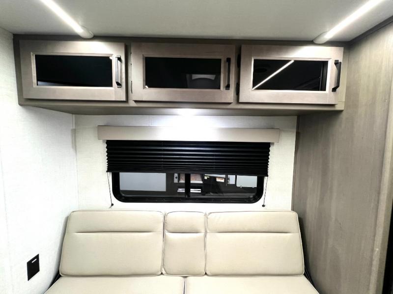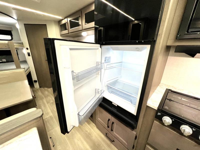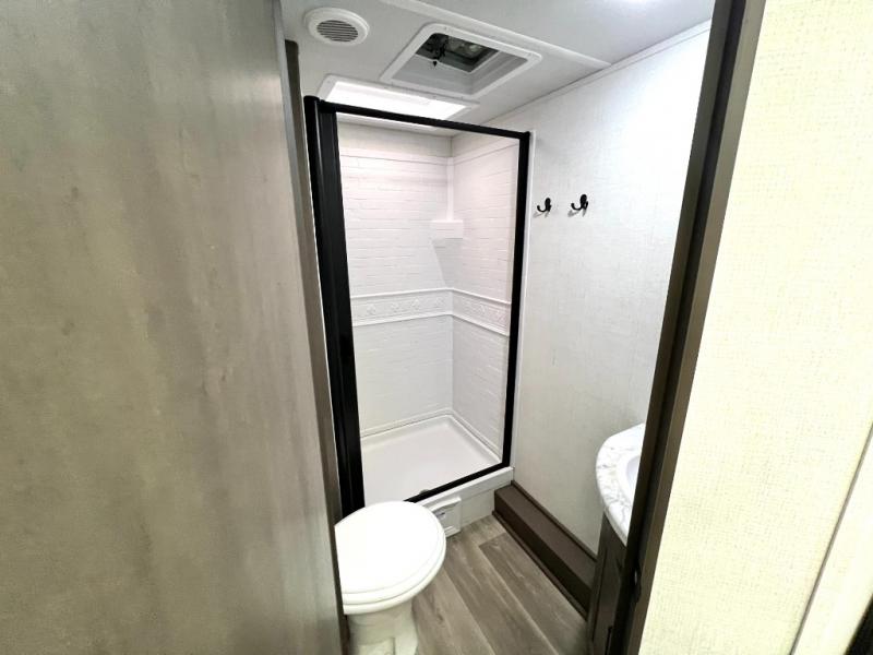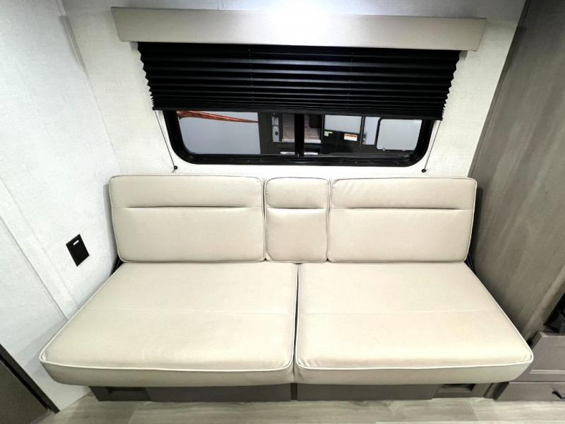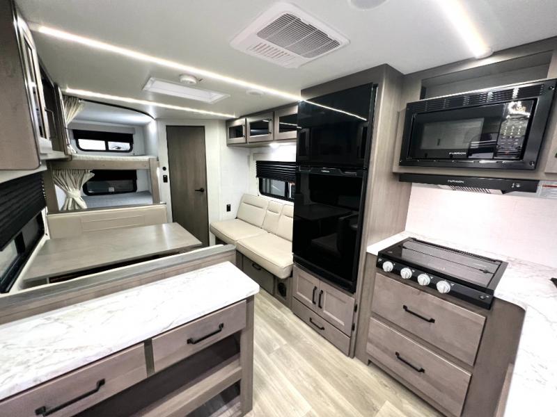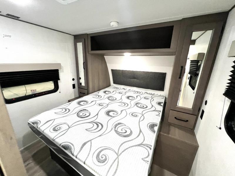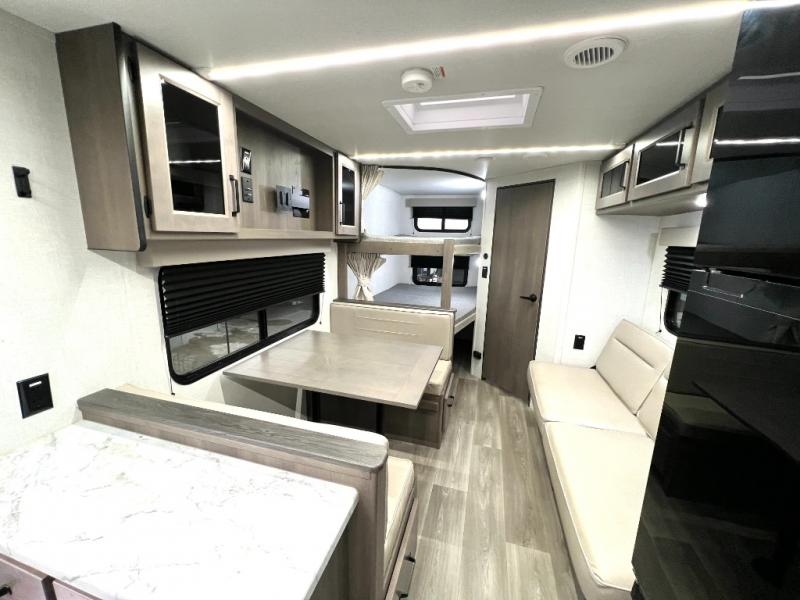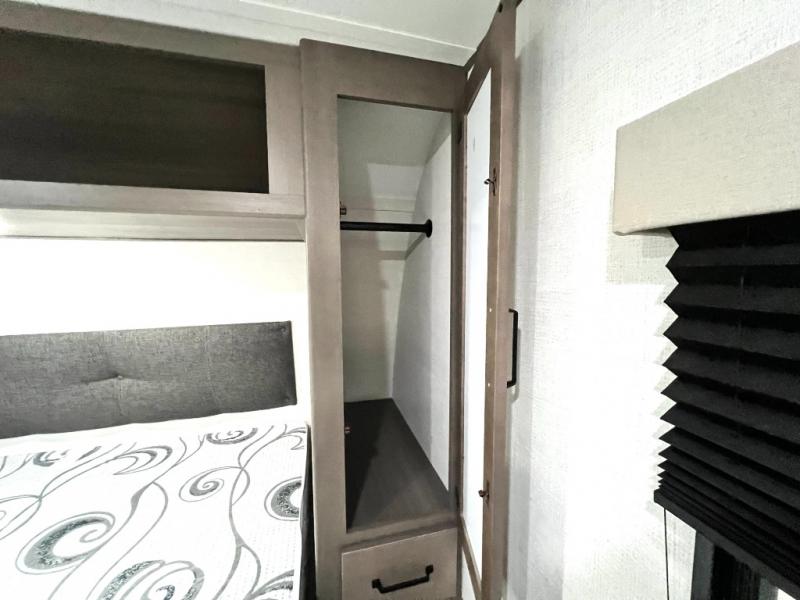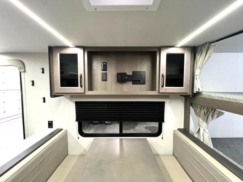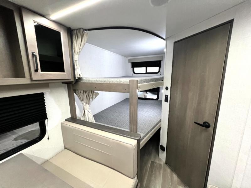If you've been looking for a trailer with more sleeping space for your family or crew, check out this model that can sleep nine people each night! There are double-size bunks in the back next to the full bath, and the under-bed storage will be perfect for luggage and camp gear. While the chef is preparing dinner on the three-burner cooktop, everyone can visit on the booth dinette and 69" roll over sofa. If the weather is nice, you may just find yourselves under the 15' power awning planning out your next day's adventures. This model also includes front private bedroom with a queen bed and overhead storage for books!