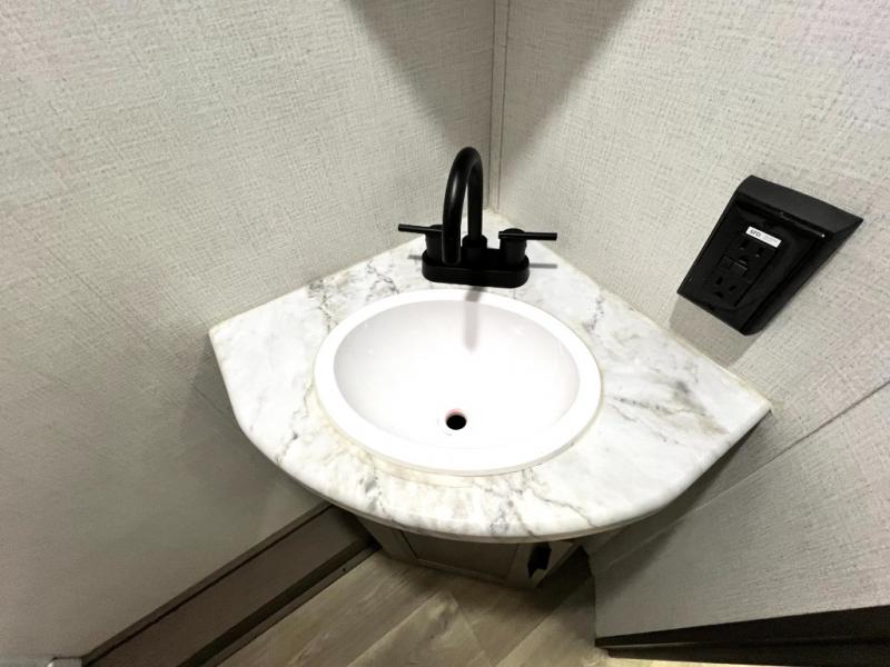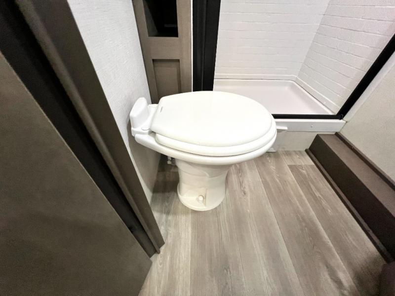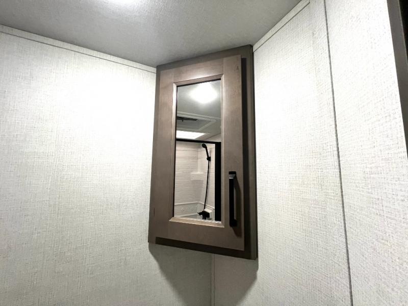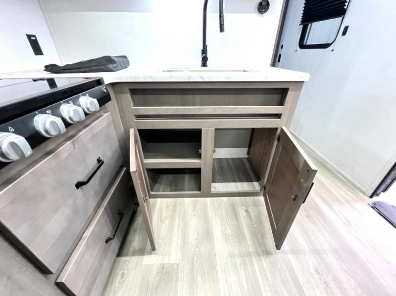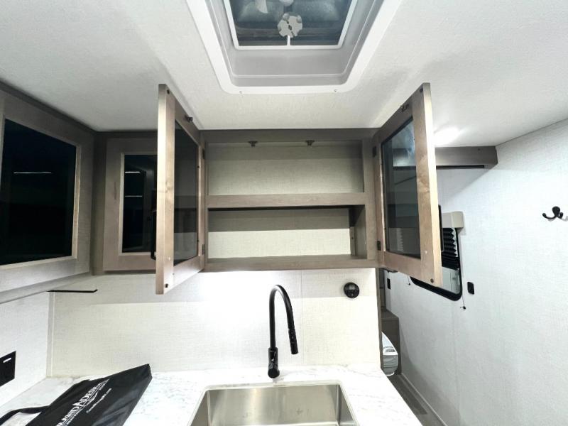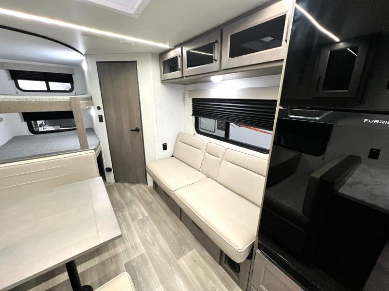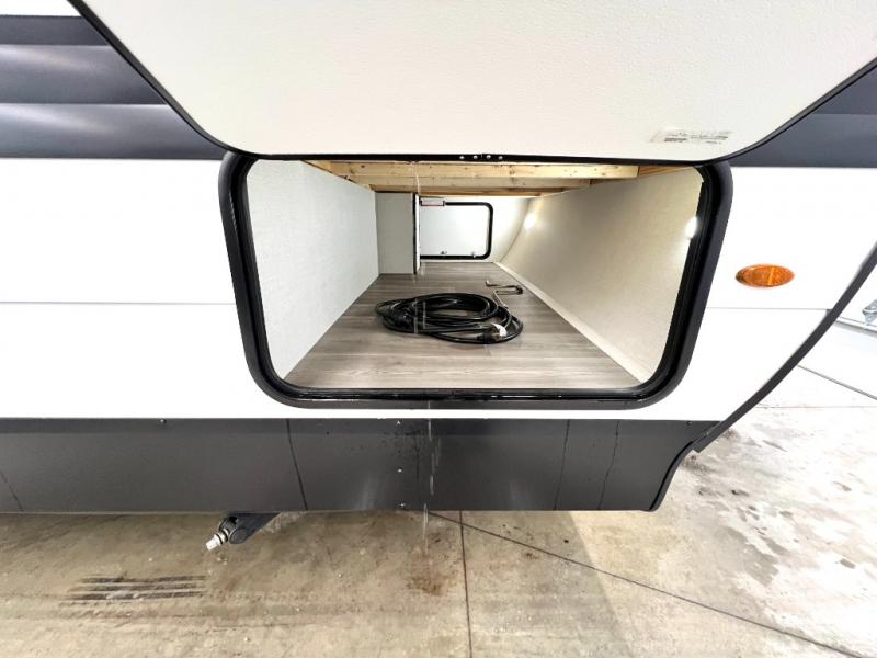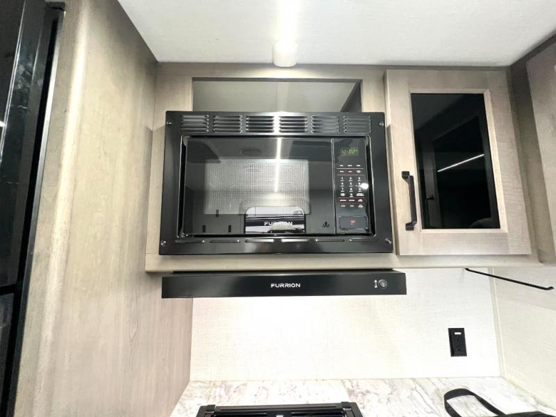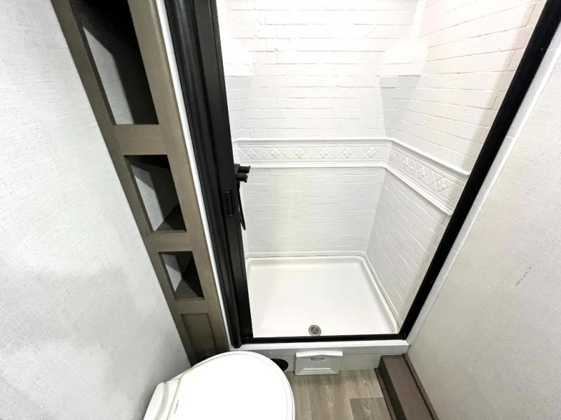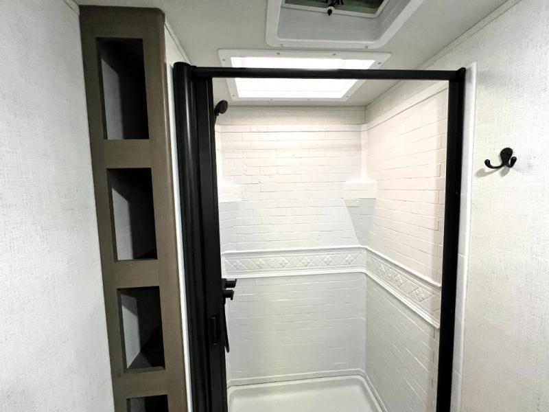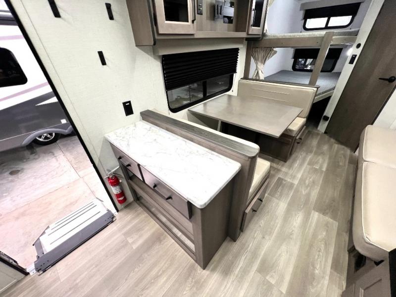 If you've been looking for a trailer with more sleeping space for your family or crew, check out this model that can sleep nine people each night! There are double-size bunks in the back next to the full bath, and the under-bed storage will be perfect for luggage and camp gear. While the chef is preparing dinner on the three-burner cooktop, everyone can visit on the booth dinette and 69" roll over sofa. If the weather is nice, you may just find yourselves under the 15' power awning planning out your next day's adventures. This model also includes front private bedroom with a queen bed and overhead storage for books!