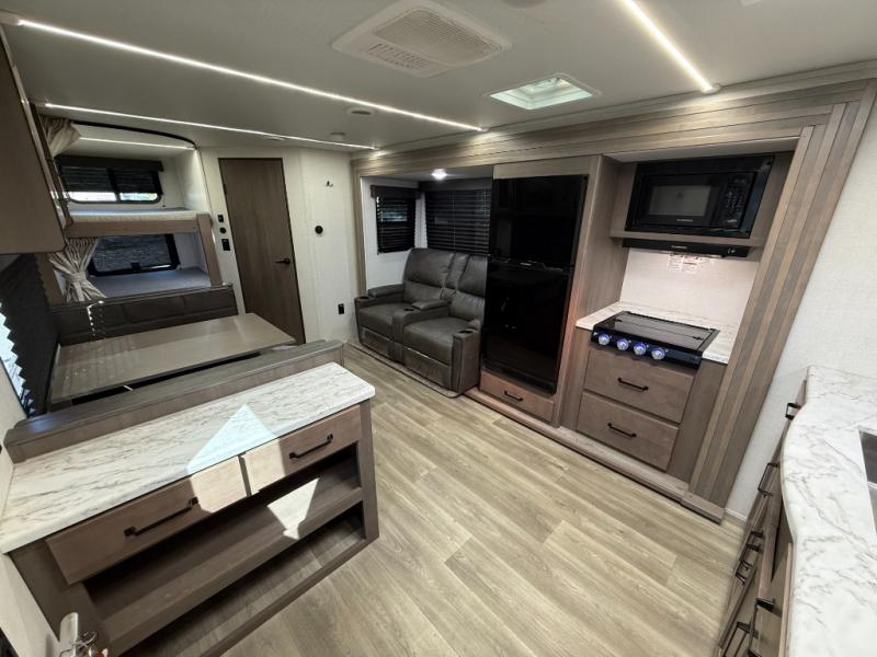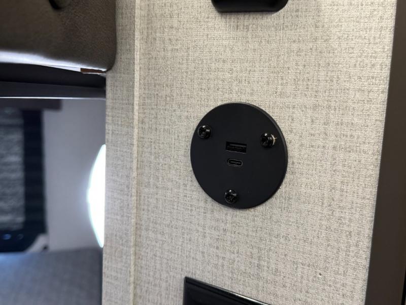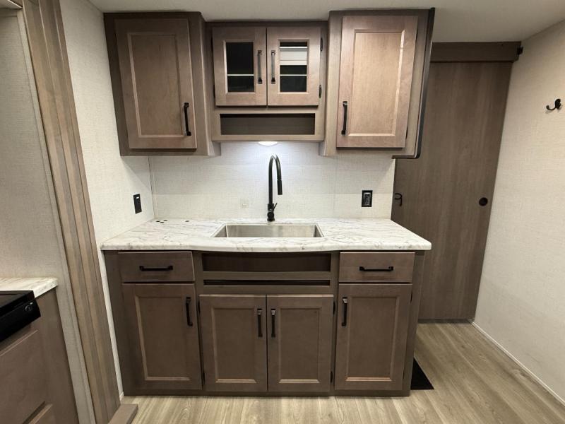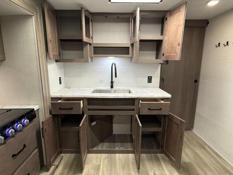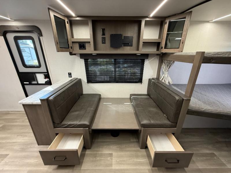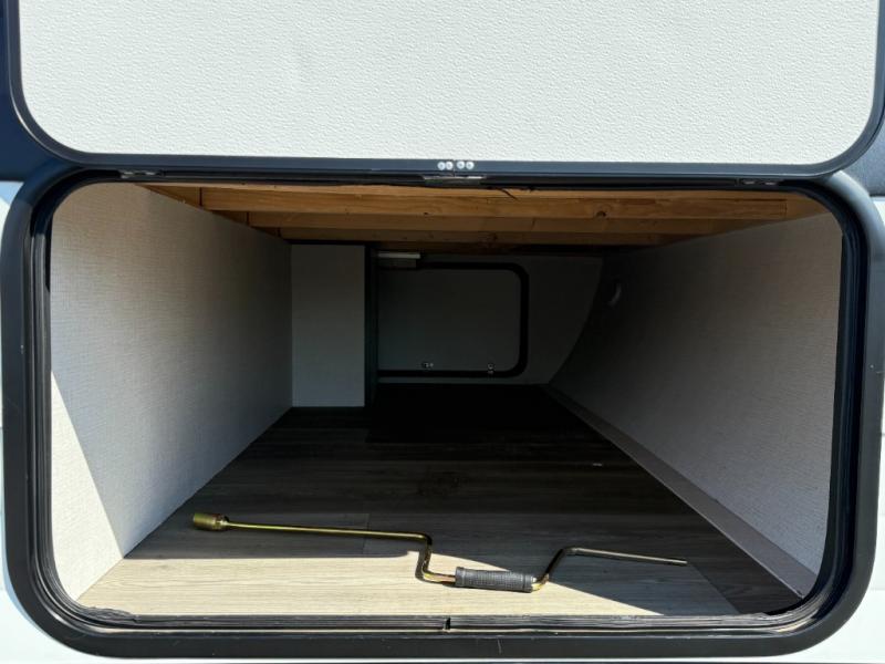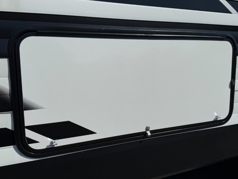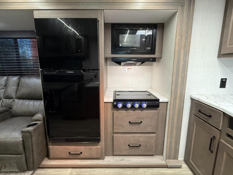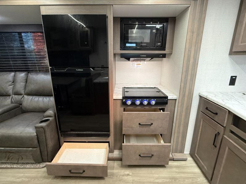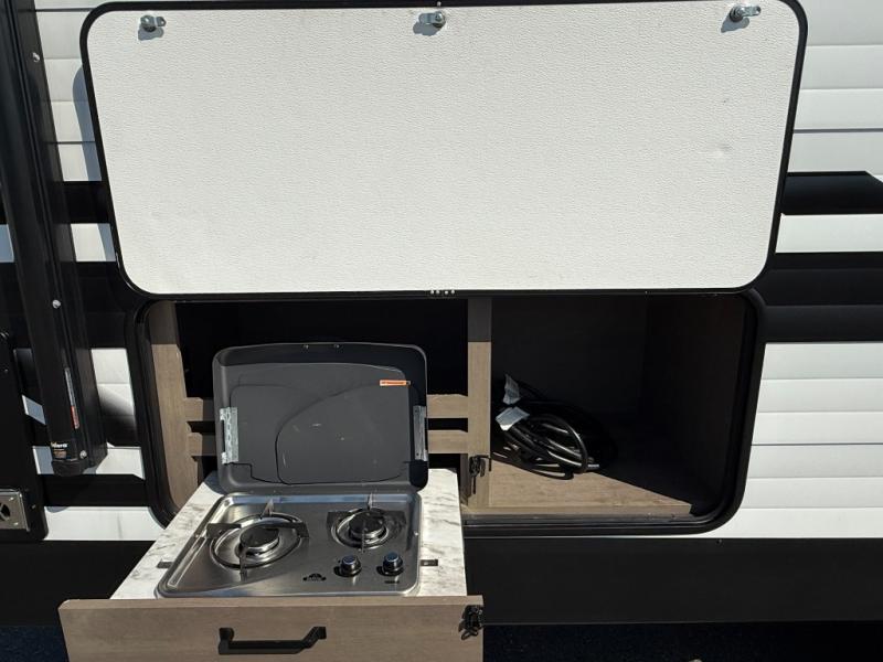 Exterior Amenities: Power slide-out, 17-ft power awning, outside kitchen with two-burner cooktop and 1.6 cu ft outdoor fridge, pet drawer, motion-sensor lighting, pass-through storage, exterior speakers, spray port, rear ladder, black tank flush, solar prep