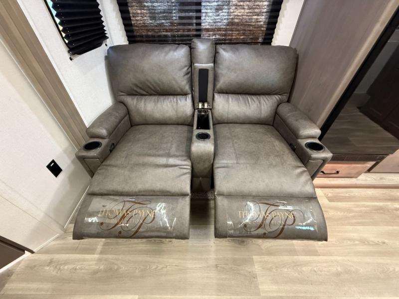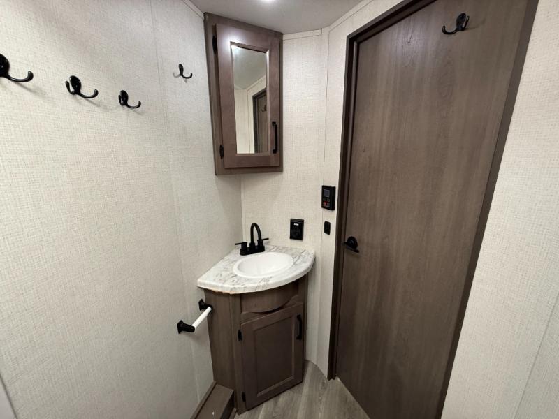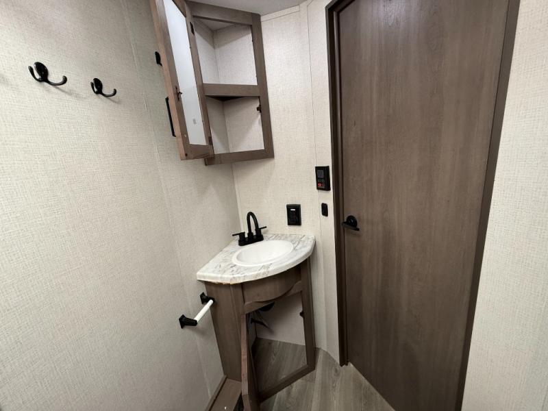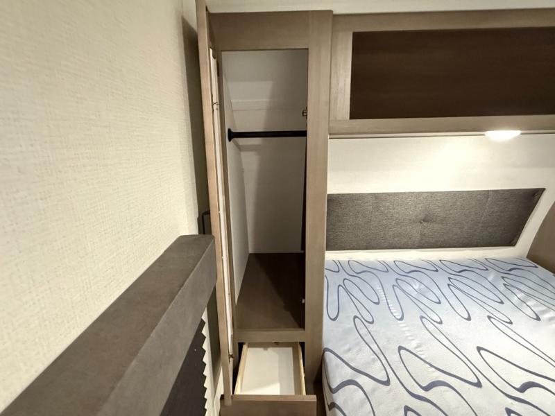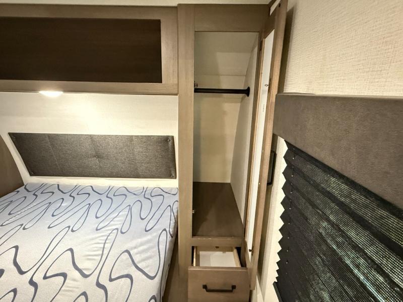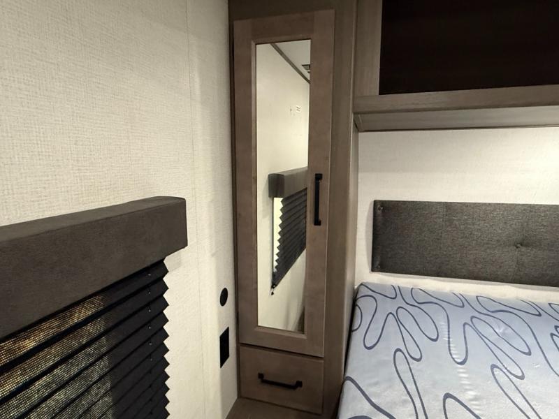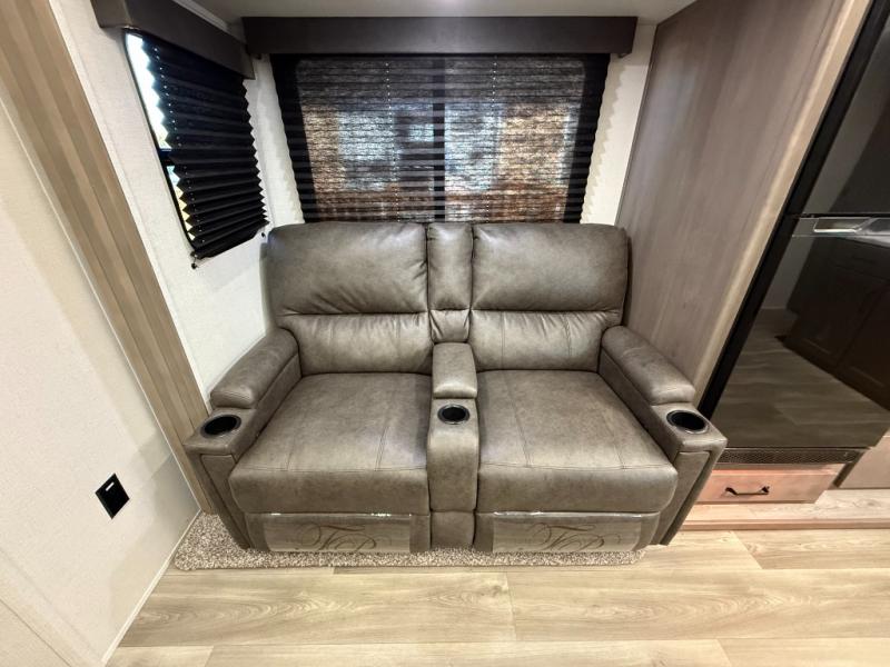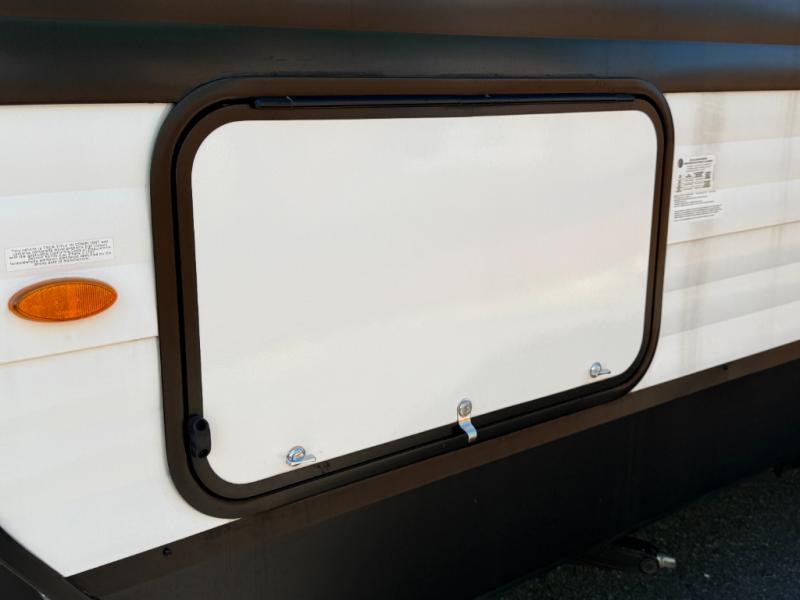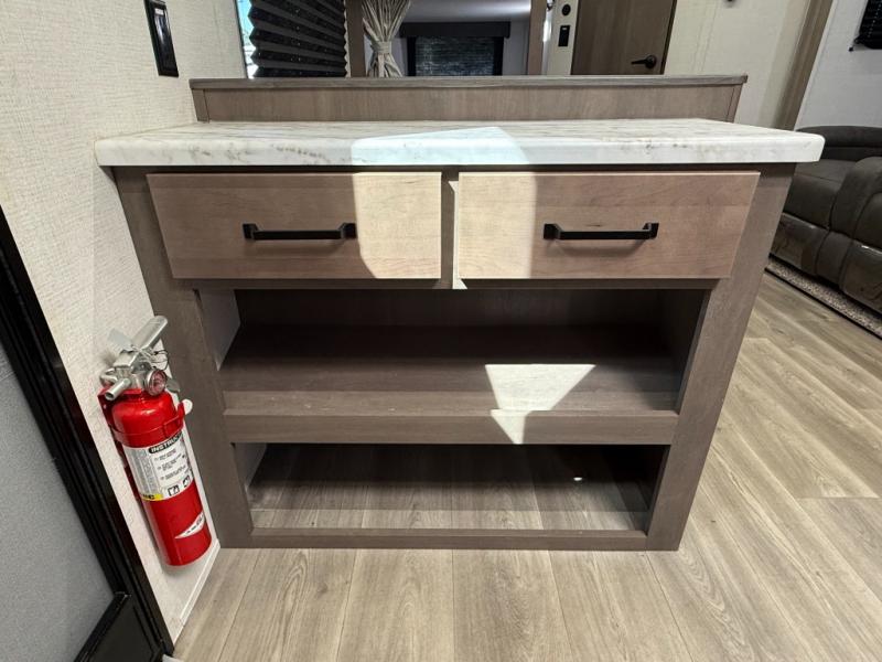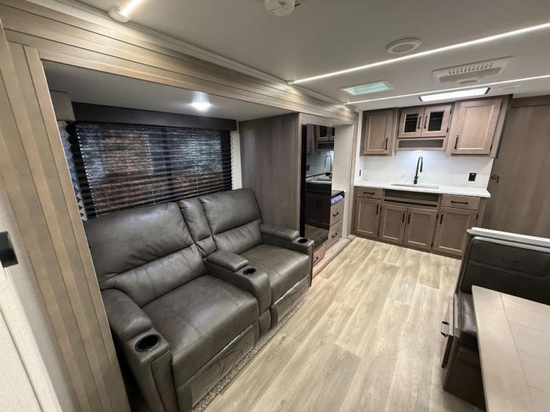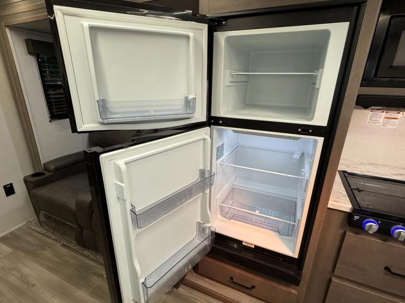 Exterior Amenities: Power slide-out, 17-ft power awning, outside kitchen with two-burner cooktop and 1.6 cu ft outdoor fridge, pet drawer, motion-sensor lighting, pass-through storage, exterior speakers, spray port, rear ladder, black tank flush, solar prep