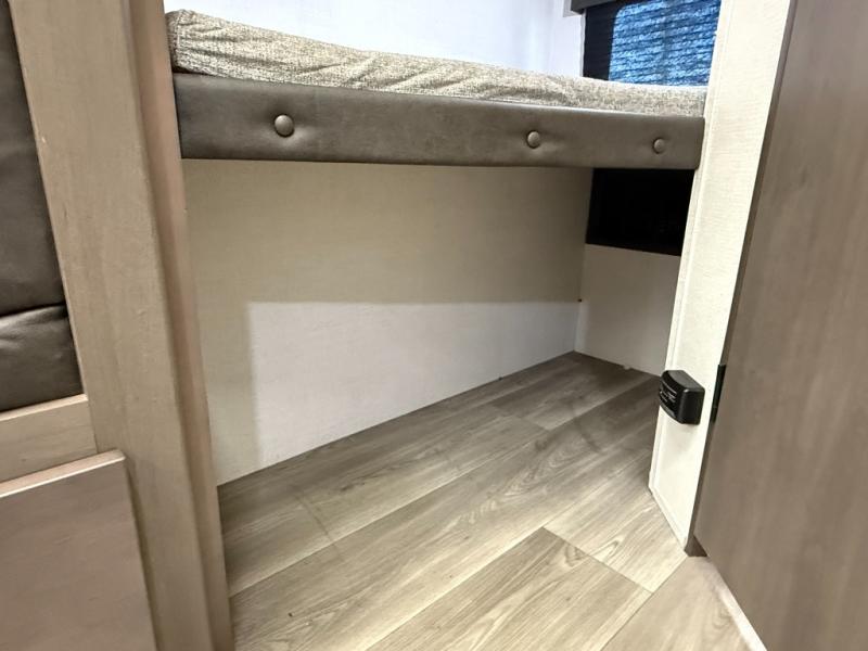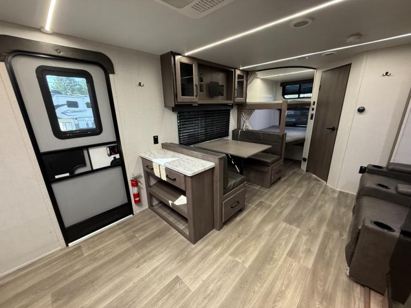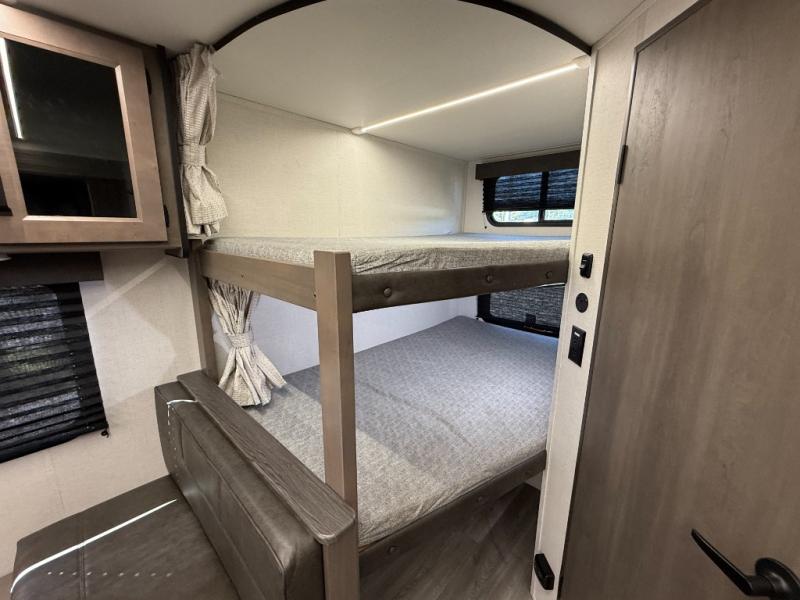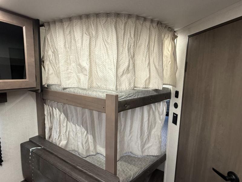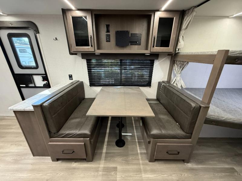 Configuration: Front queen bedroom, double bunk beds in bunkhouse, central sofa and booth dinette that convert to additional sleeping spots