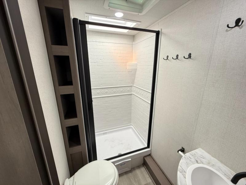 Bathroom: Rear walk-in shower (plastic/glass), toilet, sink, vent fan