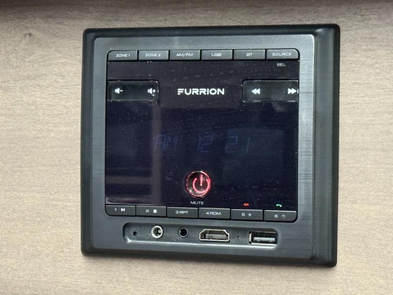 Kitchen: Mid-size 12V refrigerator (~8 cu ft), 3-burner cooktop, convection microwave, oven/stove, countertop space, Bluetooth stereo