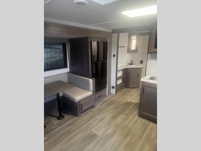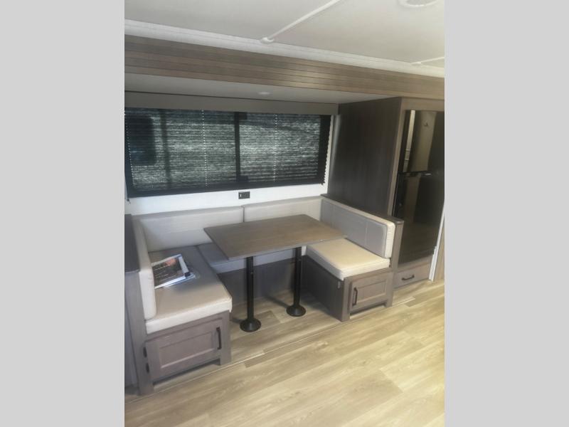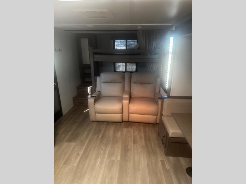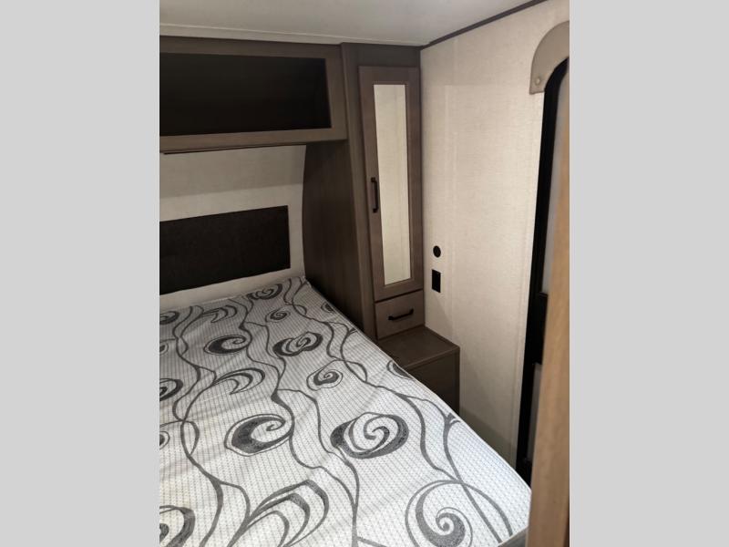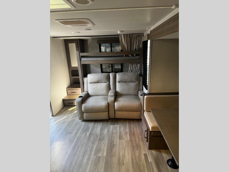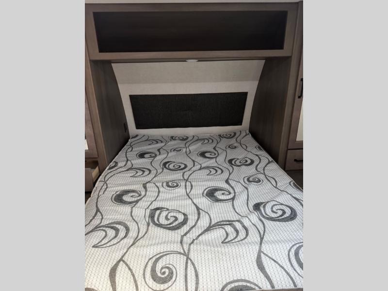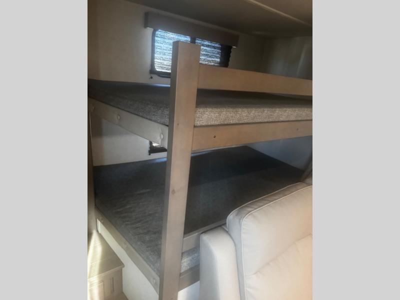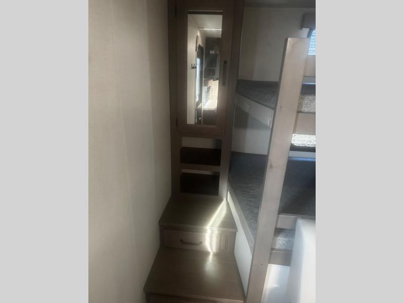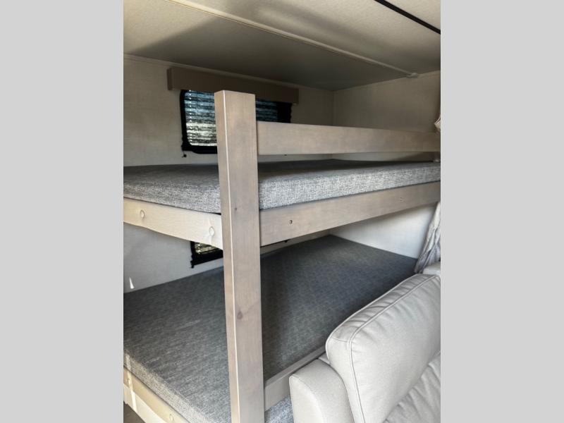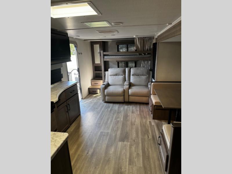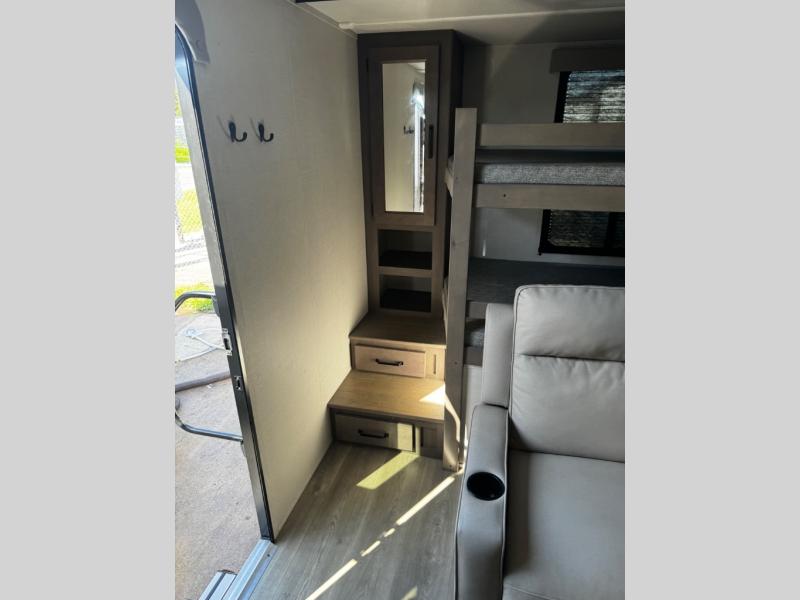 Are you ready to camp in comfort with your family or friends? This travel trailer allows you to do just that! There are double-size bunks in the back with step storage for books or board games. There is also a closet here to keep clothes wrinkle-free. The large slide features a U-Shaped dinette which is perfect for everyone to gather for a meal or games, and there is also theater seating adjacent to the slide. This model features a walk-through bath that leads to the front master bedroom. You'll love the queen bed here, overhead storage, and your own exterior entry door for convenience.