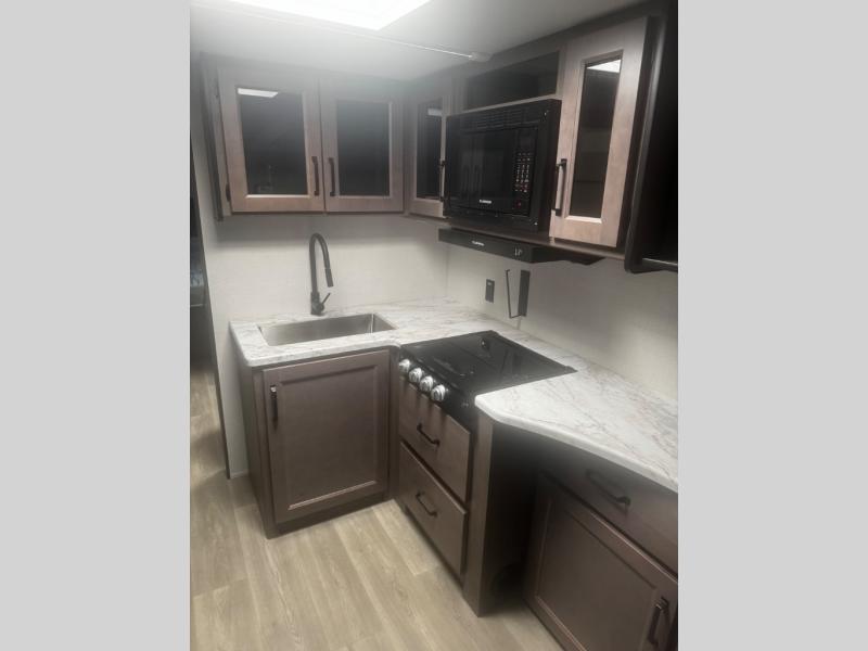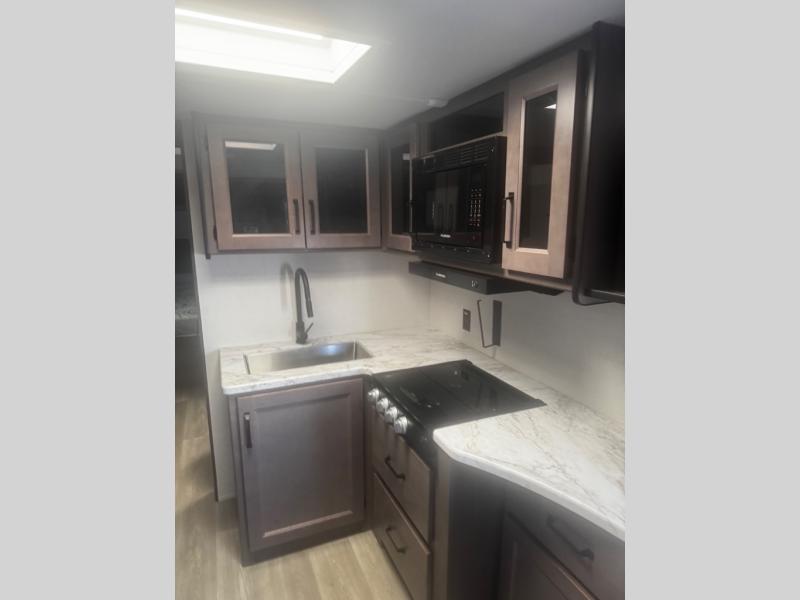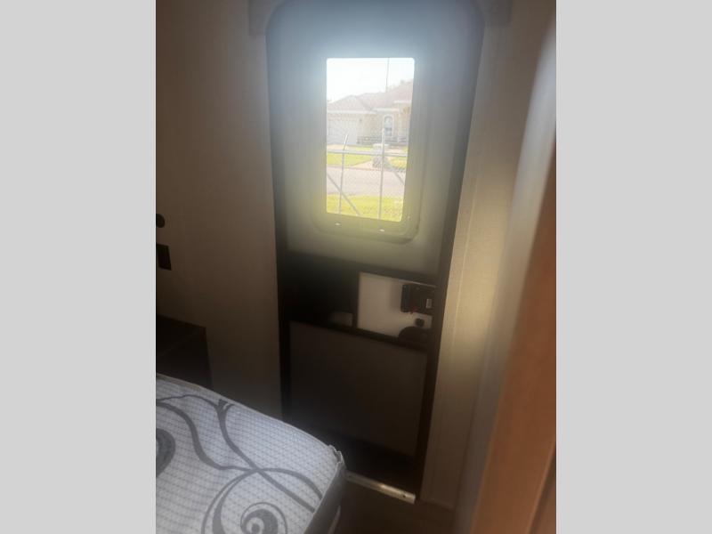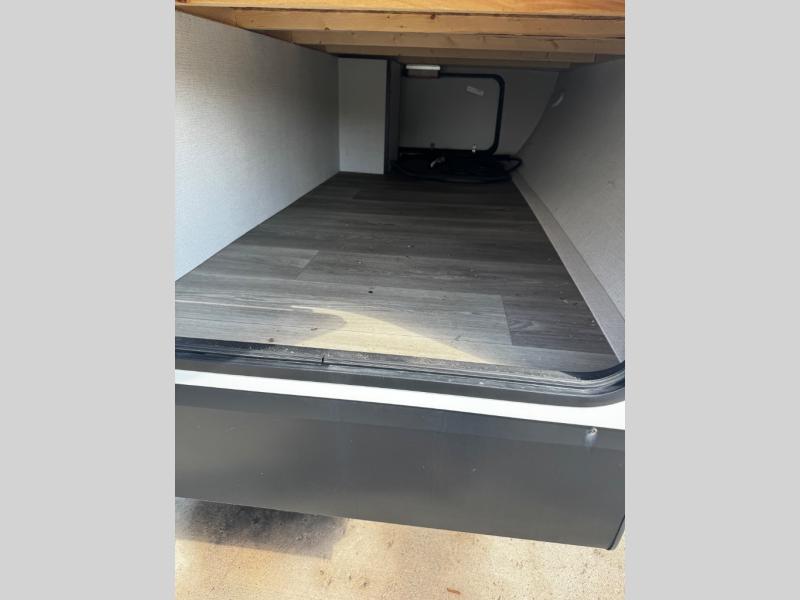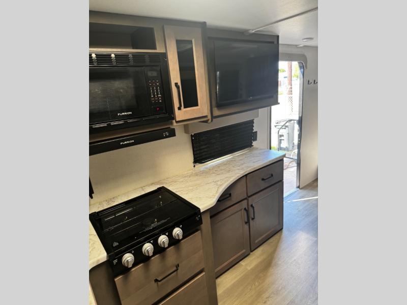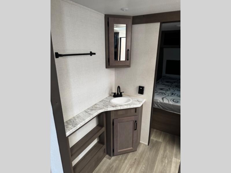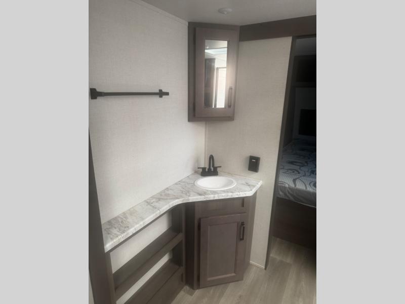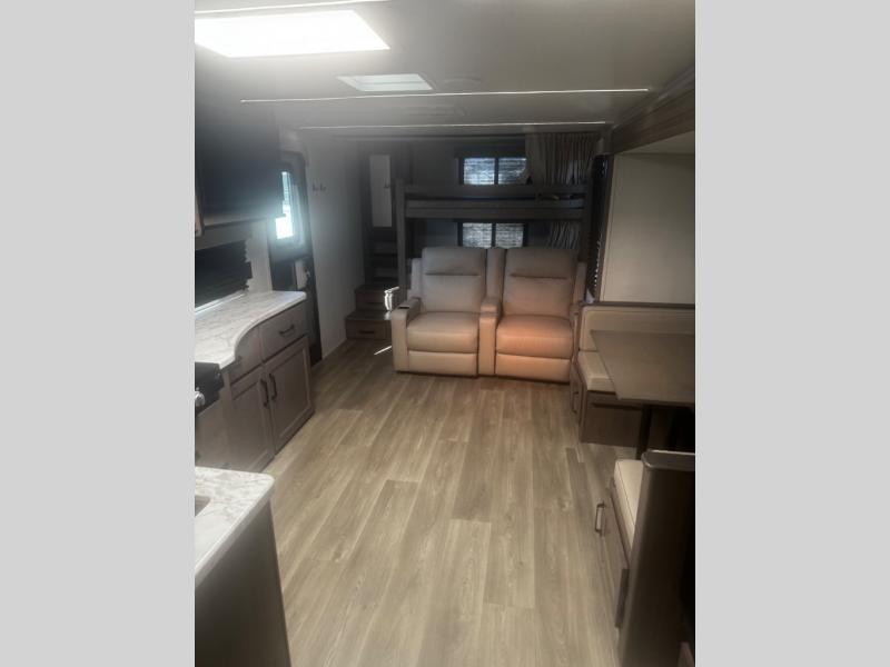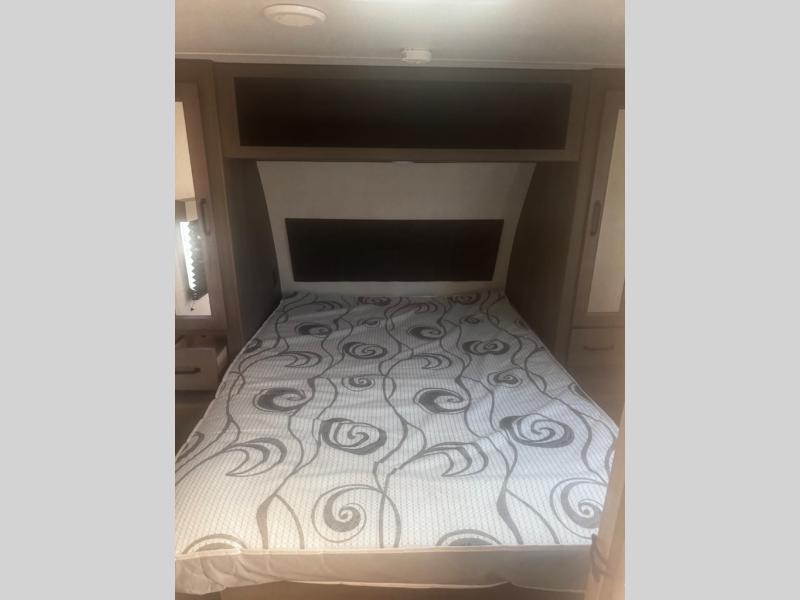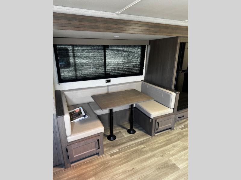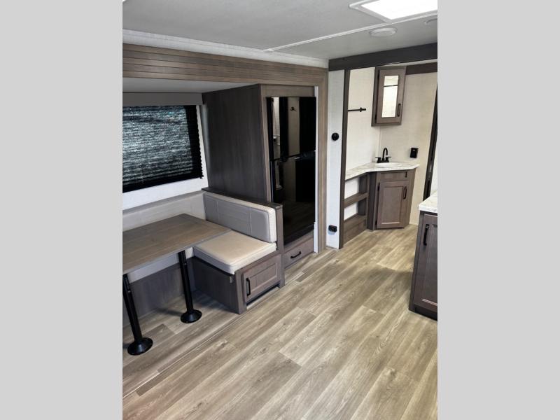 Are you ready to camp in comfort with your family or friends? This travel trailer allows you to do just that! There are double-size bunks in the back with step storage for books or board games. There is also a closet here to keep clothes wrinkle-free. The large slide features a U-Shaped dinette which is perfect for everyone to gather for a meal or games, and there is also theater seating adjacent to the slide. This model features a walk-through bath that leads to the front master bedroom. You'll love the queen bed here, overhead storage, and your own exterior entry door for convenience.