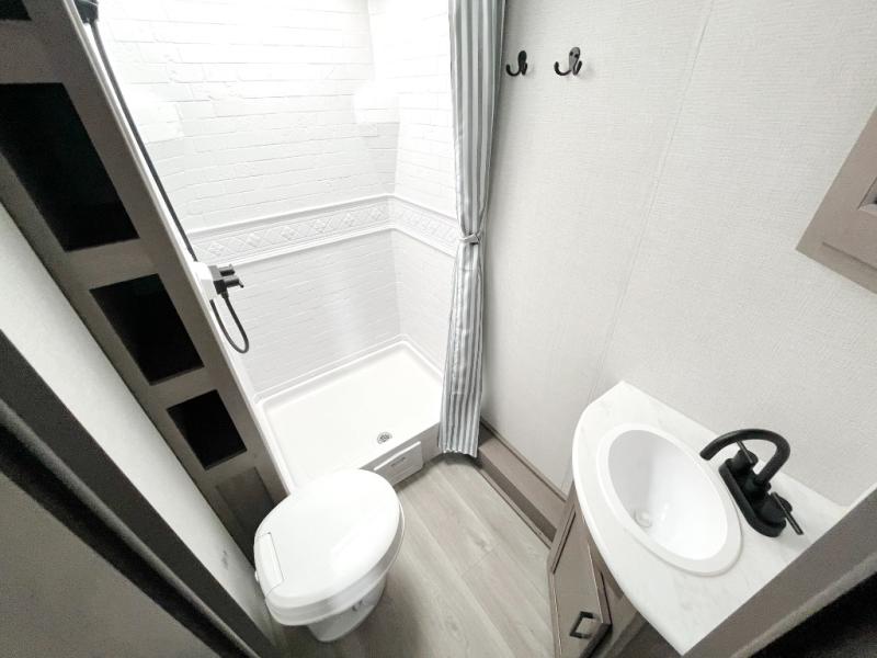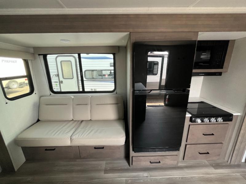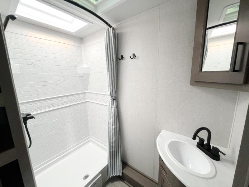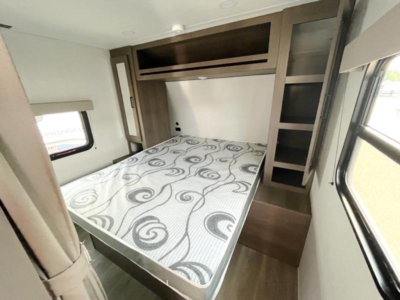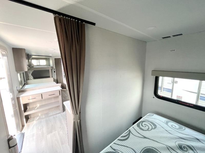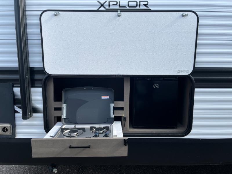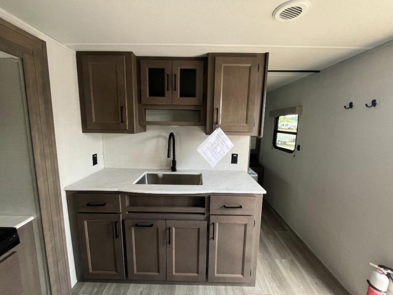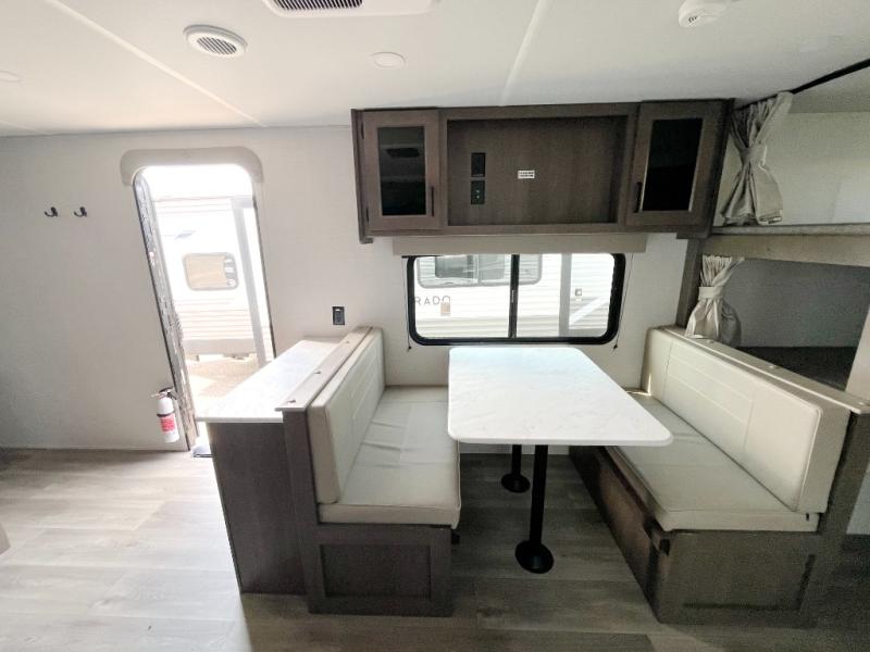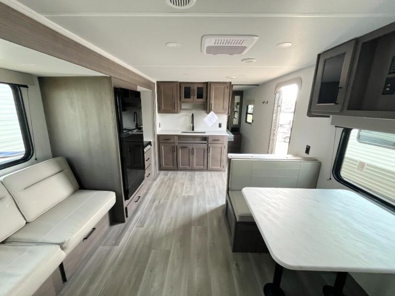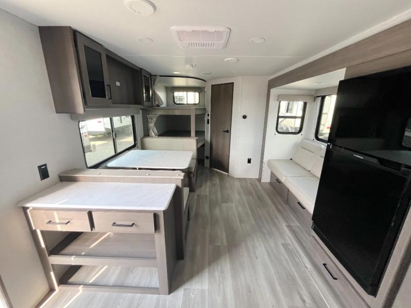 Camping with your larger family or when you want to take along a few extra friends is easy with this trailer. This unit sleeps nine with the double-size bunks in the rear corner, the 60" roll over sofa, and the queen bed in the front semi-private bedroom. The booth dinette can also be used to sleep a guest or two little ones at night once converted. Prepare your meals on the three-burner cooktop indoors, or out on the two-burner cooktop at the outside kitchen! You'll also find a handy exterior spray port, a drawer to store utensils, and an outdoor refrigerator for easy access drinks from outside! It will be so easy to fill the dog's food bowl with the added pet dish under the refrigerator, and the full bath in this model means you don't have to use the camp's facilities. Having a 17' awning outside along with a large unobstructed pass-through compartment allows you extended living outdoors and plenty of space for all of your gear!