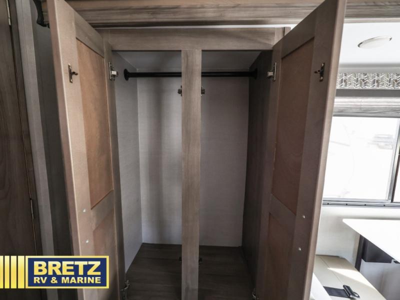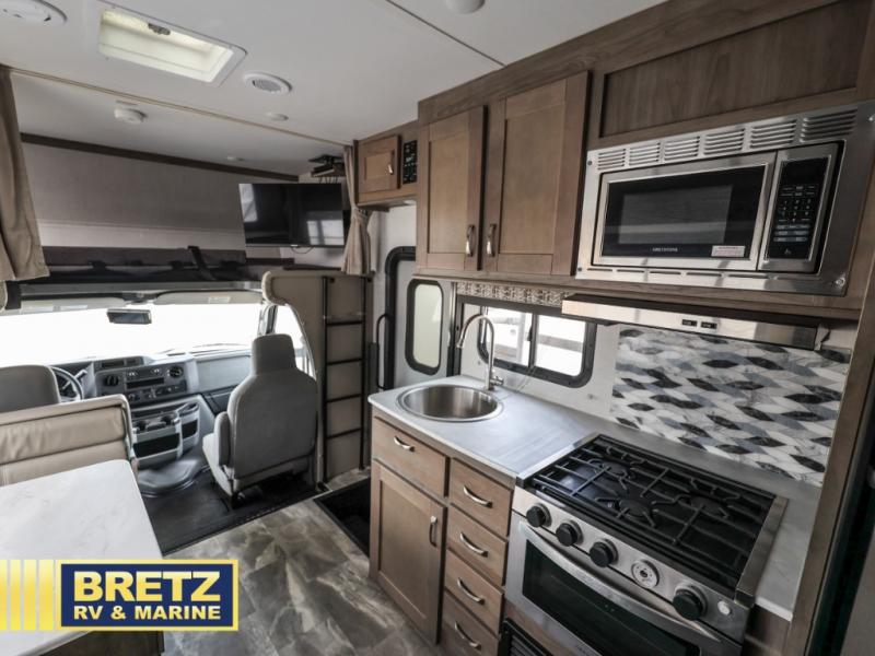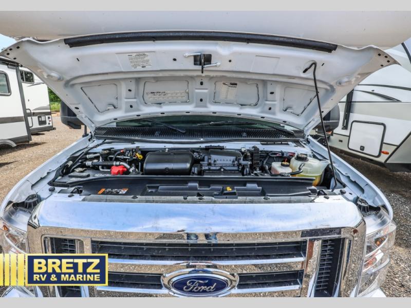 If you enjoy traveling the countryside during the day and pulling off into your favorite campground at night, then check out the comfortable accommodations this motorhome has to offer. For your group of five, you will have enough sleeping space between the RV queen bed in the rear, the overhead bunk above the cab, and the booth dinette. The kitchen provides everything you will need to cook all your meals and store leftovers, plus the dinette allows you to eat inside without worrying about bugs swarming you. The electric awning offers another living space outdoors, and it comes with LED lights so that you can party with the neighbors.