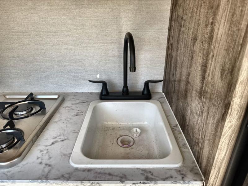 You and your spouse will have a great time in the woods with this teardrop trailer! Get a good night's rest each night when you set up the 76" x 54" bed and relax on it as a sofa during the day. There are hookups for an optional TV too and storage shelves to keep your items out of the way. The exterior kitchen has everything you need to prepare delicious home cooked meals like a gas/electric refrigerator, a microwave oven, a hot/cold sink, and a two burner gas cooktop to fry up the catch of the day. You even have an outside shower to rinse the mud off your feet!