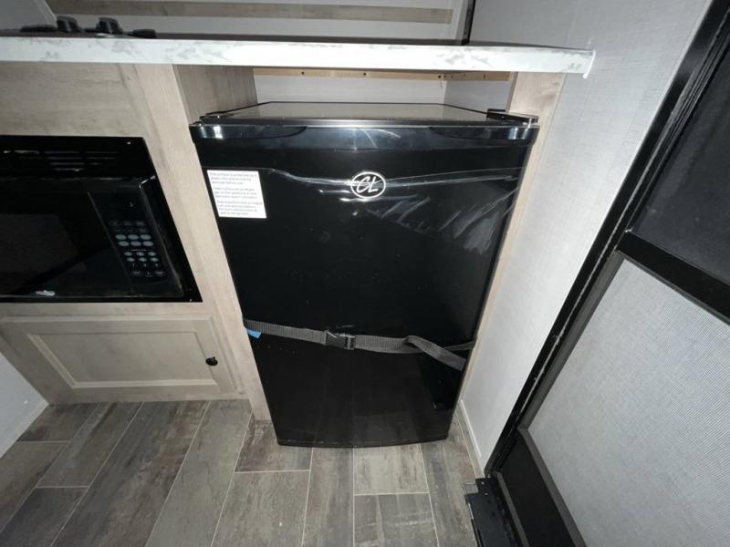 This teardrop trailer offers versatility! The rear U-shaped dinette is not only great for enjoying meals and playing games, but also for transforming into a bed to get a good night's rest. You can use the exterior 36" x 11" trunk for your outdoor gear and the overhead cabinets inside. After a fun day outside, head to the front corner bathroom to freshen up in the wet bath with a sliding door. The kitchen has everything you need to prepare delicious home cooked meals like a gas/electric under counter refrigerator, a microwave oven, a hot/cold sink, and a two burner gas cooktop with a glass cover to fry up the catch of the day. You even have an outside shower to rinse the mud off your feet!