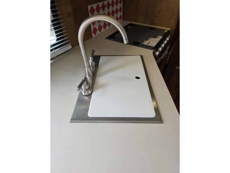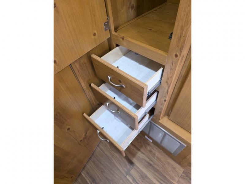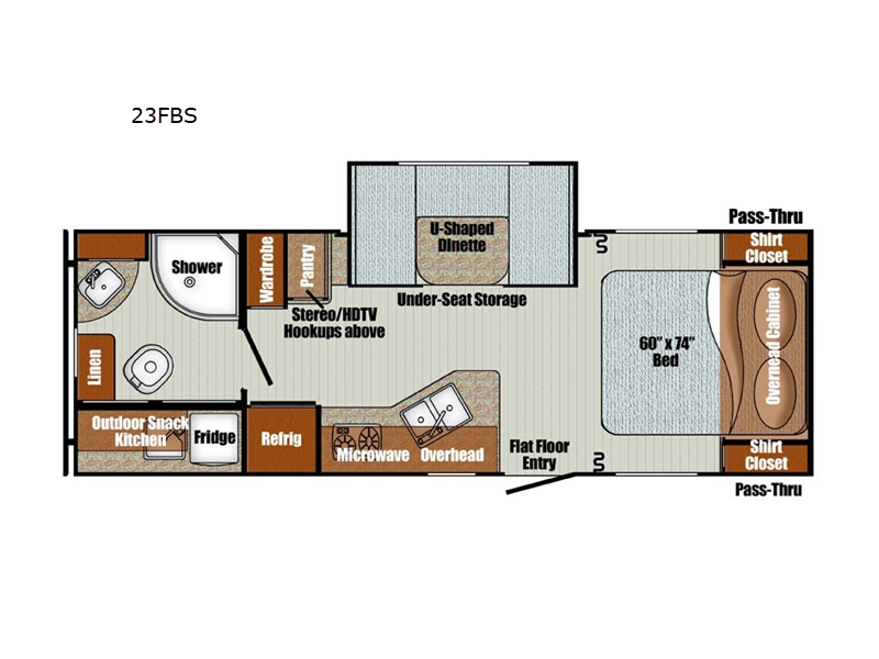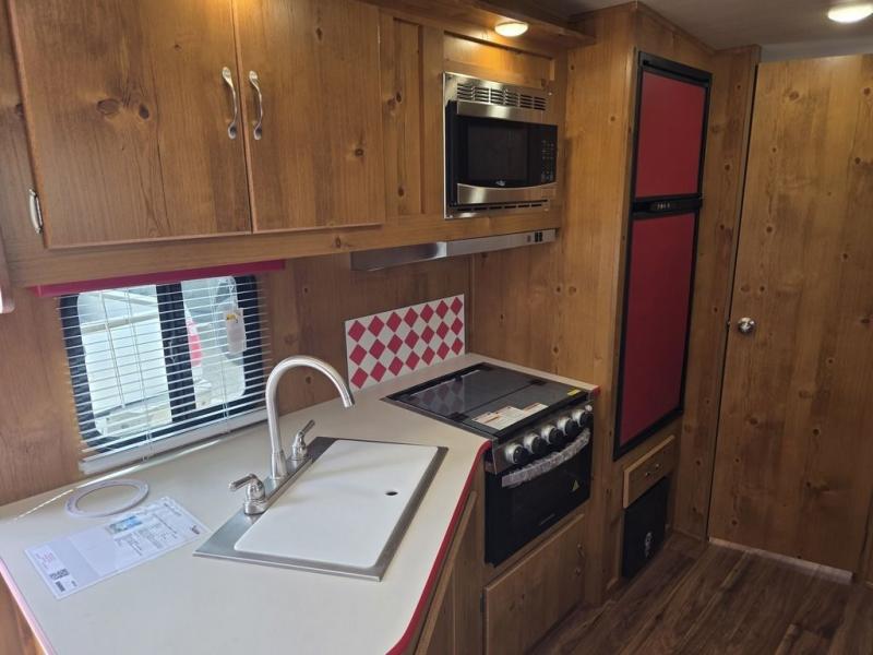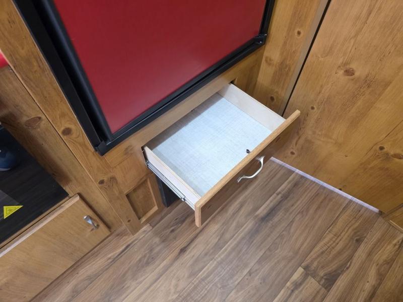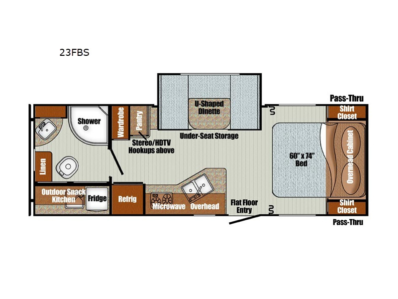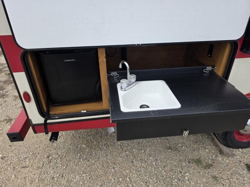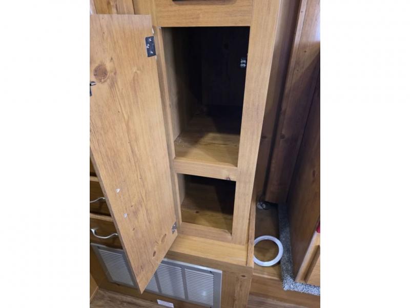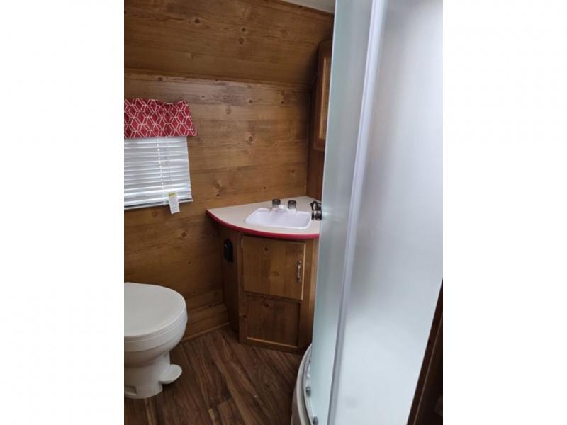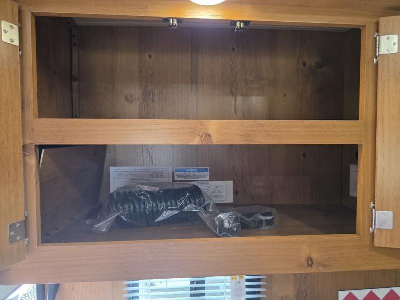 Camping trips to the lake are made complete in this roomy travel trailer for four. The U-shaped dinette slide out will provide the chef more space to cook on the cooktop. You will appreciate having your own RV queen bed up front, plus dual shirt closets and a curtain for privacy. This model also includes an exterior pass-through storage, an electric awning with LED lights, plus an outdoor snack kitchen with a sink and a refrigerator to entertain guests!