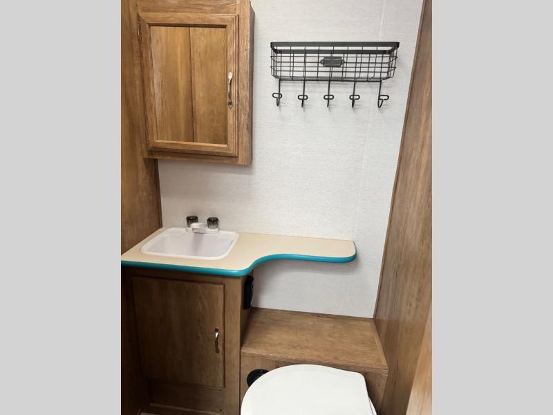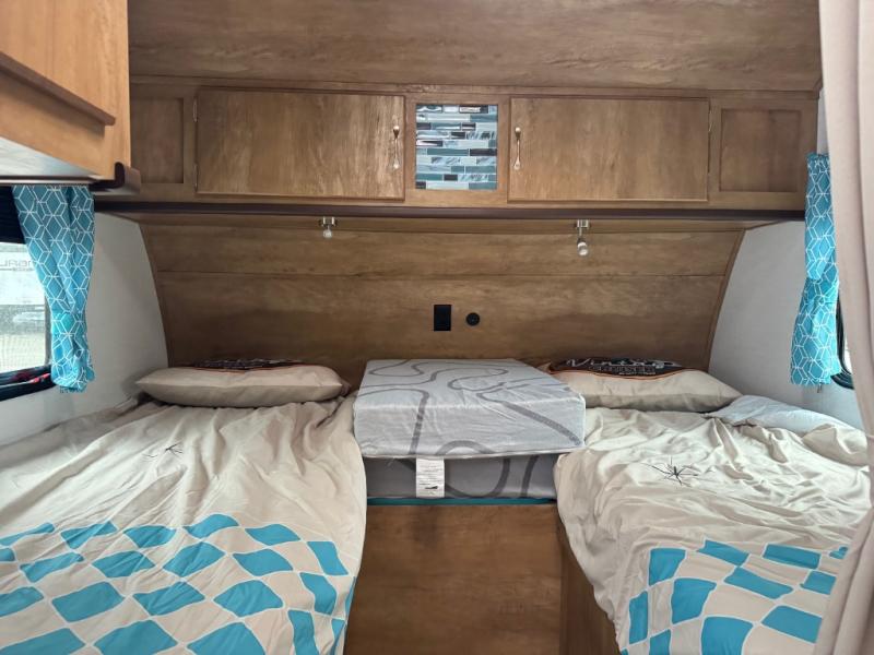 Step into comfort with this classic travel trailer in tow. You will find a rear vintage booth dinette and a sofa slide out with end tables to set your drinks on. The kitchen is complete with a microwave oven, cooktop, plus overhead cabinets for your belongings. After a day outdoors, you can clean up in the 24" x 36" shower, and there is a private toilet and sink across the hall if someone needs to use it while you're cleaning up. In the front bedroom you'll find twin beds with an insert to convert them into a king-size bed, plus dual shirt closets. How convenient!