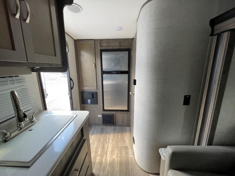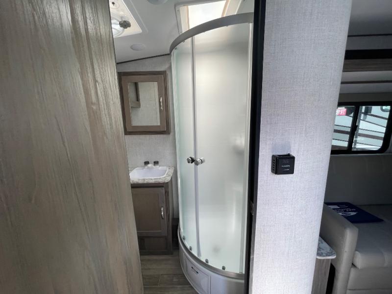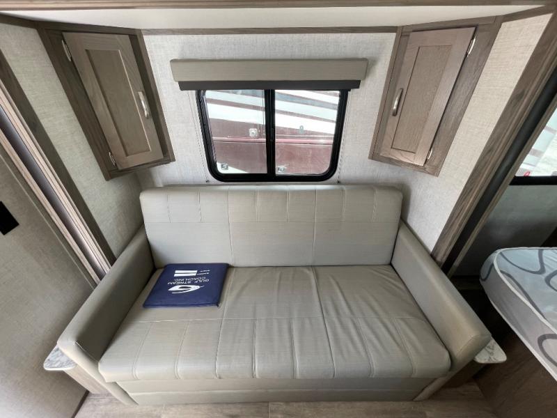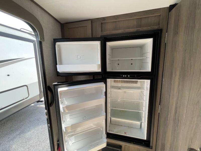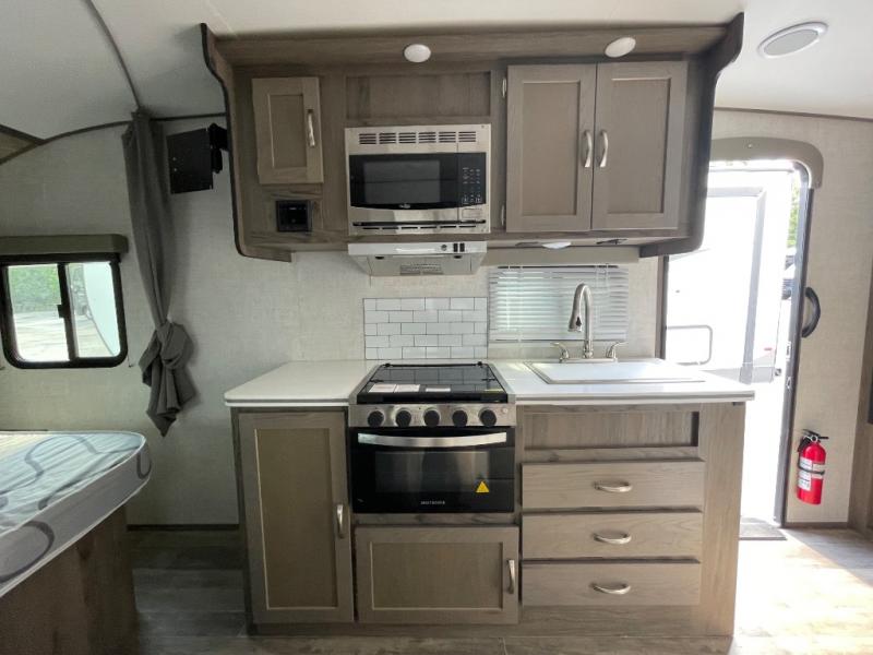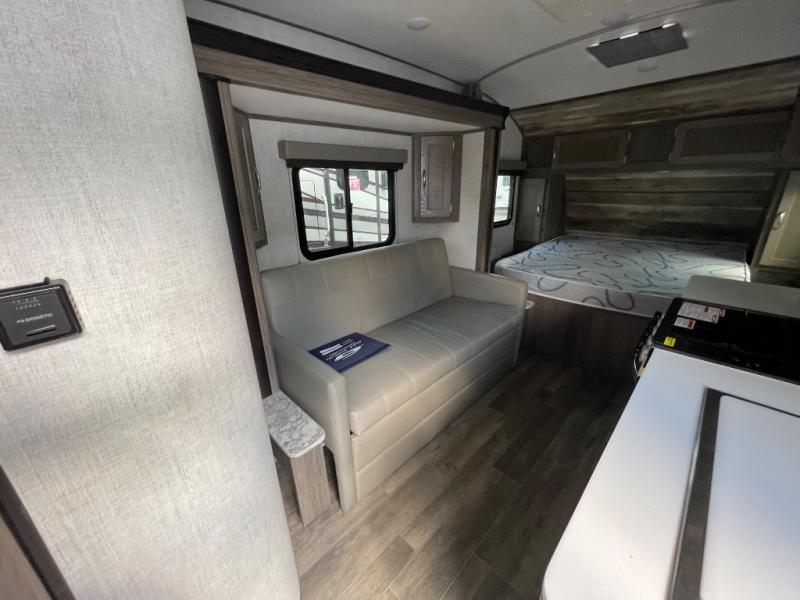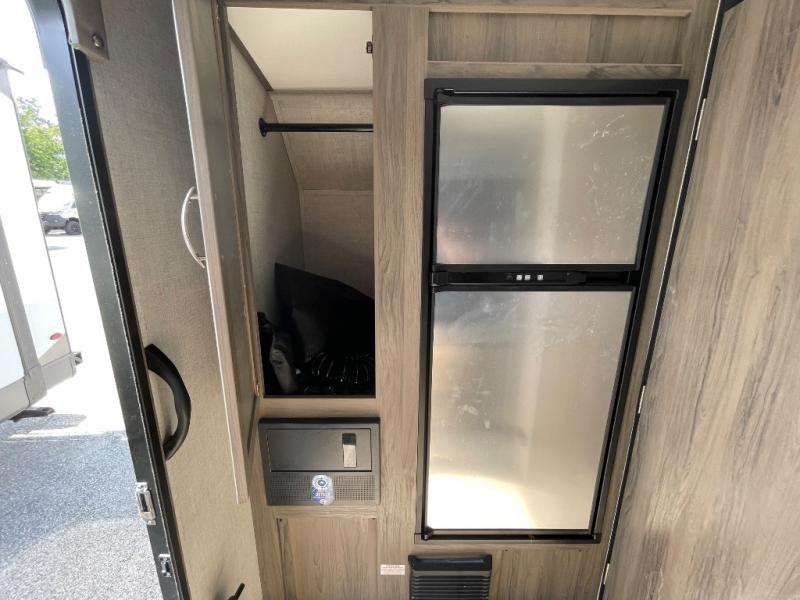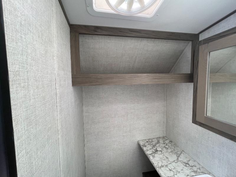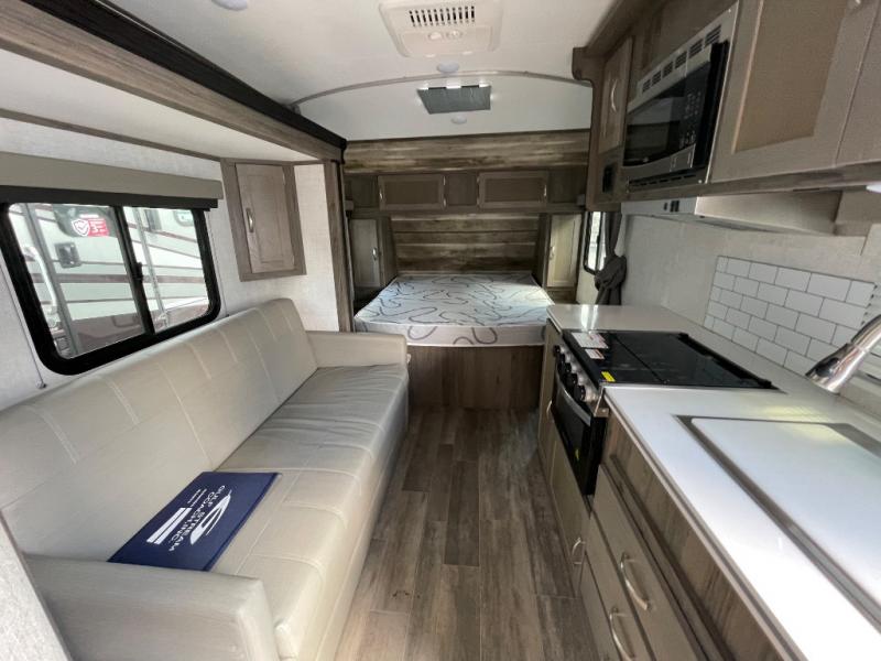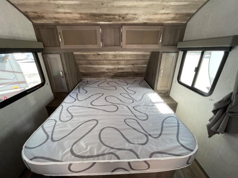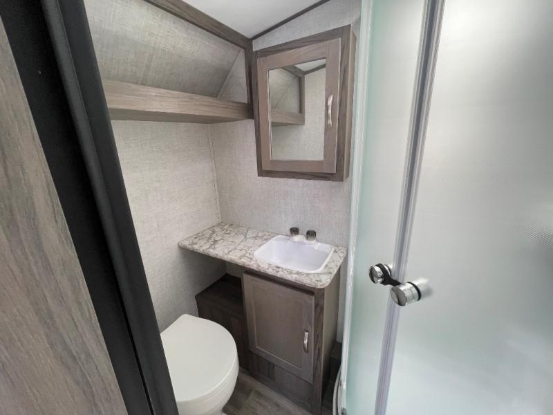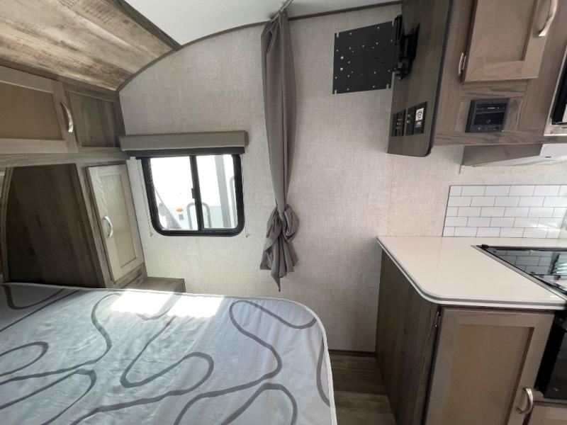 You will have everything in this travel trailer for a comfortable weekend getaway! You will start each morning feeling refreshed after sleeping on the front queen bed with shirt closets on either side and a TV mount location diagonal from it. After you take a nice, hot shower in the rear corner bathroom, head to the 8 cu. ft. 12V refrigerator and grab some bacon to fry up on the three burner cooktop. The sofa bed slide has a 60" folding table for you to enjoy your meals, and can transform into an extra sleeping space for a guest or two little ones. Don't leave any of your favorite snacks behind either when you can store them inside the pantry/closet near the entrance!