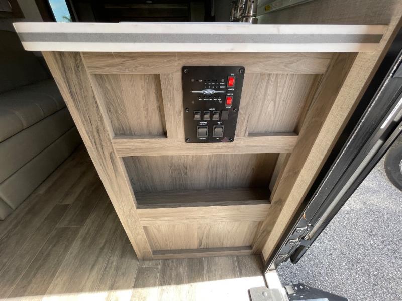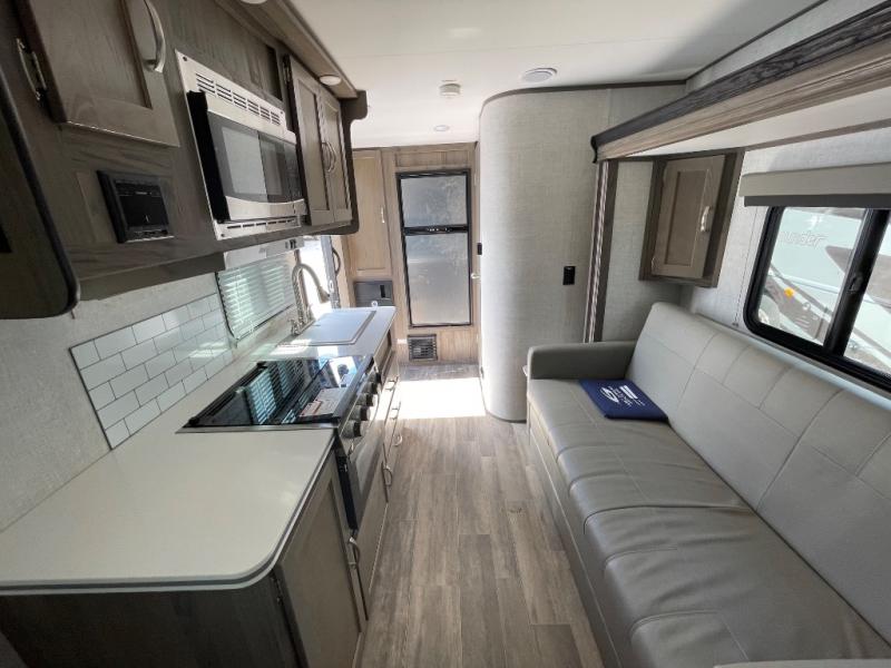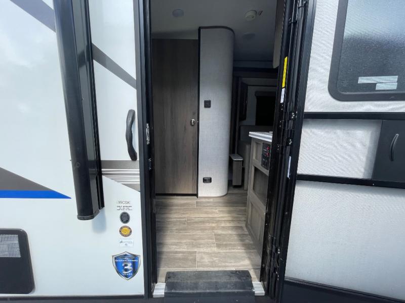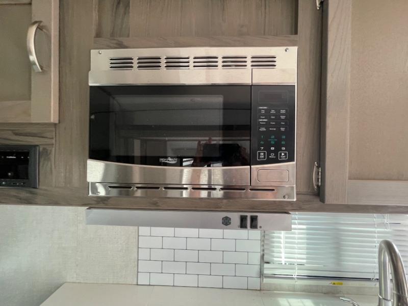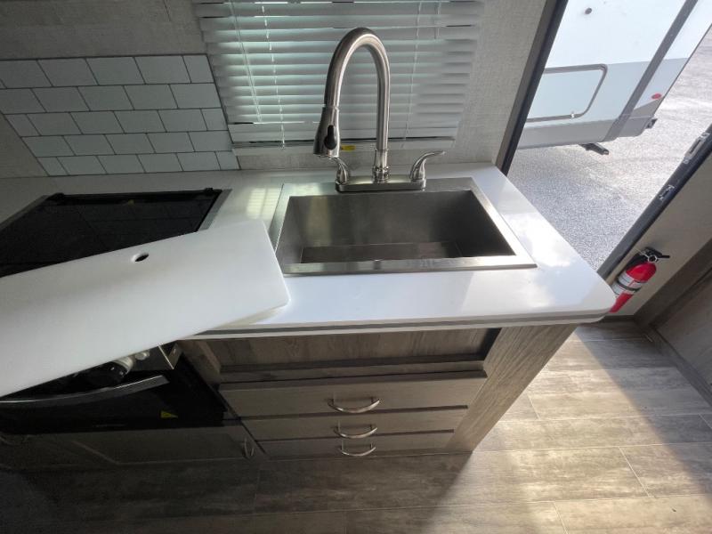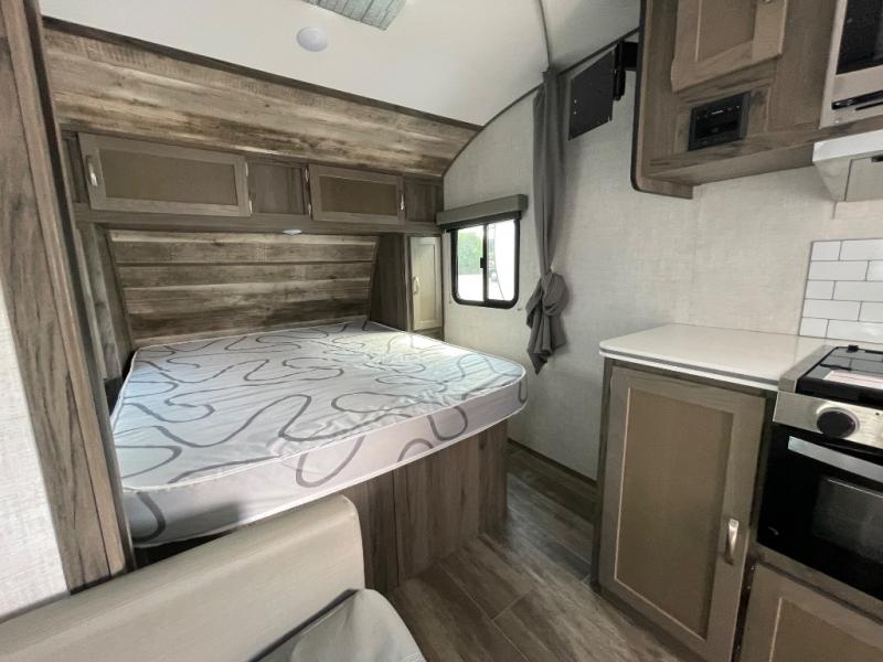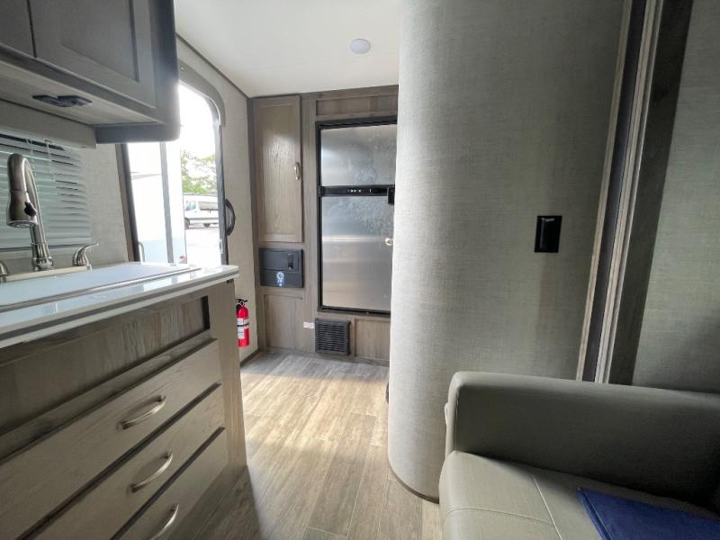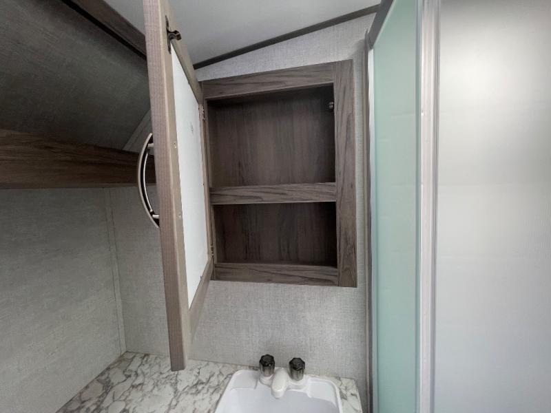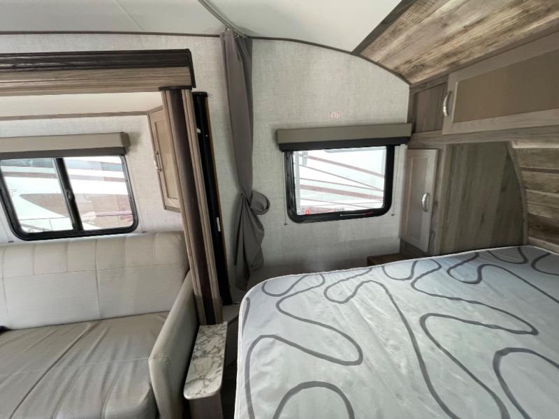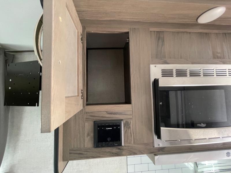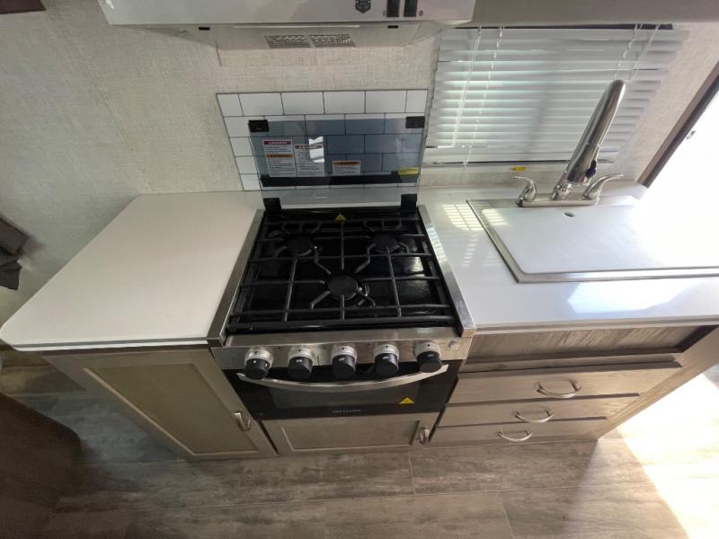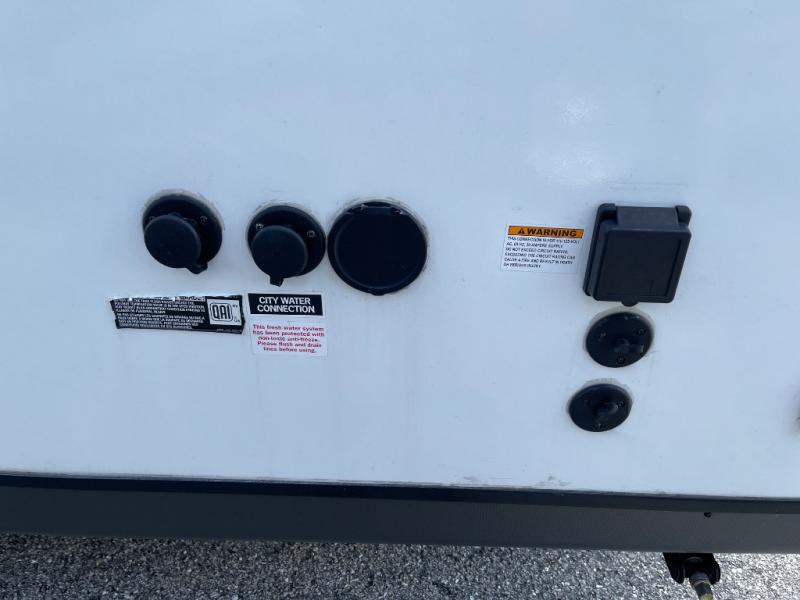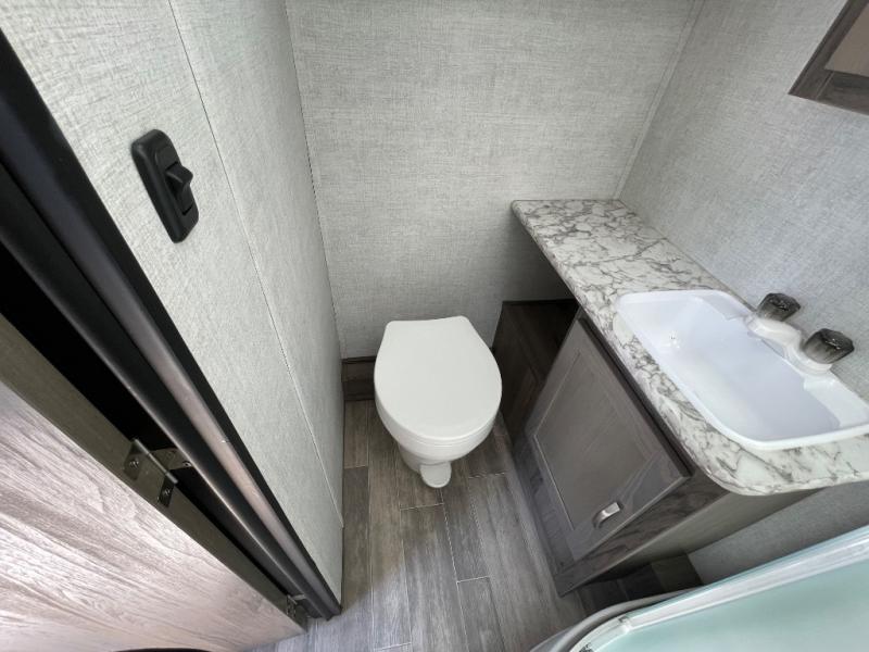 You will have everything in this travel trailer for a comfortable weekend getaway! You will start each morning feeling refreshed after sleeping on the front queen bed with shirt closets on either side and a TV mount location diagonal from it. After you take a nice, hot shower in the rear corner bathroom, head to the 8 cu. ft. 12V refrigerator and grab some bacon to fry up on the three burner cooktop. The sofa bed slide has a 60" folding table for you to enjoy your meals, and can transform into an extra sleeping space for a guest or two little ones. Don't leave any of your favorite snacks behind either when you can store them inside the pantry/closet near the entrance!