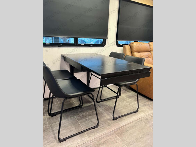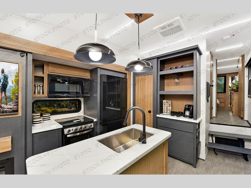 You won't even feel like you're camping in this fifth wheel! The front master suite has a 72" x 80" king bed slide across from a dresser and next to an area prepped for a washer and dryer, plus there is a front dresser with wardrobes on either side and even an entrance into the dual entry bathroom. The bathroom has a radius shower to freshen up in each morning and a lighted mirror to make it easier for seeing as you get ready. The chef will have a great time preparing their best meals in the kitchen with the kitchen island, 16 cu. ft. refrigerator big enough for their favorite ingredients, a 22" oven to cook fresh cinnamon rolls, and a 30" over the range microwave to pop a bag of popcorn on movie night. Relax in true comfort in the rear living area on the residential furniture with hidden cup holders and USB charging ports by the electric fireplace with hidden storage!