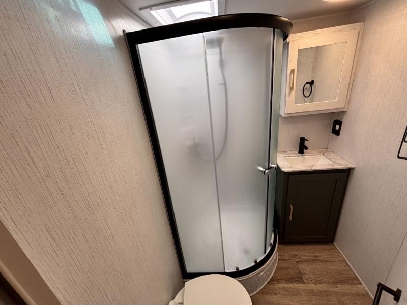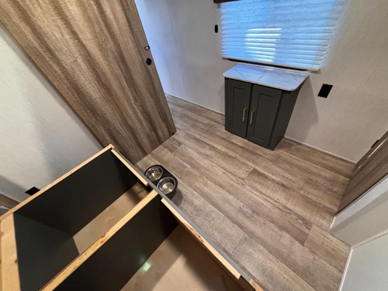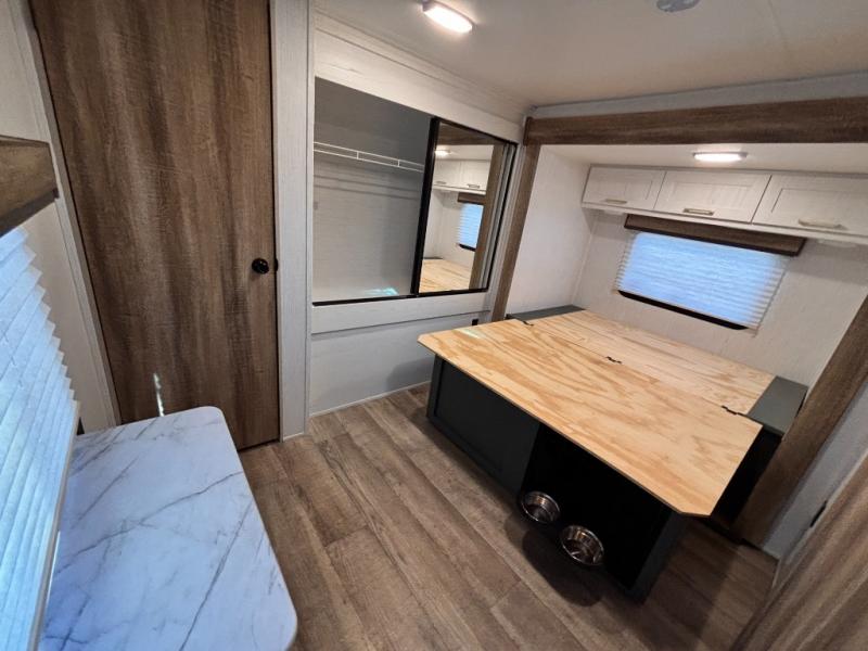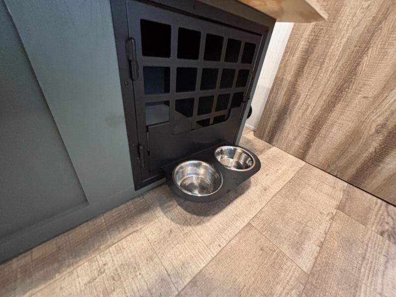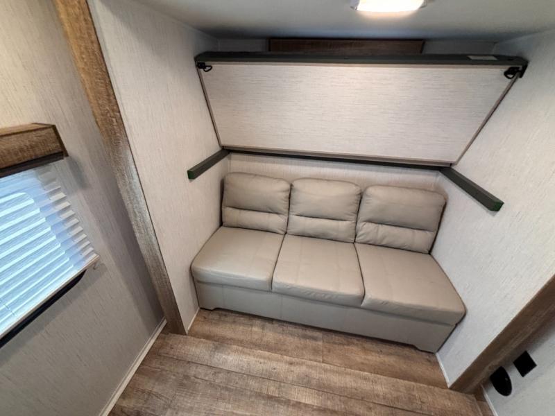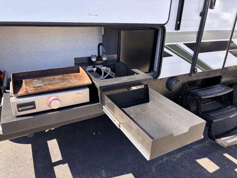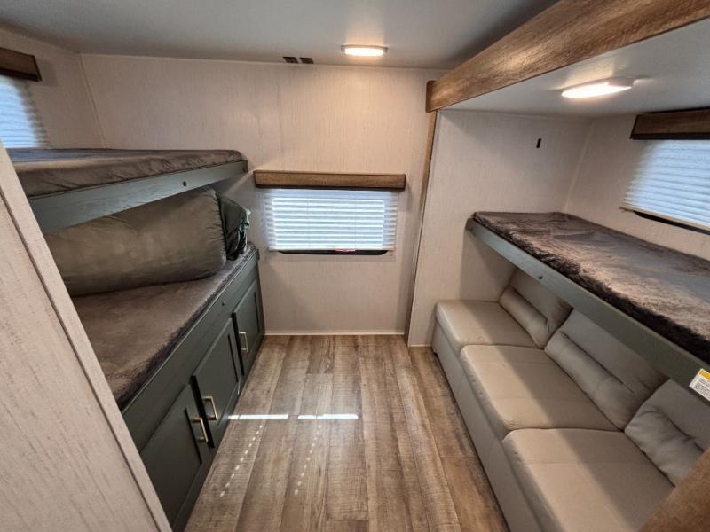 There is convenience found all throughout this travel trailer! Starting with the dual entry doors with one of them leading directly into the half bathroom. The kiddos will have their own privacy with the rear private bunkhouse which has a set of bunk beds and a slide with a bunk bed over a sofa. You will enjoy your own privacy with the front private bedroom that has a queen bed slide across from a dresser, a sliding barn door, a front large wardrobe and even a closet that is prepped to add a washer and dryer to it. Meals can be made easy with the fully equipped kitchen which even has an air fryer oven, plus you can cook meals while breathing in fresh air with the outdoor kitchen. Everyone can gather together at the booth dinette for meals, games, and even transform it into an extra sleeping space. The sofa is a great place to wind down at night by the entertainment center with a 39" TV and fireplace!