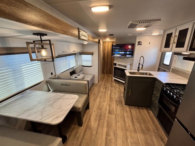 Each one of these Heartland Eddie Bauer travel trailers were crafted with the purpose of fully embracing the adventurous lifestyle! The aluminum wheels enhance the visual appeal while also providing a smoother ride. With an EZ button setup that includes front jack, stabilizing jack, and awning, you have simplified preparations arriving at your camping spot. These units will cut through the wind and save on fuel with their superior aerodynamics, as well as provide additional storage for your gear. The ultra-smooth sided aluminum sidewalls have a .030 thickness which surpasses the competitors in exceptional strength and durability. Come find your favorite one today!