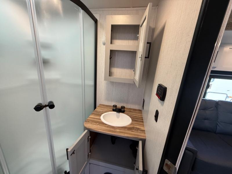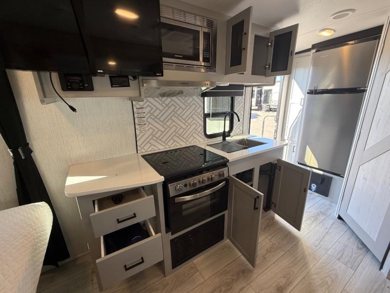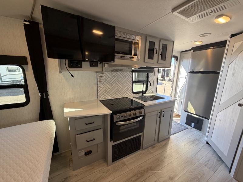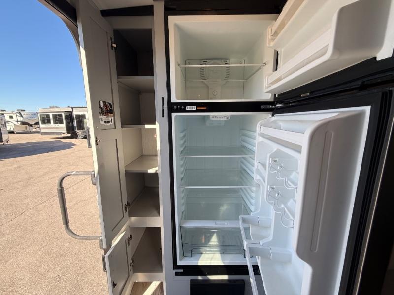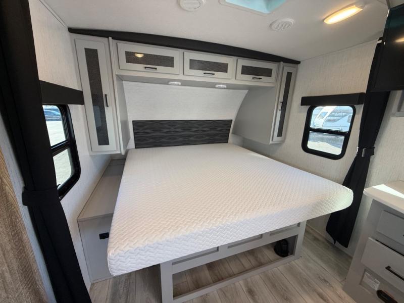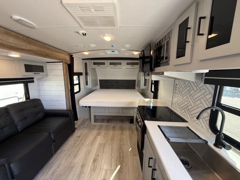 This is the perfect couple's trailer for your weekend excursions. You will love having your own king bed up front that also includes a privacy curtain. The sofa with a stowaway table will provide a place to dine at each day, and an overnight guest can sleep here as well. You'll find a three burner cooktop and a microwave oven in the kitchen, as well as a stainless steel sink and a pantry for snacks. After dinner, head outdoors to relax under the 12' power awning LED lights before turning in for the night.