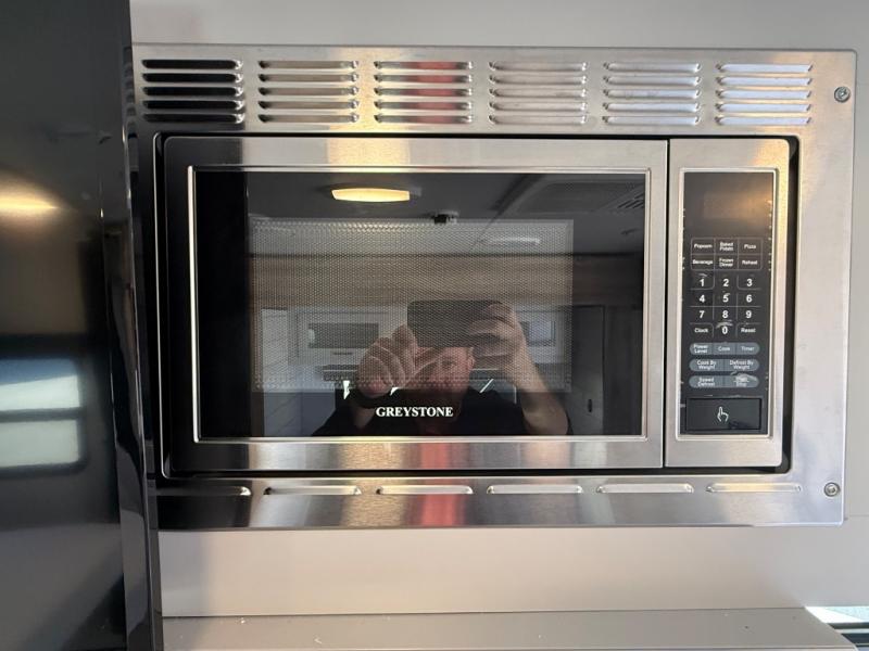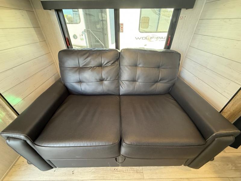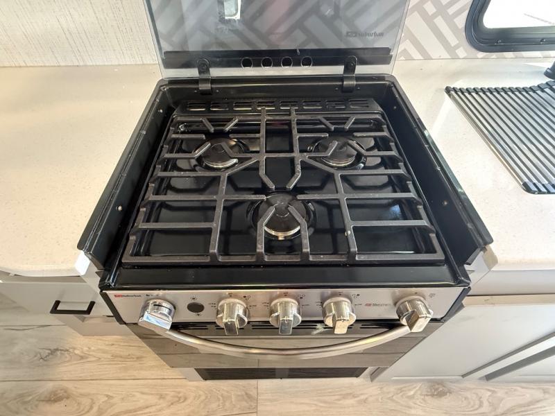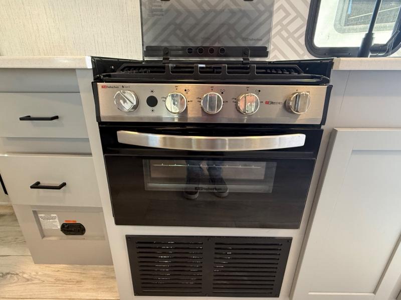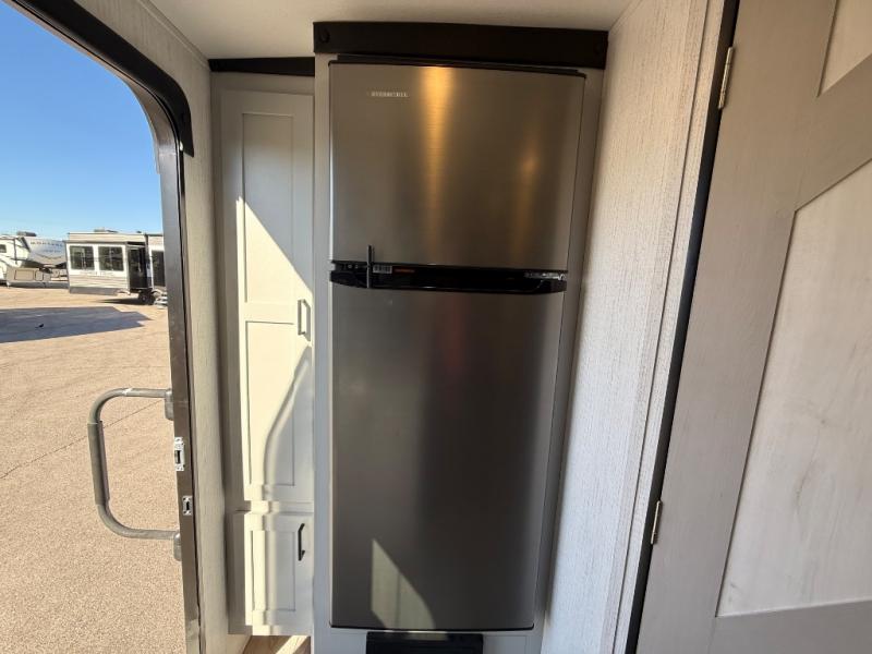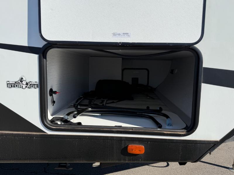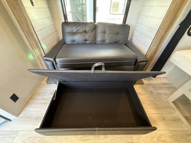 This is the perfect couple's trailer for your weekend excursions. You will love having your own king bed up front that also includes a privacy curtain. The sofa with a stowaway table will provide a place to dine at each day, and an overnight guest can sleep here as well. You'll find a three burner cooktop and a microwave oven in the kitchen, as well as a stainless steel sink and a pantry for snacks. After dinner, head outdoors to relax under the 12' power awning LED lights before turning in for the night.
