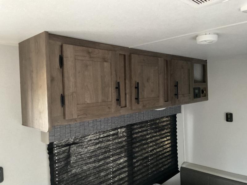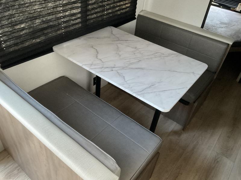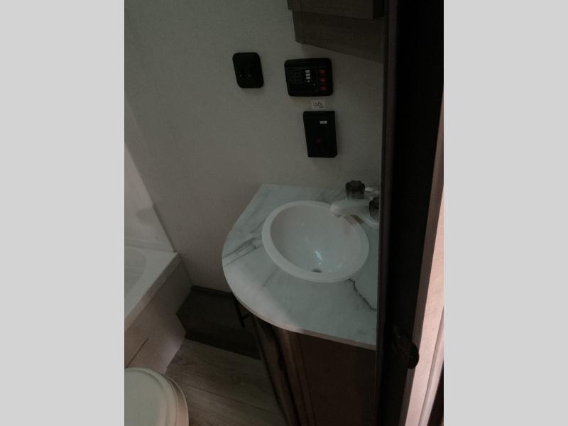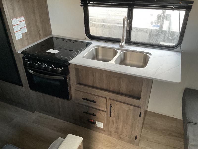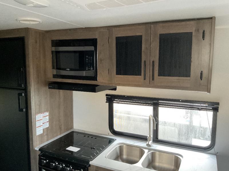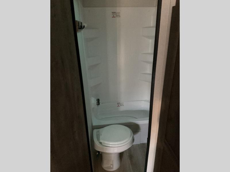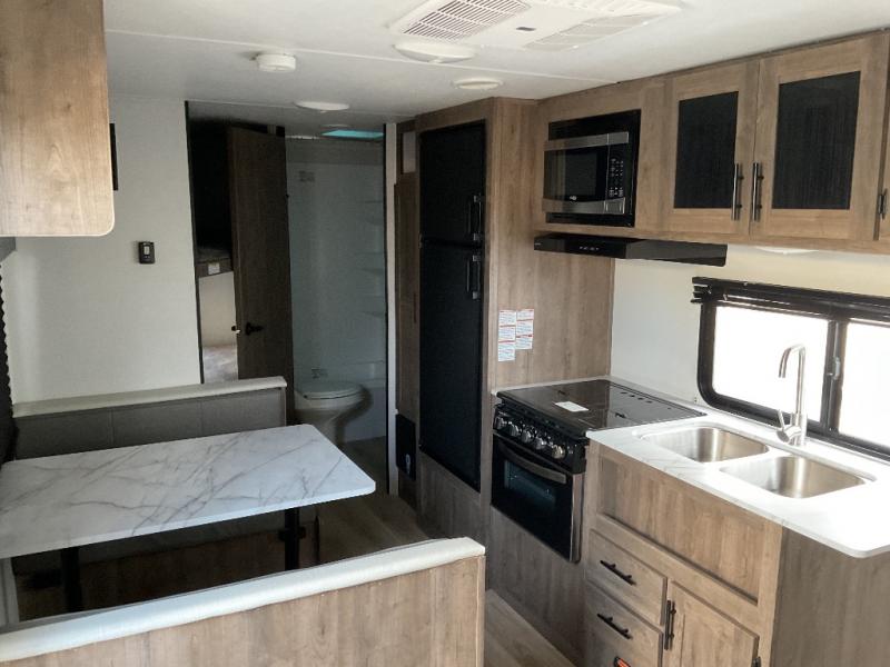 Dual entry doors make it easy to load and unload each trip as well as sneak out the bedroom entry to see the sunrise before others are awake! The spacious interior offers two chairs and a table in between along the rear with a large window for natural lighting and great views when sitting on the sofa or the U-shaped dinette slide out. And the cook will love having a view out of the rear window and all the appliances nearby when feeding everyone. When it is time to call it a night, the full bathroom is available to get cleaned up in before putting on your pajamas, plus the front bedroom offers a space saving sliding door, a walk-around queen bed, clothing storage and more windows.