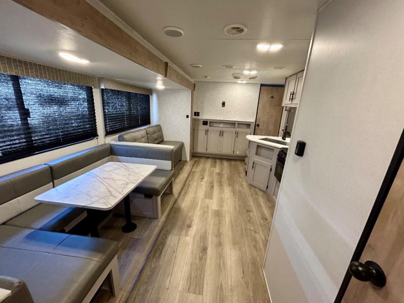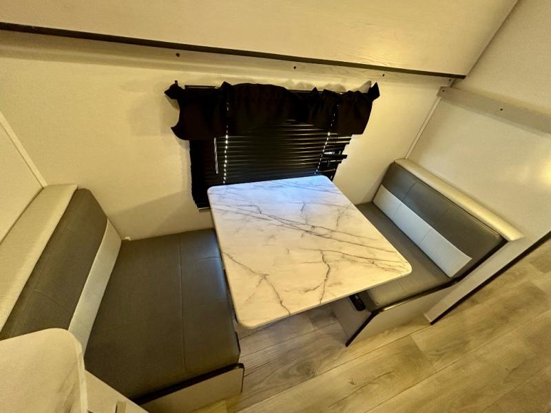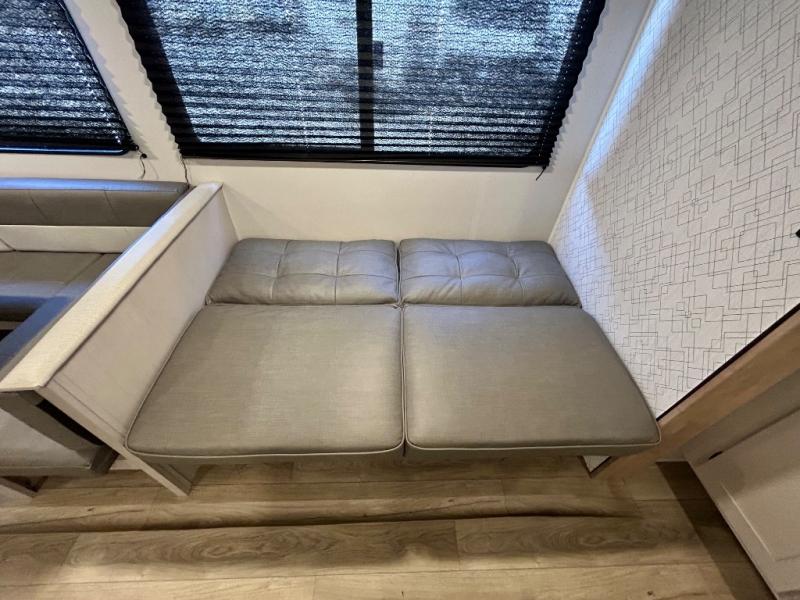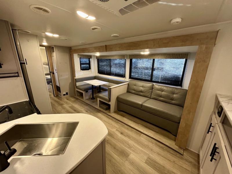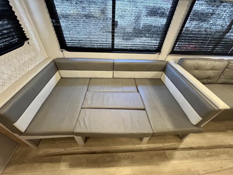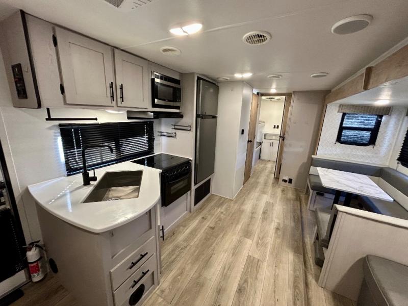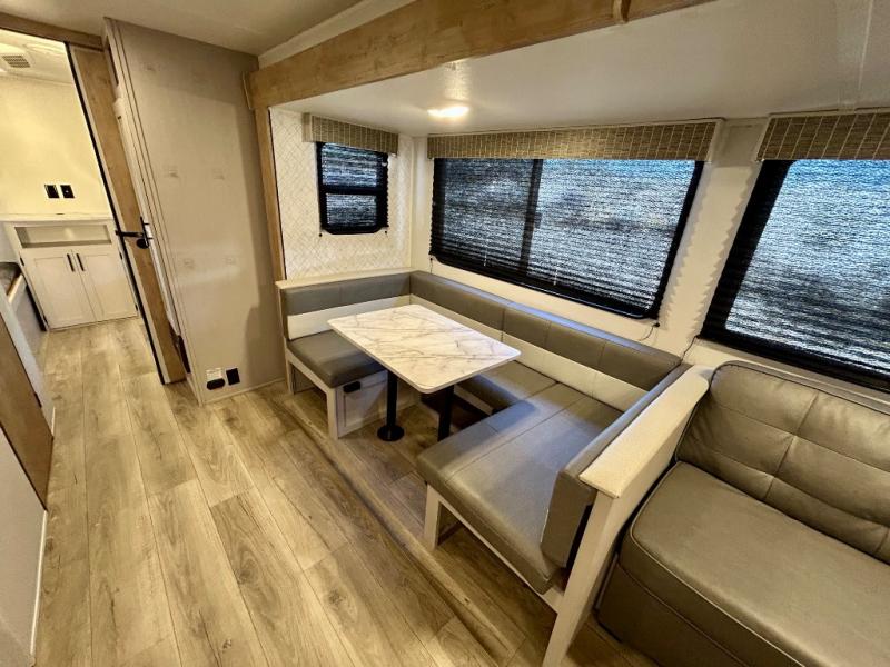 This travel trailer allows you to invite your whole crew along with a rear private bunkhouse and a front private bedroom. The bunkhouse includes three bunks, plus a dinette where the little ones can draw or play a game together. The U-shaped dinette and sofa within the large slide out will provide space to relax, dine, and sleep more guests. This model includes a three burner cooktop, a microwave oven, plus a 10 cu. ft. extra large residential refrigerator for your perishables.