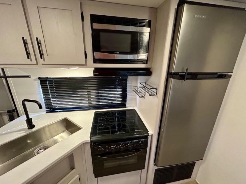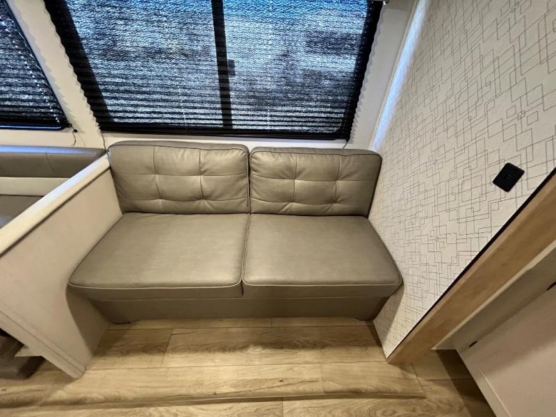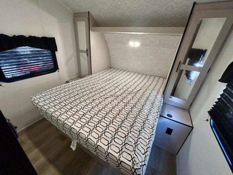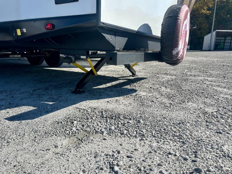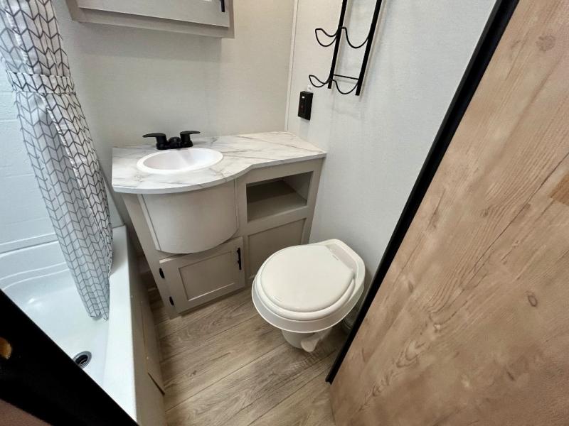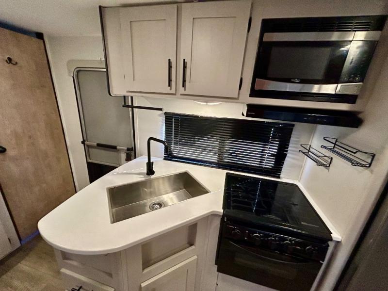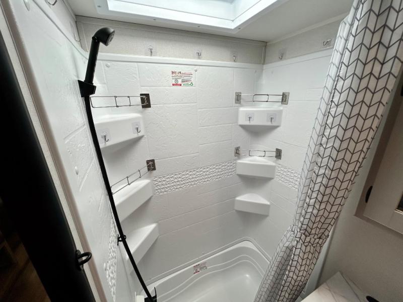 This travel trailer allows you to invite your whole crew along with a rear private bunkhouse and a front private bedroom. The bunkhouse includes three bunks, plus a dinette where the little ones can draw or play a game together. The U-shaped dinette and sofa within the large slide out will provide space to relax, dine, and sleep more guests. This model includes a three burner cooktop, a microwave oven, plus a 10 cu. ft. extra large residential refrigerator for your perishables.
