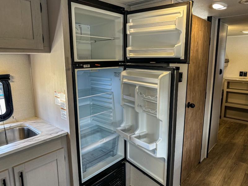 Head to the campground for the weekend in this spacious travel trailer! There is a rear bunkhouse with four bunks your guests will love, and the full bath is right next to the bunkhouse for convenience. Whether you're making dinner in the full kitchen, relaxing on the sofa and booth dinette, or resting in the front private bedroom, you'll enjoy every minute in this trailer. After dinner, head outdoors to relax under the patio awning!