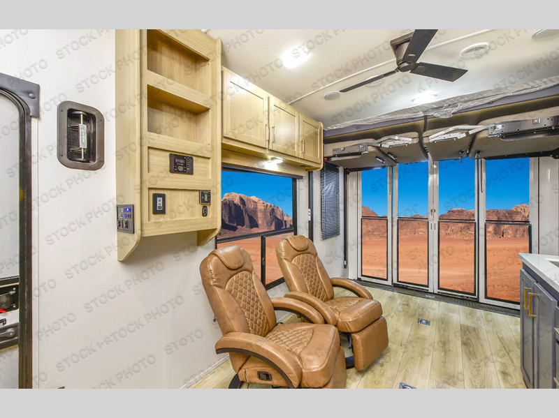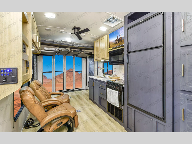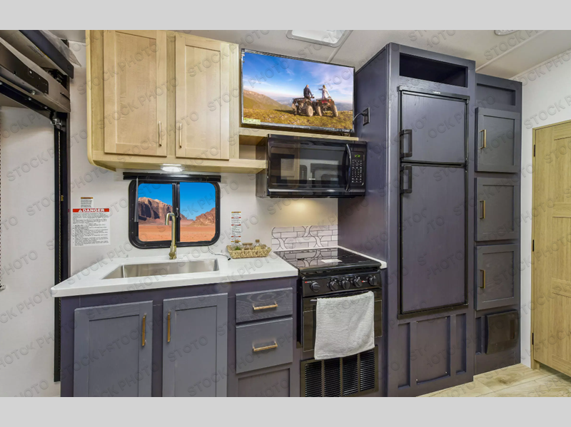 This toy hauler will be the perfect companion for all your outdoor adventures. Once you remove your toys from the 16' 7" garage using the ramp door, you can relax on the opposing sofa with a dinette. You will also find dual recliners in the living area for additional seating space. The chef of your group will have a three burner range and a microwave oven to prepare meals each day, plus an 10.7 cu. ft. 12V refrigerator and a pantry for food storage. The dual entry bathroom creates a master bedroom you are sure to love with a king bed slide out and cabinets with shelving. There is even a wardrobe and extra storage so nothing gets left behind. And don't overlook the exterior with its easy entry solid steps and 19' patio awning!