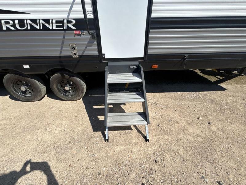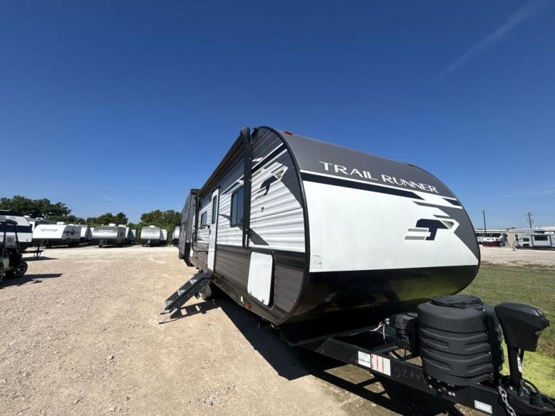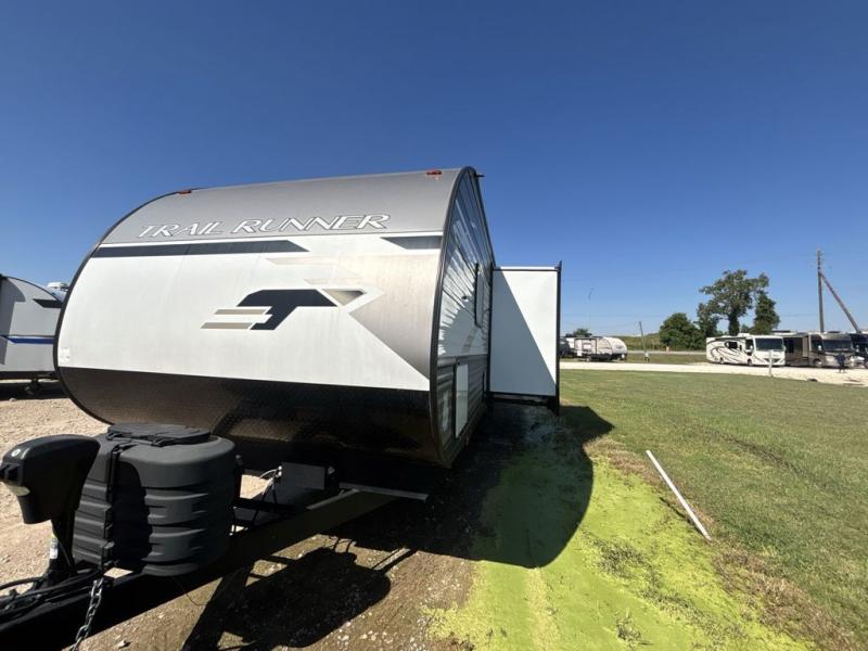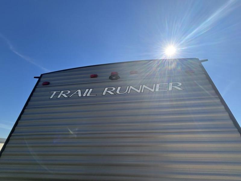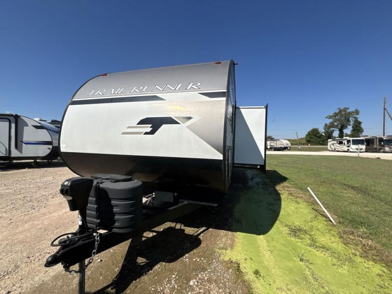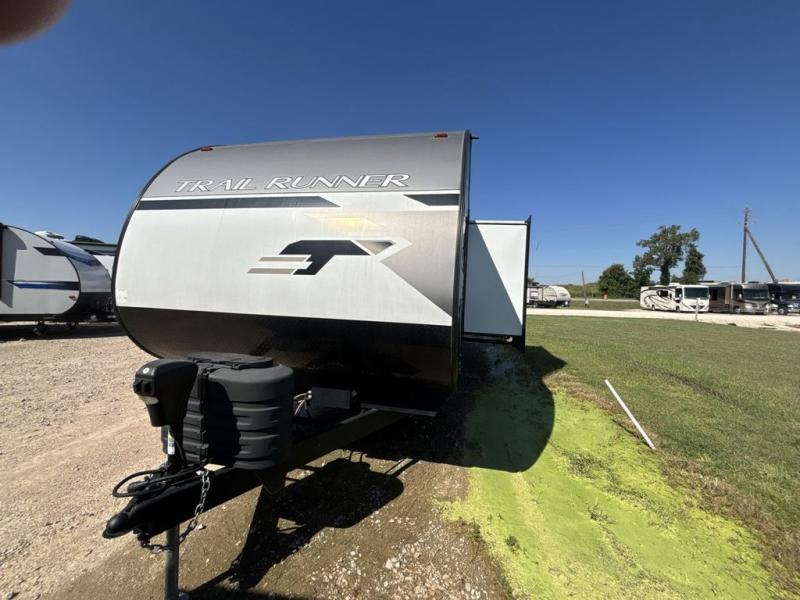 Paradise awaits at the end of the trail with one of these Heartland Trail Runner travel trailers! Experience better wind and water deflection, added strength, and a reduction of tongue weight with the hybrid aluminum front profile that has an aerodynamic radius front cage. A cambered structural steel I-beam frame holds them together and a heated enclosed underbelly protects the units vitals. There is an industry leading mammoth storage space of 57 cu. ft. pass-through storage so you can bring all of your outdoor gear with you. Roller shades in the main living area, woven flooring in all slide rooms, master suites with CPAP storage, and upgraded pressed counters give you the at-home feel you desire. Come find the perfect model for you today!