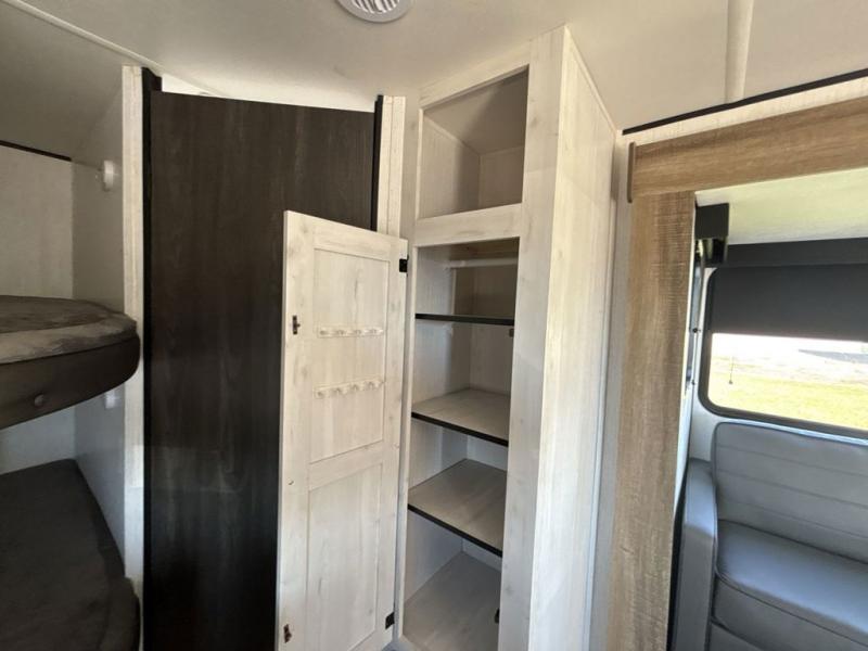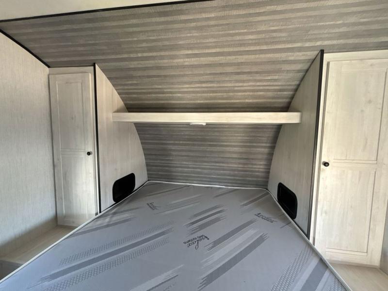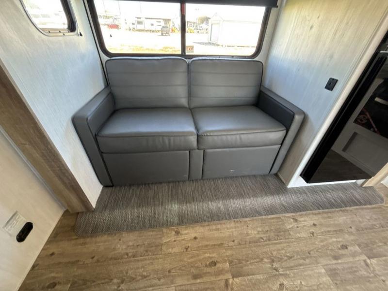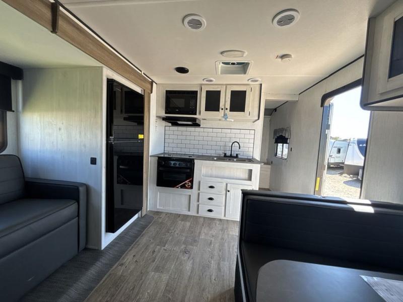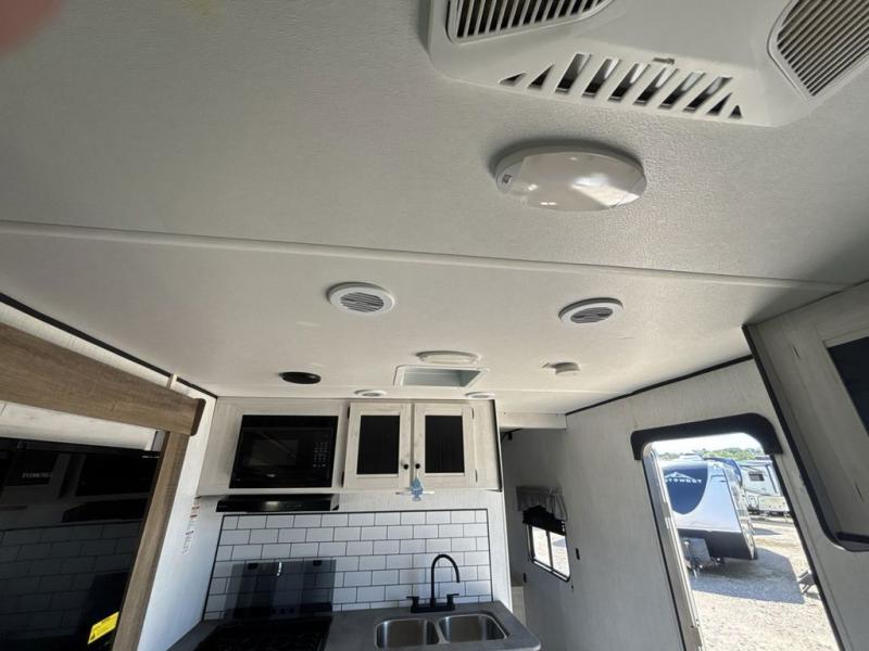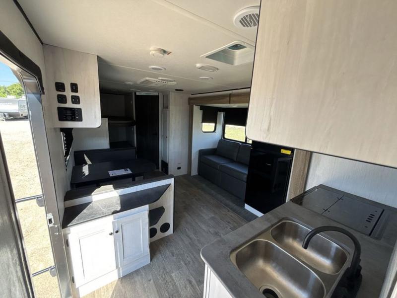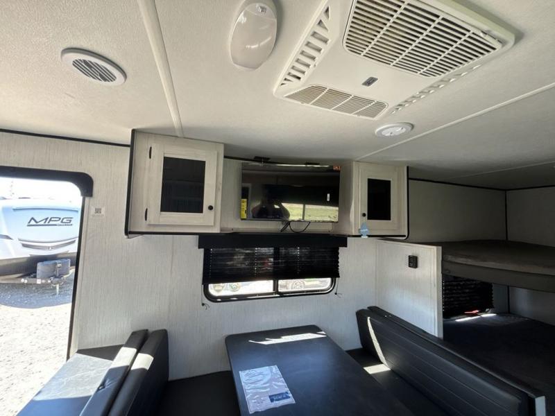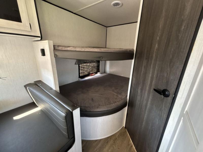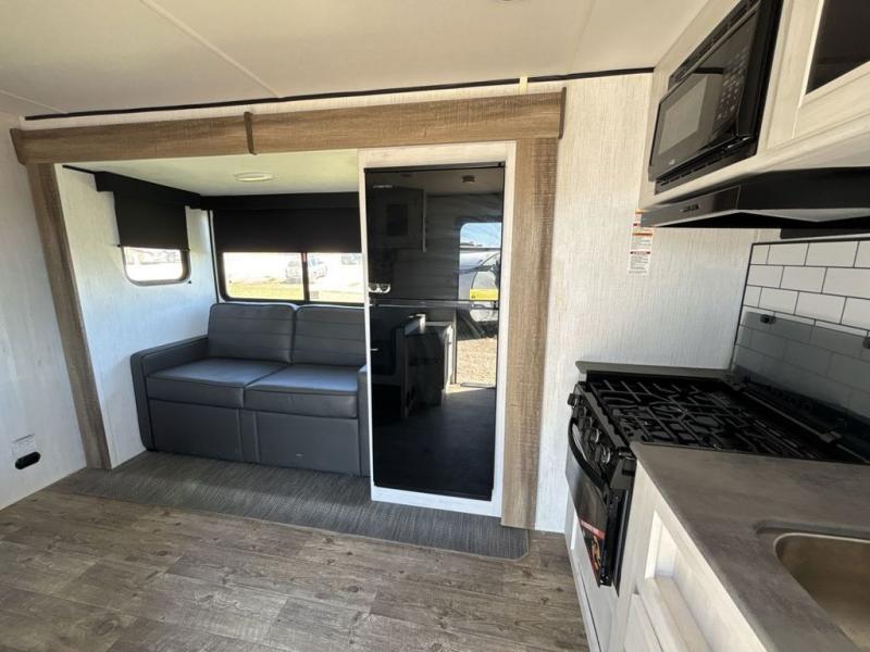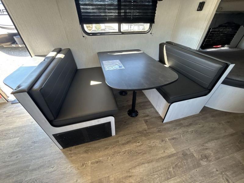 No one will be left behind with this travel trailer! The kiddos can sleep on the set of double bunk beds and you will have your own privacy with the front private bedroom which has a queen bed with under-bed storage and wireless cell charging stations for one less thing to bring with you. The chef can whip up their best meals with the three burner cooktop and everyone can enjoy them together at the booth dinette then play a card game or two. If you're not big into card games then you can relax on the sofa while you enjoy a cold drink stored in the 10 cu. ft. stainless steel refrigerator. Freshen up each day in the rear corner bathroom with the ABS tub/shower surround with a skylight above it!
