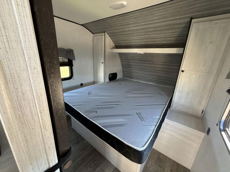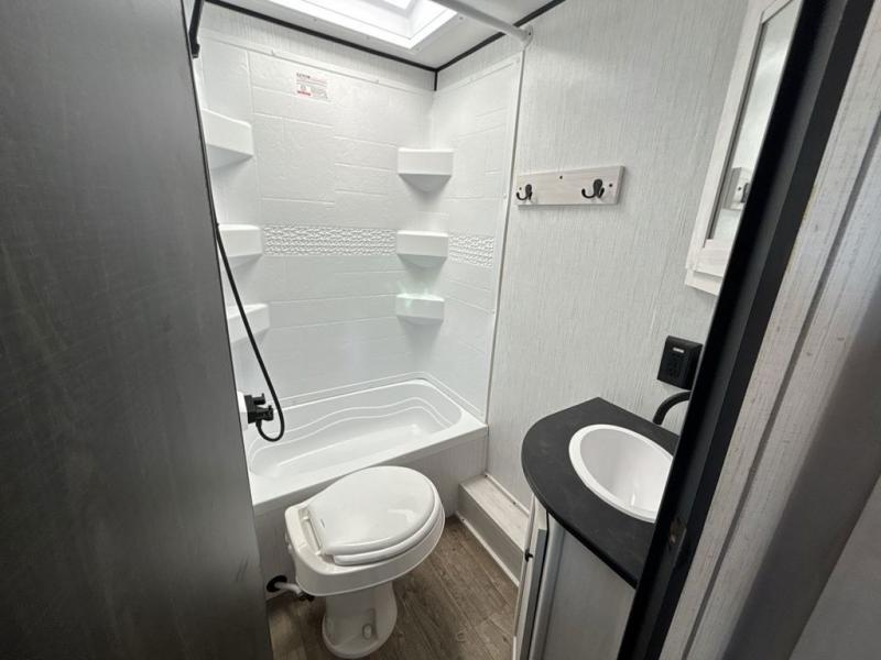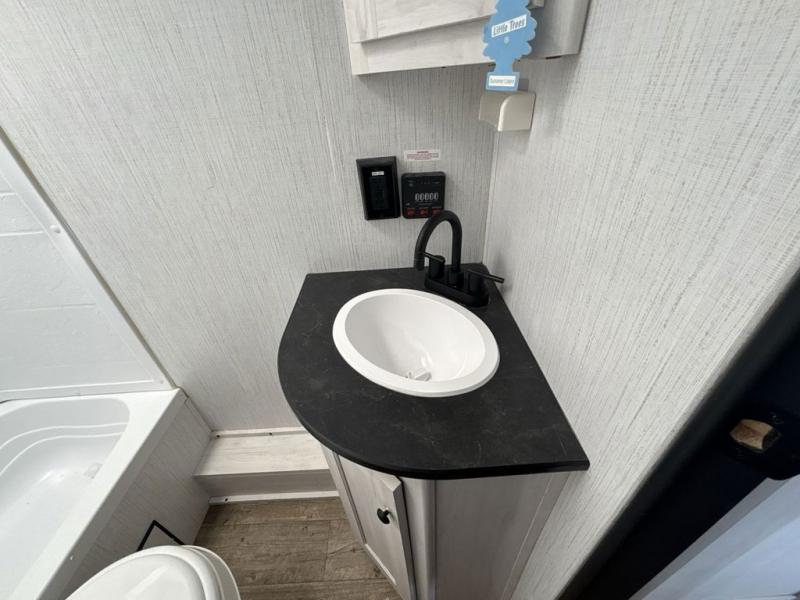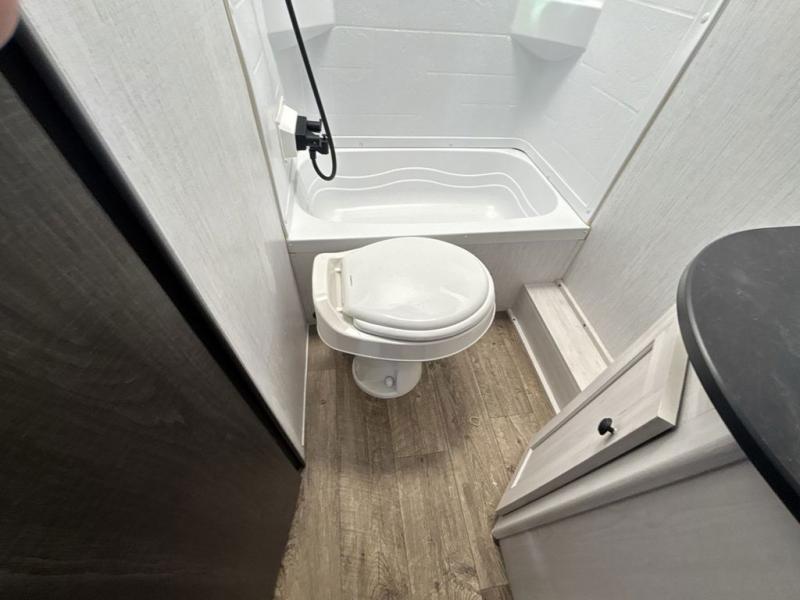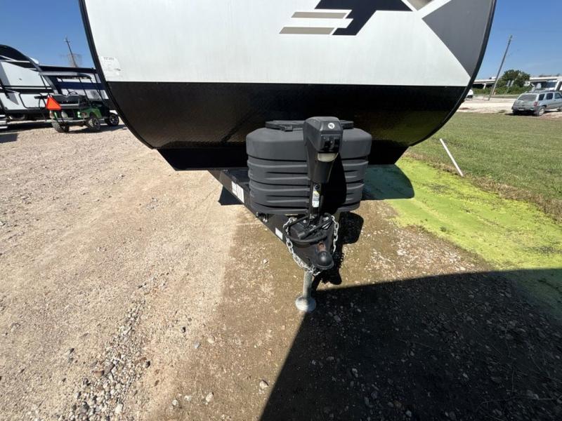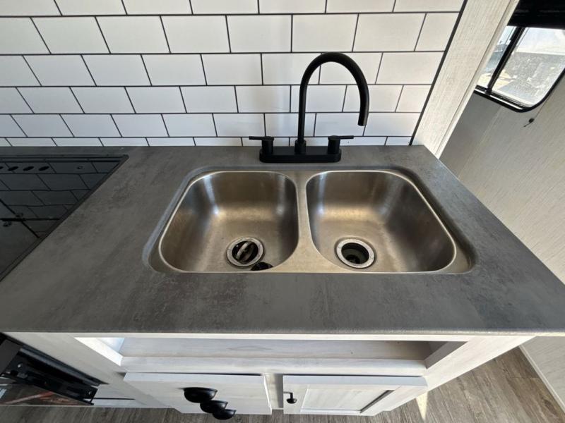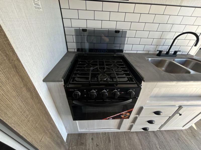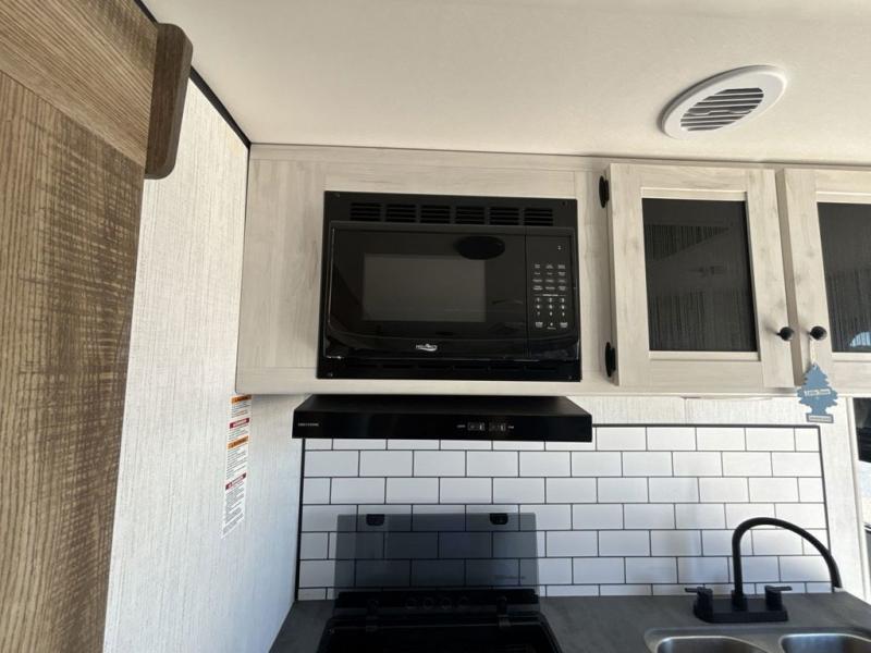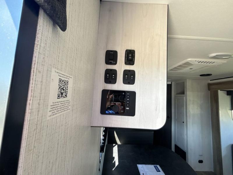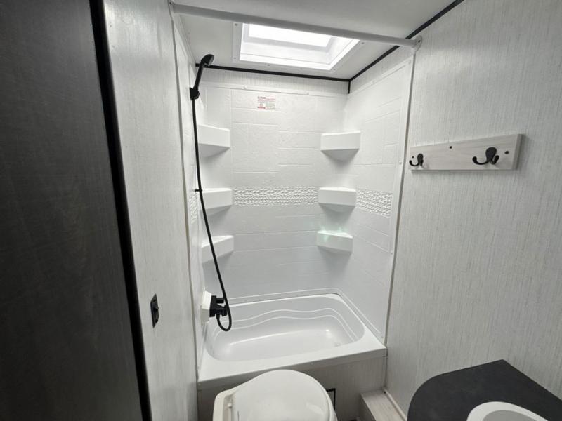 No one will be left behind with this travel trailer! The kiddos can sleep on the set of double bunk beds and you will have your own privacy with the front private bedroom which has a queen bed with under-bed storage and wireless cell charging stations for one less thing to bring with you. The chef can whip up their best meals with the three burner cooktop and everyone can enjoy them together at the booth dinette then play a card game or two. If you're not big into card games then you can relax on the sofa while you enjoy a cold drink stored in the 10 cu. ft. stainless steel refrigerator. Freshen up each day in the rear corner bathroom with the ABS tub/shower surround with a skylight above it!
