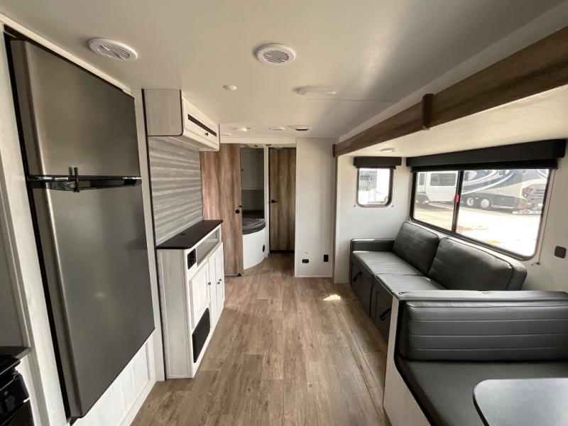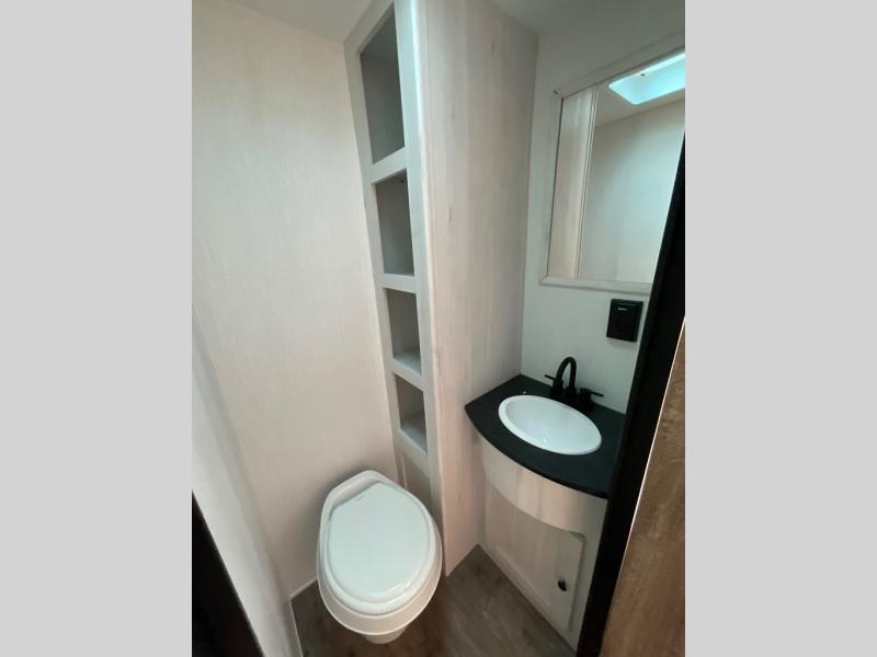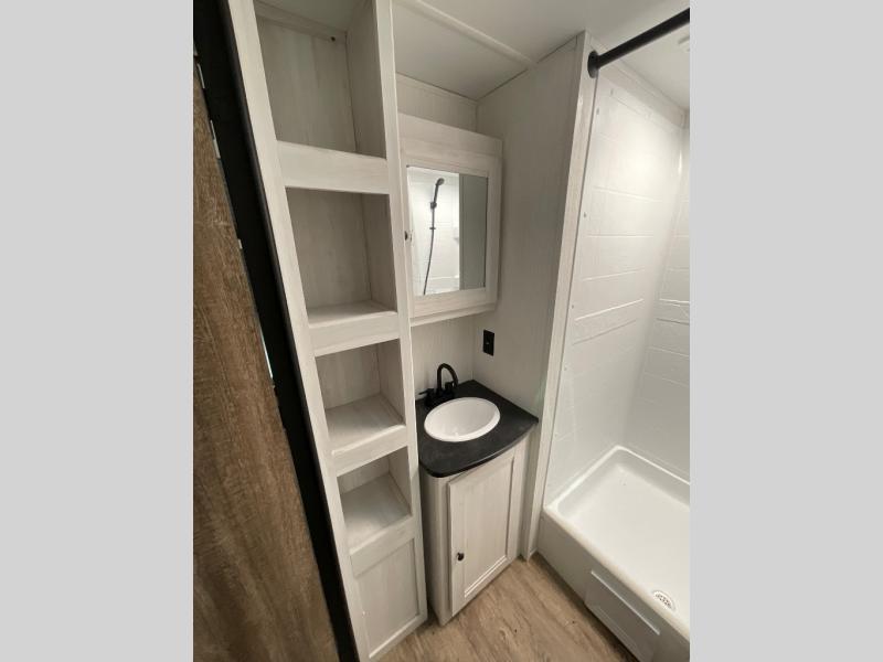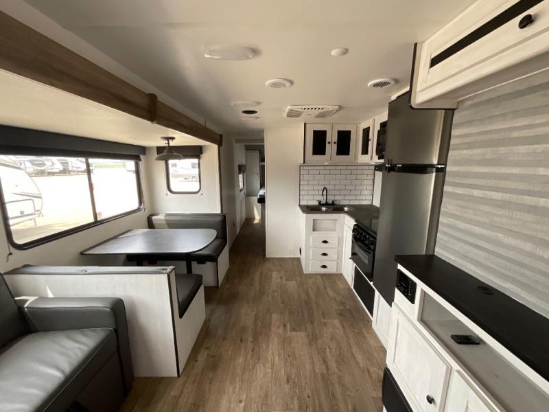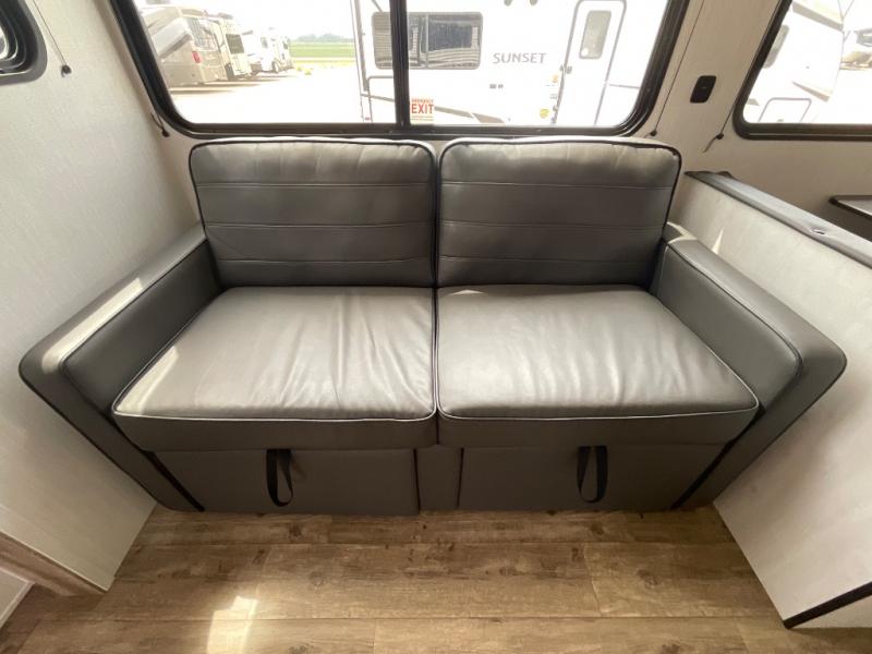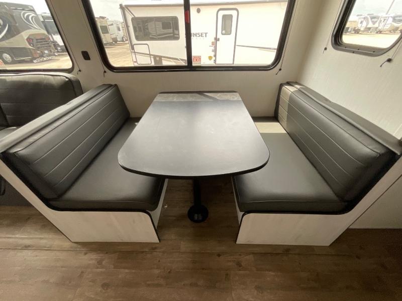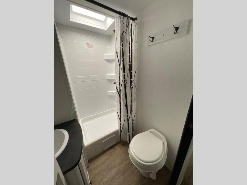You won't want to camp any other way once you step inside this travel trailer! A bath and a half makes life much easier at the campground. The half bathroom is even located in the rear private bunkhouse which also has a double bed with a bunk above it and a shirt closet. There is plenty of storage throughout between the overhead cabinets, the walk-in pantry by the entrance, the oversized wardrobe, and under-bed storage in the front private bedroom. Freshen up each morning in the full bathroom with the ABS tub/shower surround with a skylight above then fry up some eggs on the three burner cooktop and enjoy them at the booth dinette. There is also a sofa to relax on each evening!