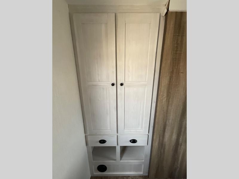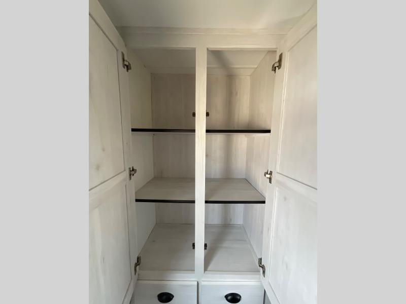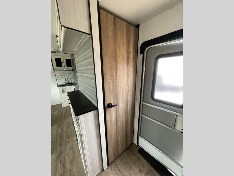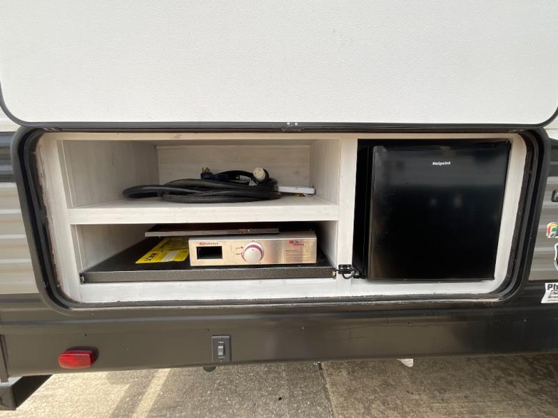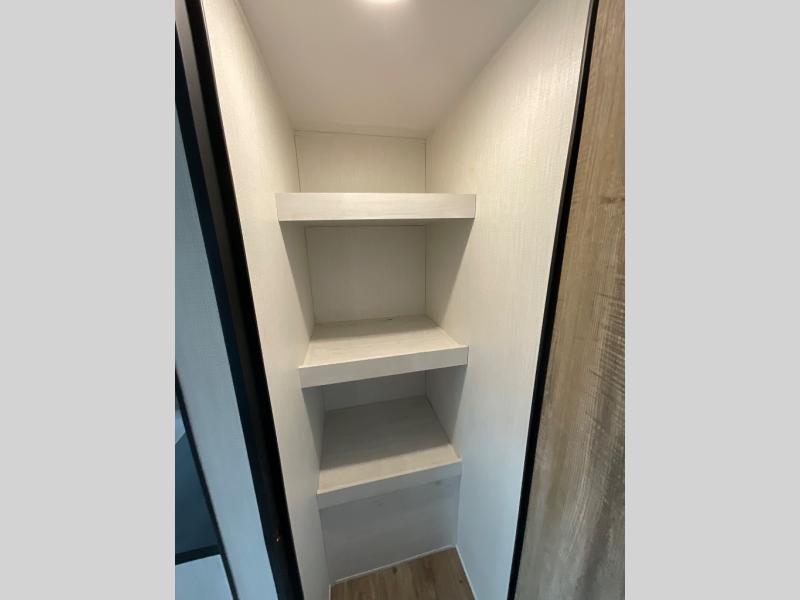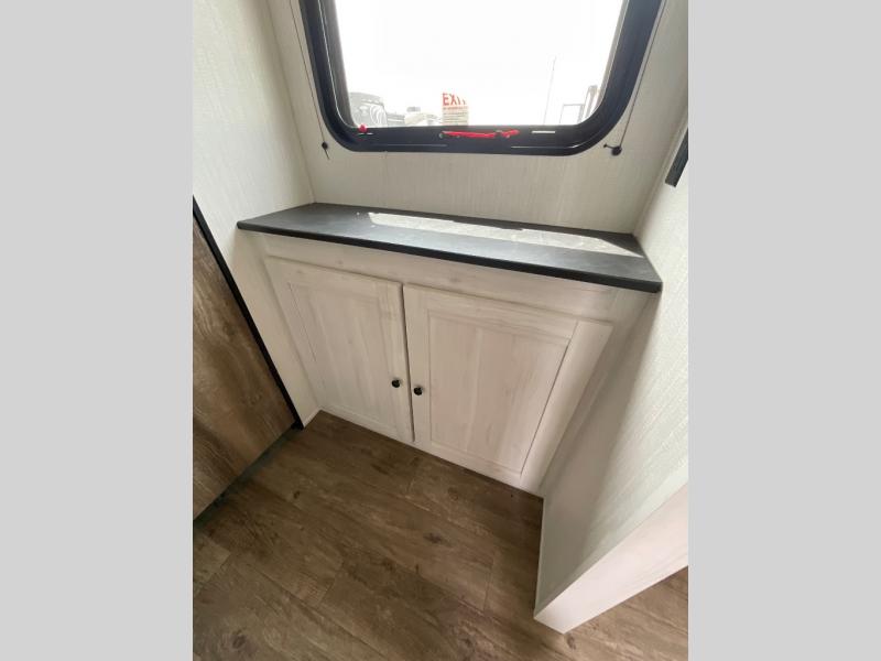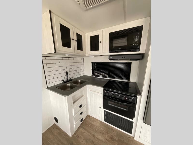You won't want to camp any other way once you step inside this travel trailer! A bath and a half makes life much easier at the campground. The half bathroom is even located in the rear private bunkhouse which also has a double bed with a bunk above it and a shirt closet. There is plenty of storage throughout between the overhead cabinets, the walk-in pantry by the entrance, the oversized wardrobe, and under-bed storage in the front private bedroom. Freshen up each morning in the full bathroom with the ABS tub/shower surround with a skylight above then fry up some eggs on the three burner cooktop and enjoy them at the booth dinette. There is also a sofa to relax on each evening!