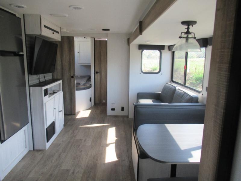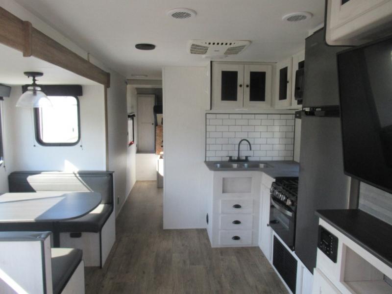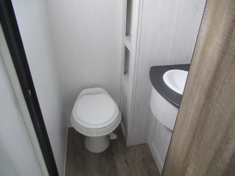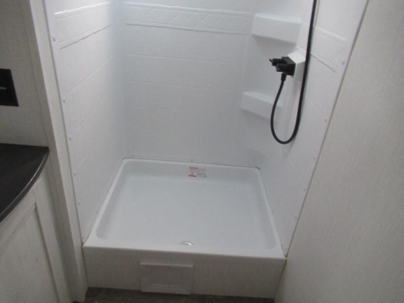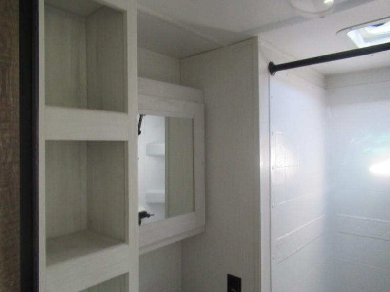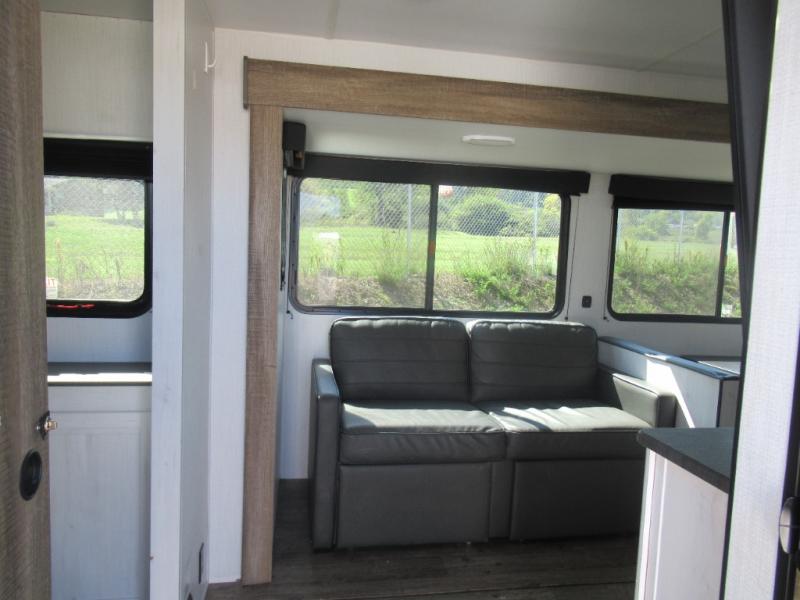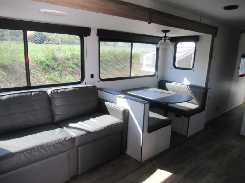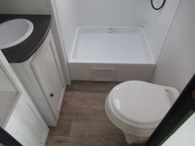 You won't want to camp any other way once you step inside this travel trailer! A bath and a half makes life much easier at the campground. The half bathroom is even located in the rear private bunkhouse which also has a double bed with a bunk above it and a shirt closet. There is plenty of storage throughout between the overhead cabinets, the walk-in pantry by the entrance, the oversized wardrobe, and under-bed storage in the front private bedroom. Freshen up each morning in the full bathroom with the ABS tub/shower surround with a skylight above then fry up some eggs on the three burner cooktop and enjoy them at the booth dinette. There is also a sofa to relax on each evening!