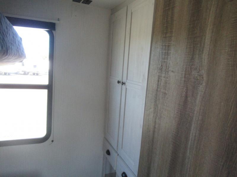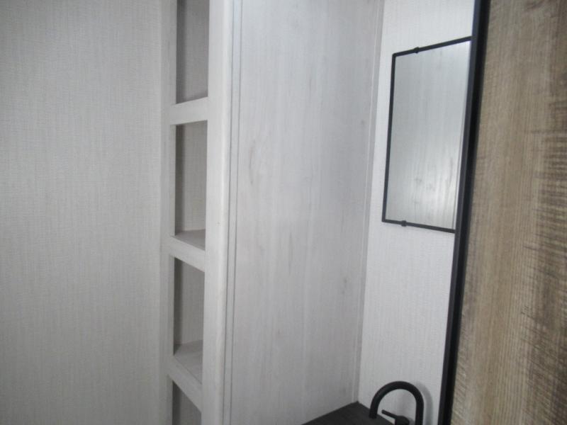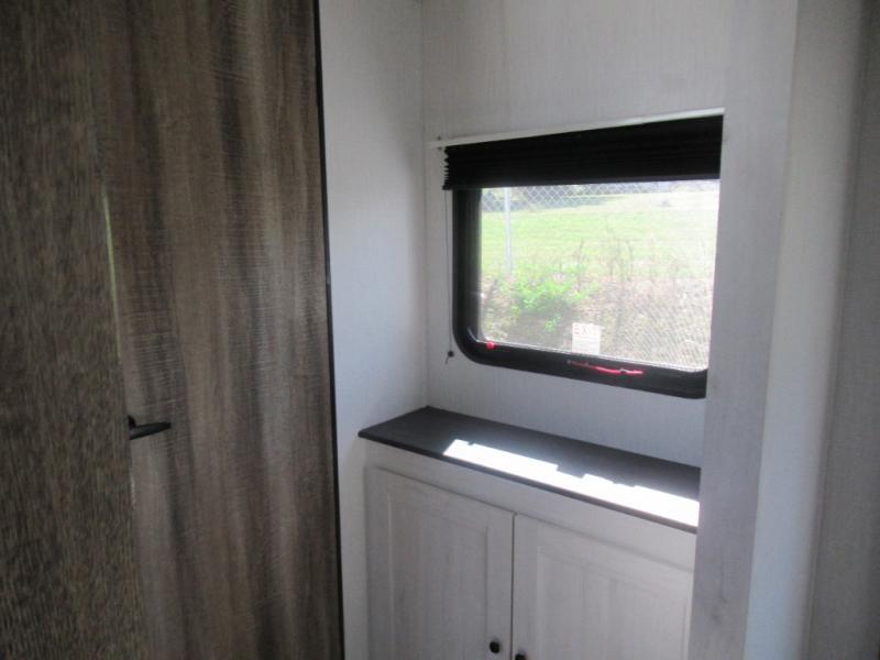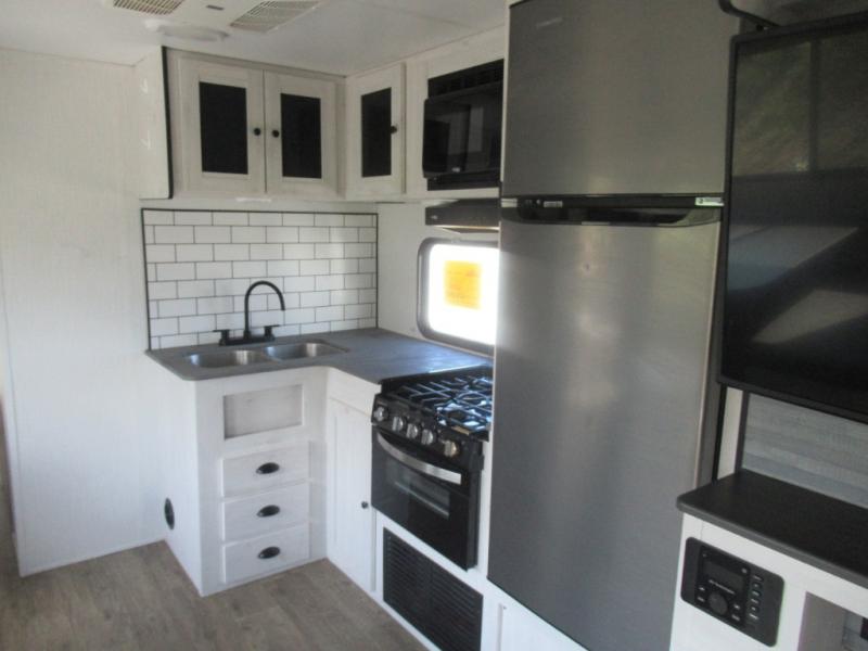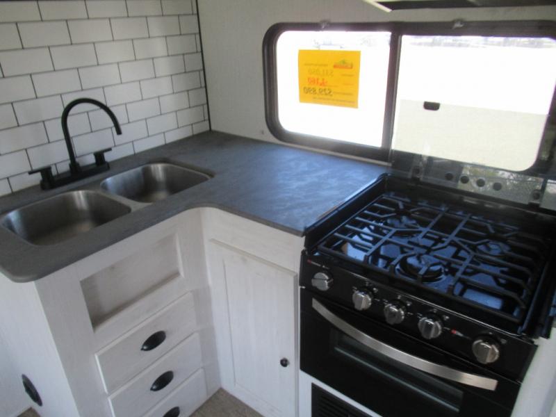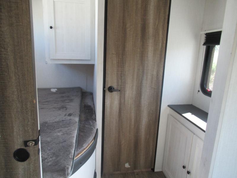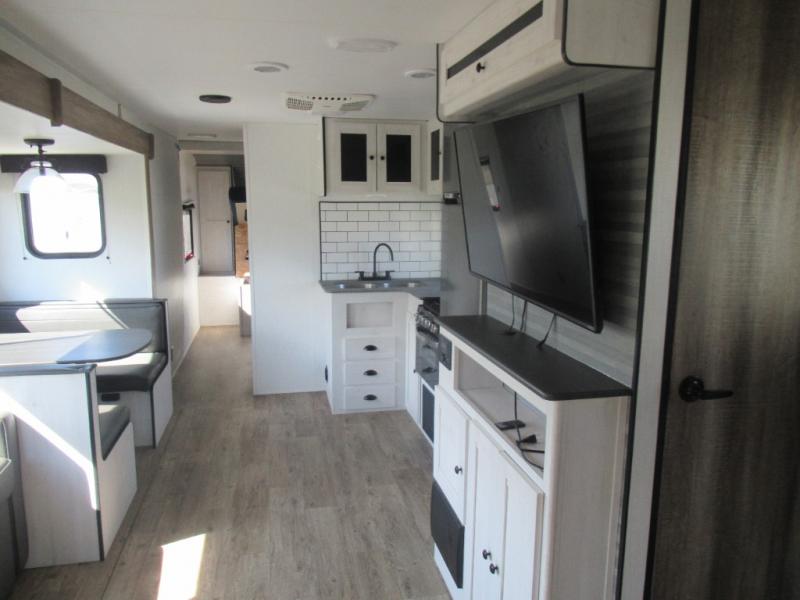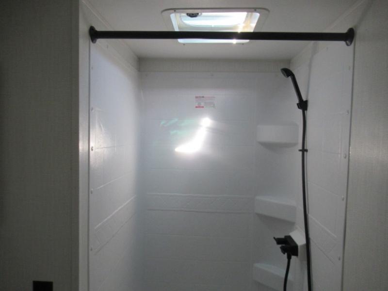 You won't want to camp any other way once you step inside this travel trailer! A bath and a half makes life much easier at the campground. The half bathroom is even located in the rear private bunkhouse which also has a double bed with a bunk above it and a shirt closet. There is plenty of storage throughout between the overhead cabinets, the walk-in pantry by the entrance, the oversized wardrobe, and under-bed storage in the front private bedroom. Freshen up each morning in the full bathroom with the ABS tub/shower surround with a skylight above then fry up some eggs on the three burner cooktop and enjoy them at the booth dinette. There is also a sofa to relax on each evening!