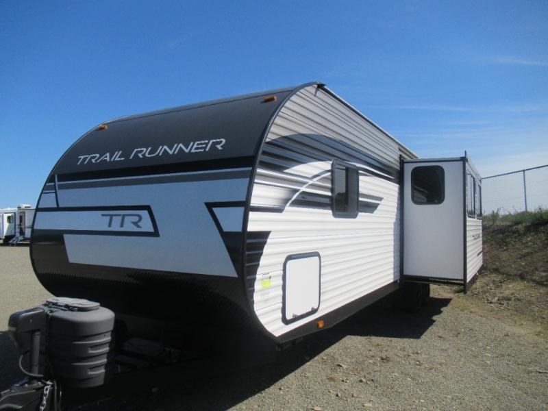 Paradise awaits at the end of the trail with one of these Heartland Trail Runner travel trailers! Experience better wind and water deflection, added strength, and a reduction of tongue weight with the hybrid aluminum front profile that has an aerodynamic radius front cage. A cambered structural steel I-beam frame holds them together and a heated enclosed underbelly protects the units vitals. There is an industry leading mammoth storage space of 57 cu. ft. pass-through storage so you can bring all of your outdoor gear with you. Roller shades in the main living area, woven flooring in all slide rooms, master suites with CPAP storage, and upgraded pressed counters give you the at-home feel you desire. Come find the perfect model for you today!