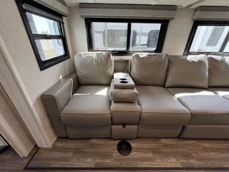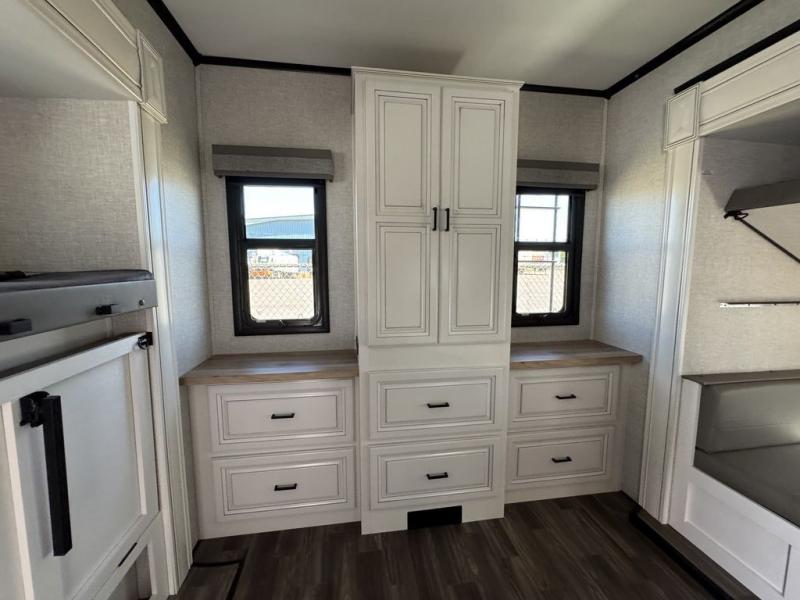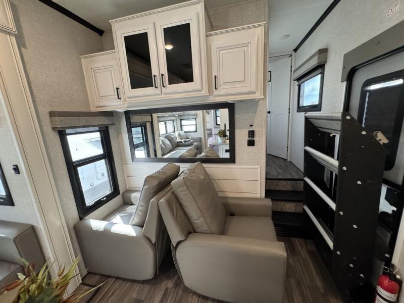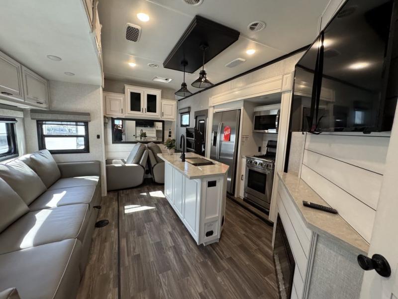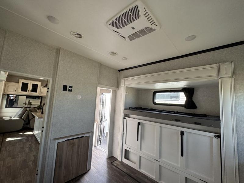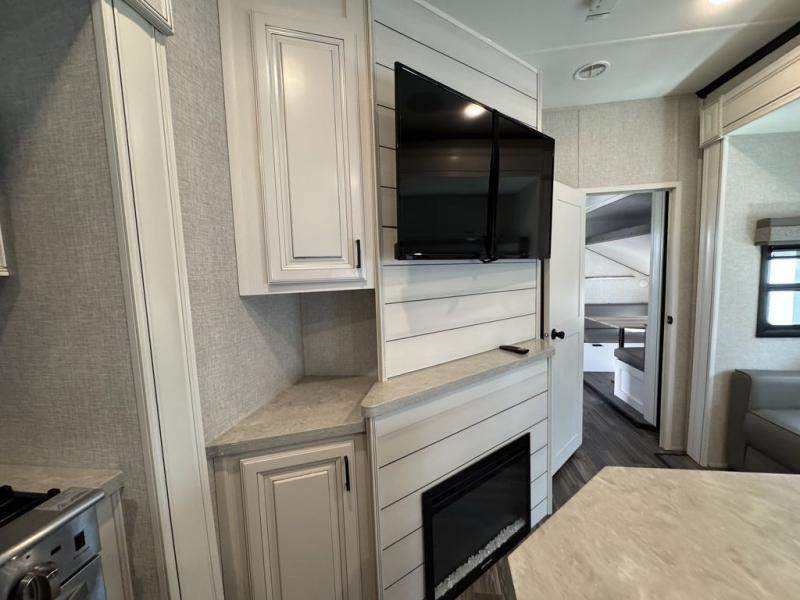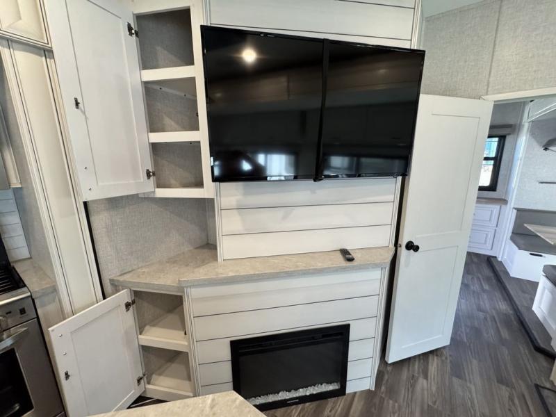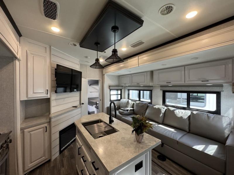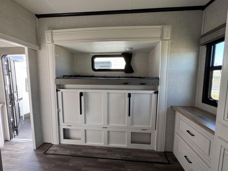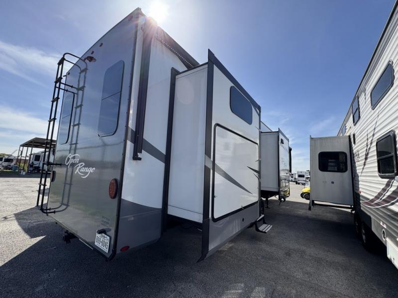 This Open Range is absolutely jam packed with convenience! There is a phenomenal bunkhouse suite that contains opposing slides for extra space, a flip-up desk for working on projects, full-width wardrobe/dressers for storing clothes, a half bathroom for cleaning up in the morning, and the second exterior entry door. This fifth wheel not only has a bunkhouse suite, but it also has a master suite up front so that you can live in luxury too. This front bedroom has a queen bed slide or choose a king option, a desk, a dresser, a mirrored wardrobe, and a private entrance into the double entry bathroom. The convenience continues on into the main living area where you will find a kitchen island, a mega lounge with two tables or choose the theater seats or table with chairs option(s) in its place. There is also an entertainment center with 50" Smart HDTV and a fireplace, and two recliners.