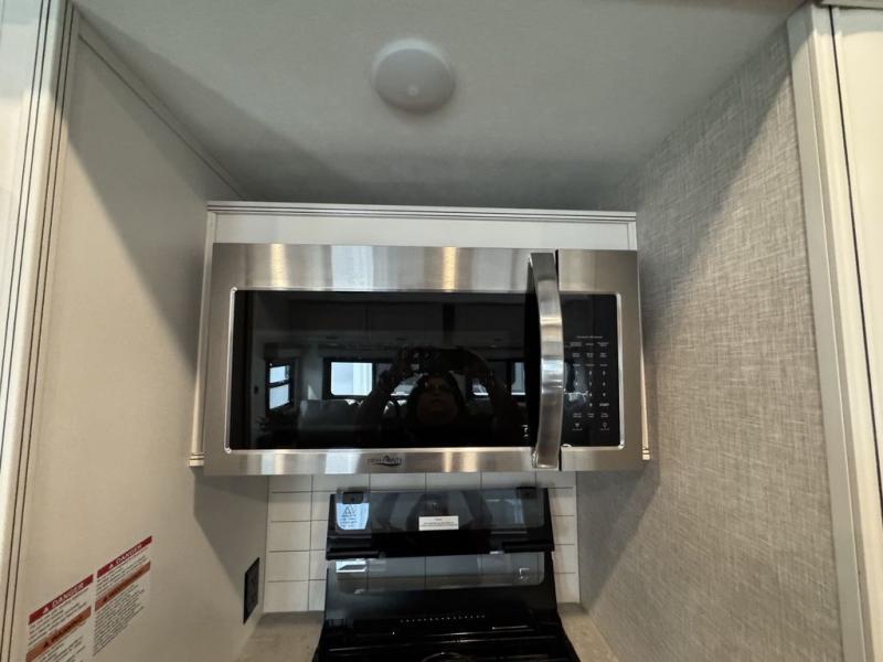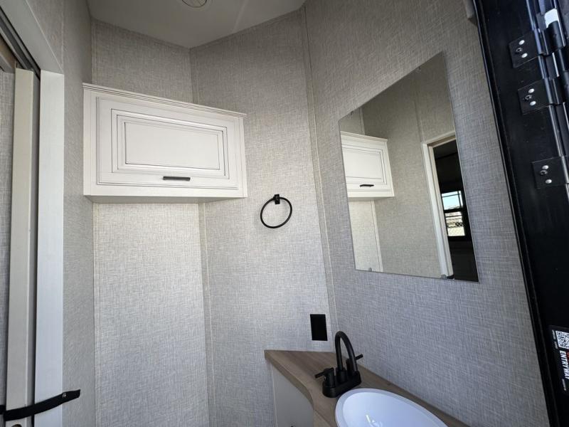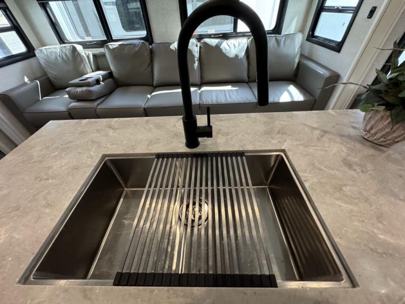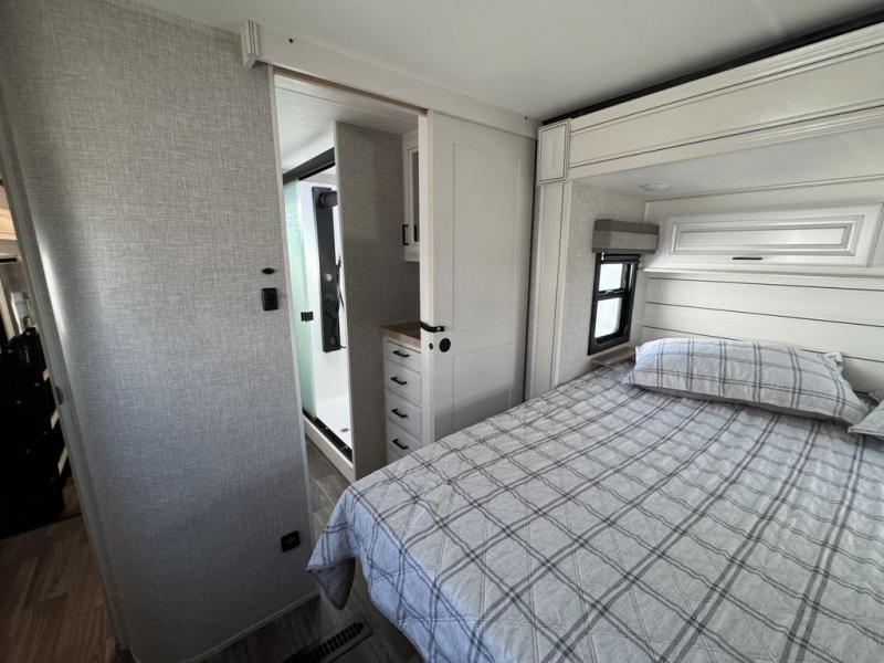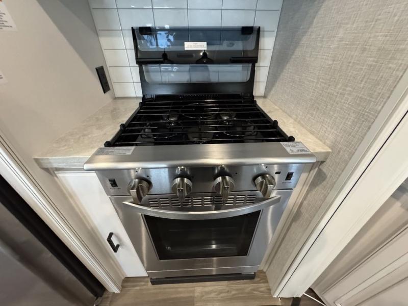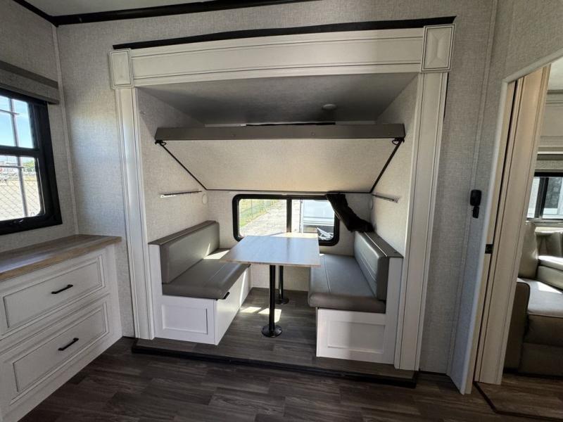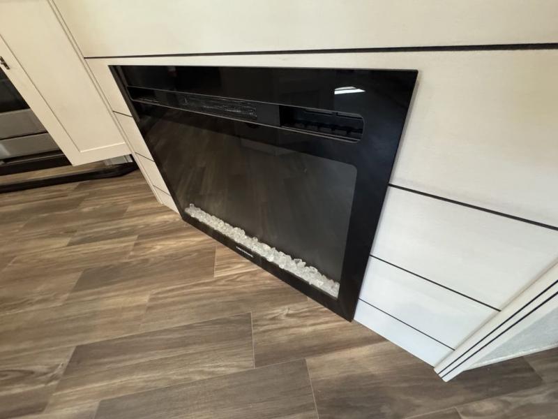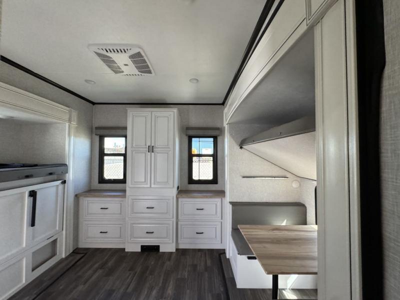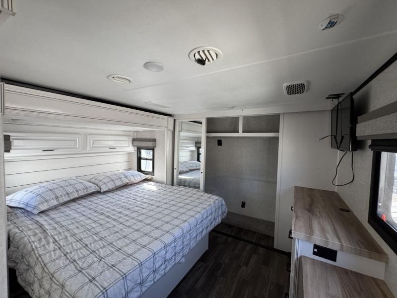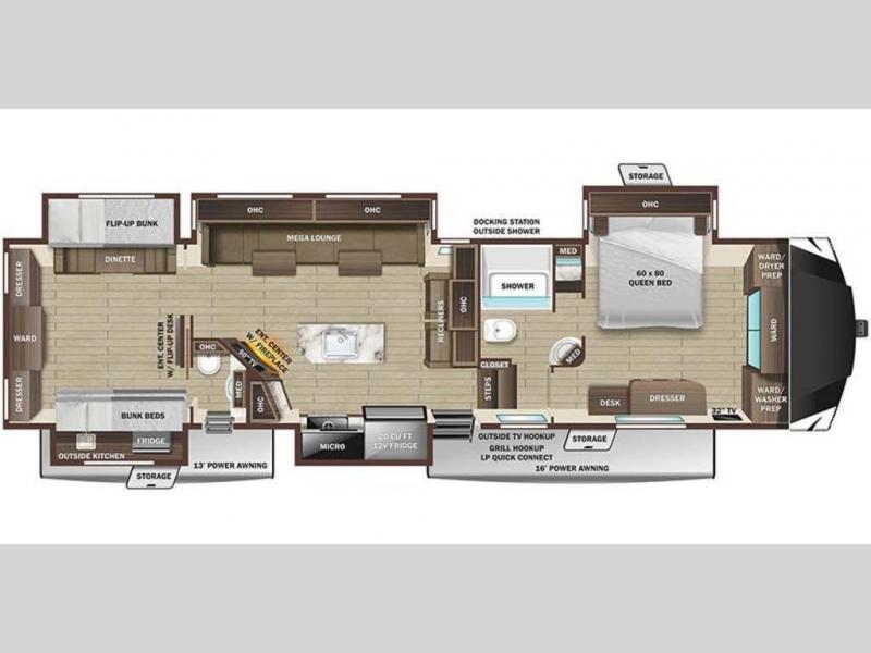 This Open Range is absolutely jam packed with convenience! There is a phenomenal bunkhouse suite that contains opposing slides for extra space, a flip-up desk for working on projects, full-width wardrobe/dressers for storing clothes, a half bathroom for cleaning up in the morning, and the second exterior entry door. This fifth wheel not only has a bunkhouse suite, but it also has a master suite up front so that you can live in luxury too. This front bedroom has a queen bed slide or choose a king option, a desk, a dresser, a mirrored wardrobe, and a private entrance into the double entry bathroom. The convenience continues on into the main living area where you will find a kitchen island, a mega lounge with two tables or choose the theater seats or table with chairs option(s) in its place. There is also an entertainment center with 50" Smart HDTV and a fireplace, and two recliners.