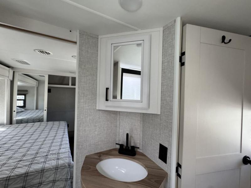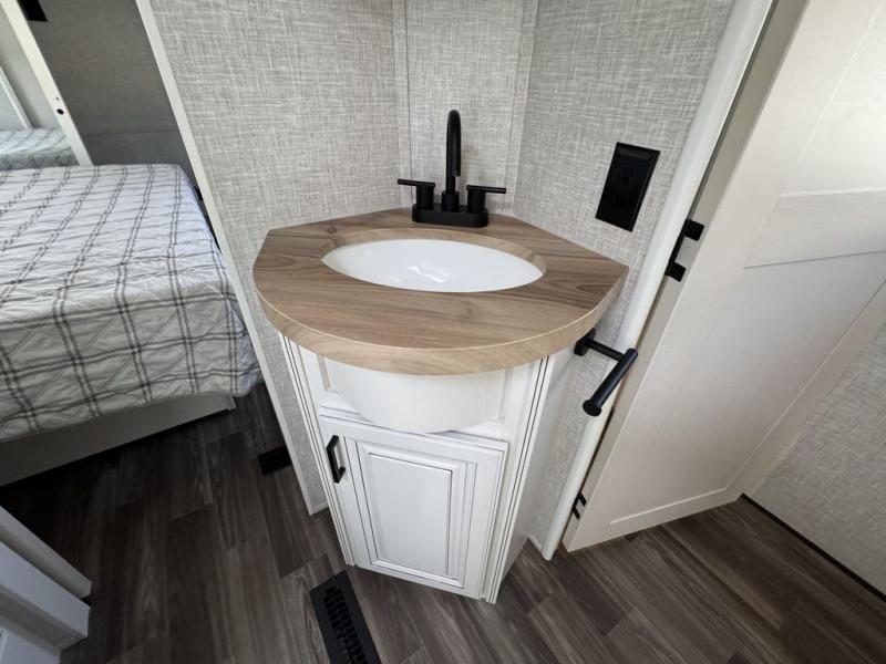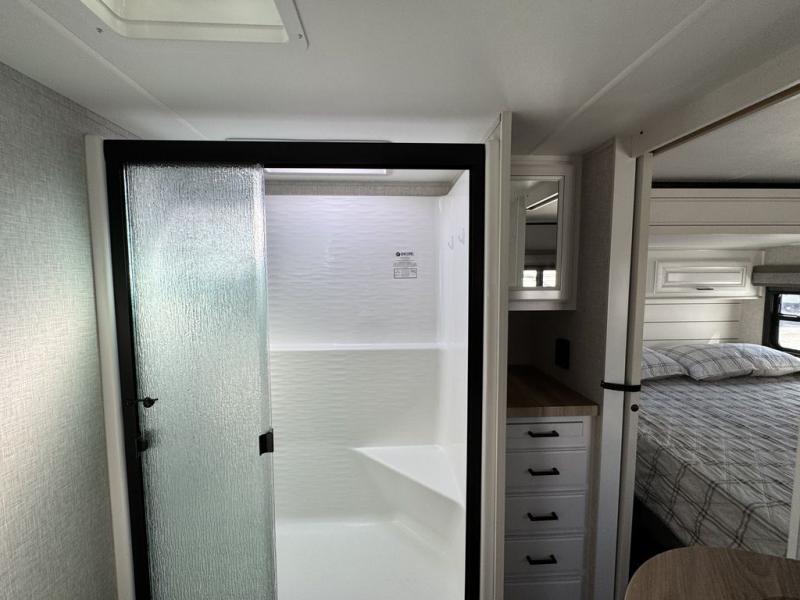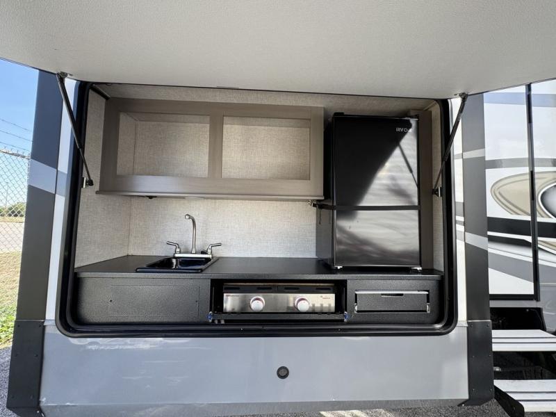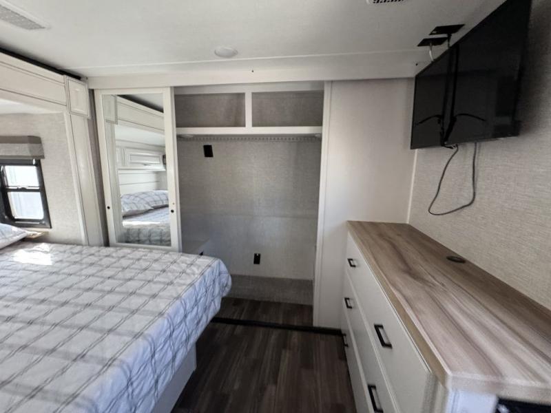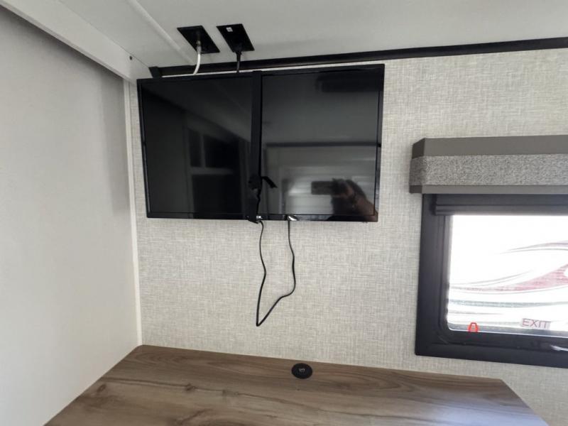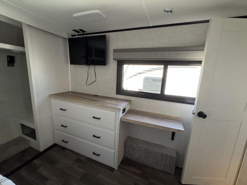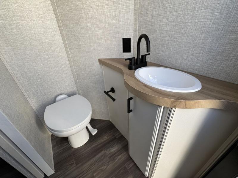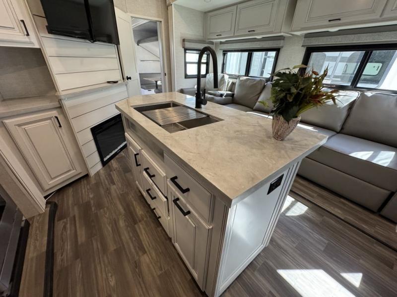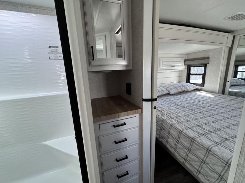 This Open Range is absolutely jam packed with convenience! There is a phenomenal bunkhouse suite that contains opposing slides for extra space, a flip-up desk for working on projects, full-width wardrobe/dressers for storing clothes, a half bathroom for cleaning up in the morning, and the second exterior entry door. This fifth wheel not only has a bunkhouse suite, but it also has a master suite up front so that you can live in luxury too. This front bedroom has a queen bed slide or choose a king option, a desk, a dresser, a mirrored wardrobe, and a private entrance into the double entry bathroom. The convenience continues on into the main living area where you will find a kitchen island, a mega lounge with two tables or choose the theater seats or table with chairs option(s) in its place. There is also an entertainment center with 50" Smart HDTV and a fireplace, and two recliners.