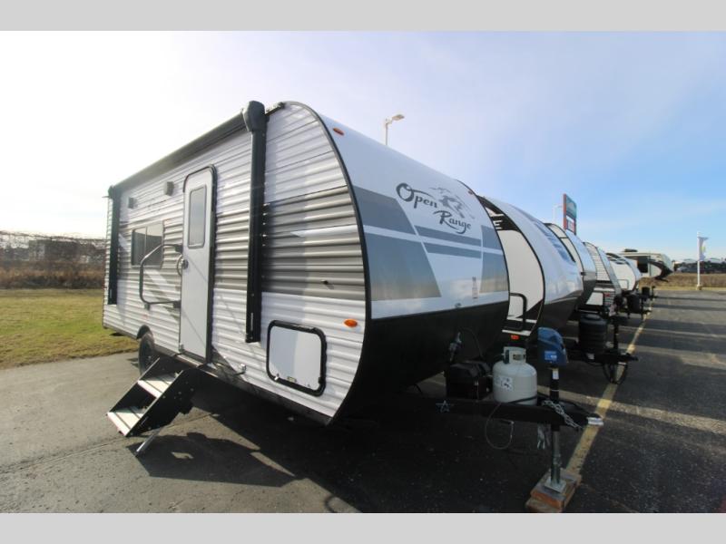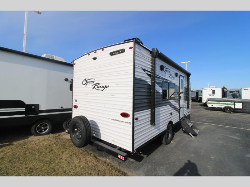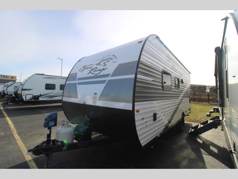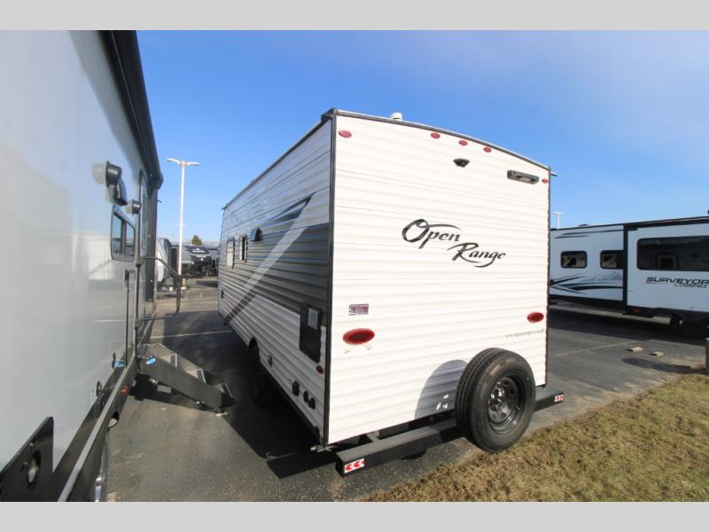 The affordable Open Range Conventional travel trailers by Highland Ridge are ready to meet your camping needs! You will appreciate the durable Magnum Roof system, plus each model is constructed with black front diamond plate protection, 5/8" main floor decking, and self-adjusting electric brakes with E-Z Lube axles for smooth towing. The 81" interior height means you won't feel cramped when relaxing with friends and family, and the residential vinyl flooring throughout is easy to clean, which will be perfect if you're camping with little ones or pets. These models also include an AM/FM/Bluetooth radio with indoor/outdoor speakers, a digital TV antenna that will go perfectly with the optional Smart TV, plus a 13,500 BTU roof mounted A/C to keep you cool on those hot summer months.