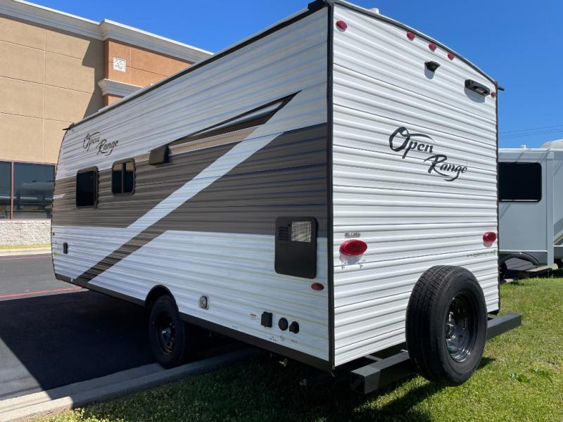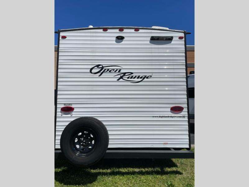 The affordable Open Range Conventional travel trailers by Highland Ridge are ready to meet your camping needs! You will appreciate the durable Magnum Roof system, plus each model is constructed with black front diamond plate protection, 5/8" main floor decking, and self-adjusting electric brakes with E-Z Lube axles for smooth towing. The 81" interior height means you won't feel cramped when relaxing with friends and family, and the residential vinyl flooring throughout is easy to clean, which will be perfect if you're camping with little ones or pets. These models also include an AM/FM/Bluetooth radio with indoor/outdoor speakers, a digital TV antenna that will go perfectly with the optional Smart TV, plus a 13,500 BTU roof mounted A/C to keep you cool on those hot summer months.