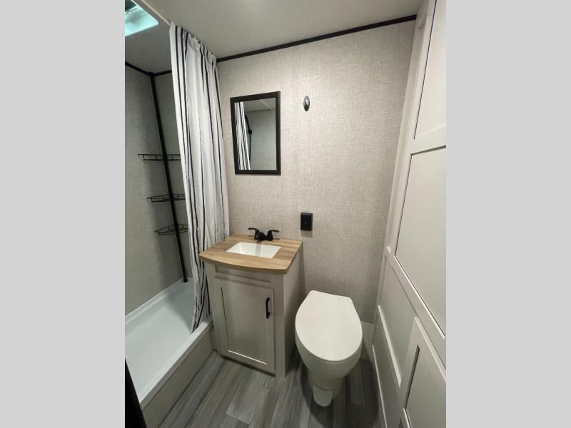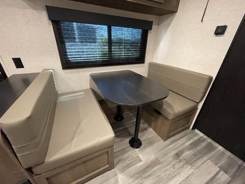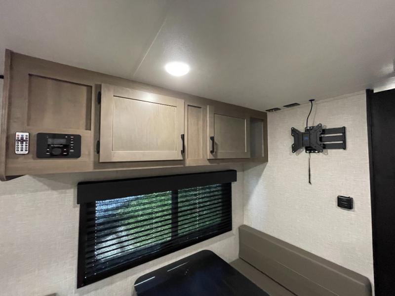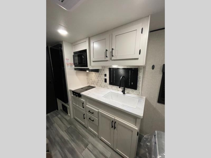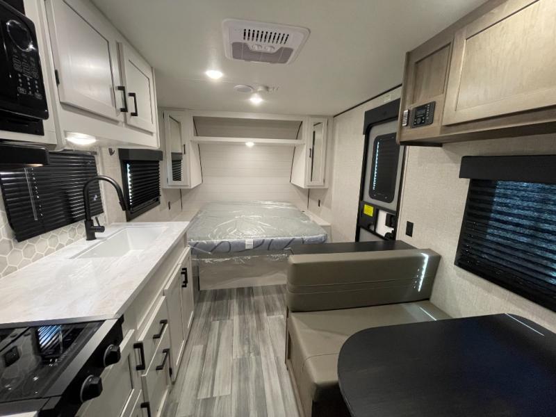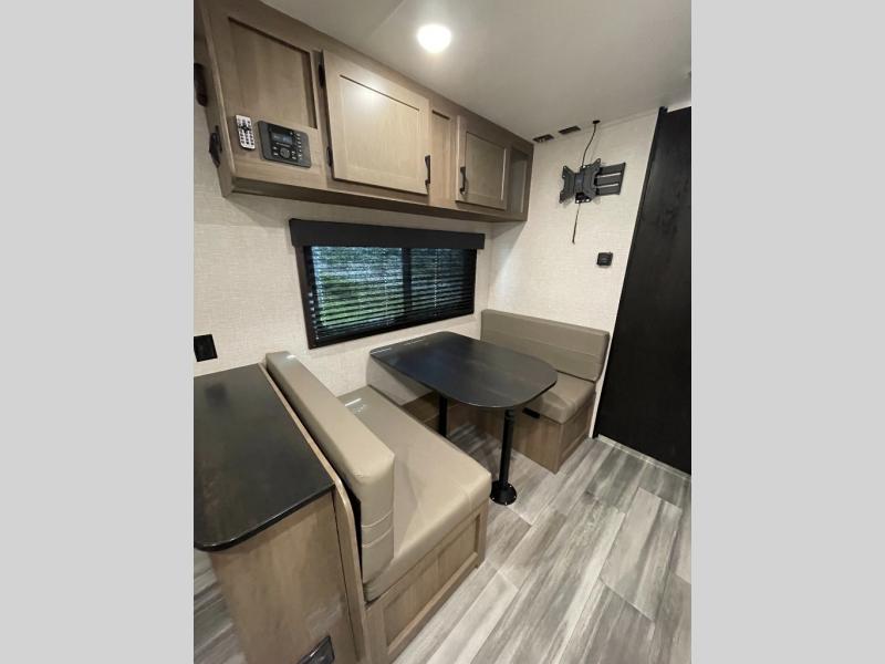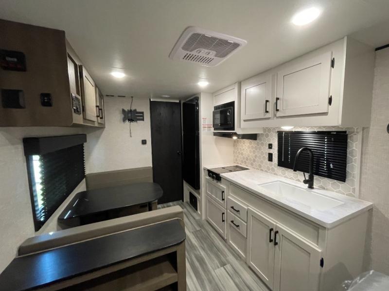 Head to the lake or the woods in this cozy travel trailer that can sleep three to four each night. There is a bed up front with dual wardrobes on either side of the bed, plus a booth dinette for guests. You will appreciate plenty of overhead storage for all your belongings, and the full rear bath is both spacious and tucked away for privacy. This model also has everything needed each day to prepare at-home meals, including a microwave oven and a two burner cooktop.