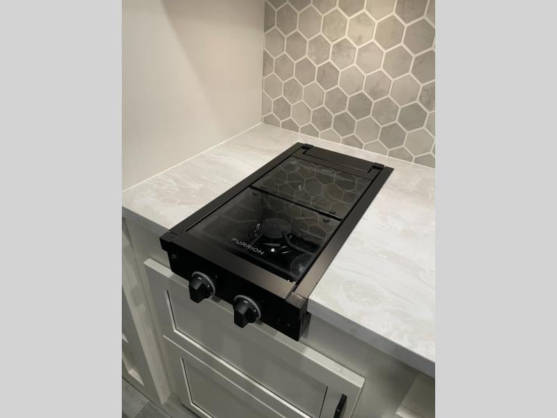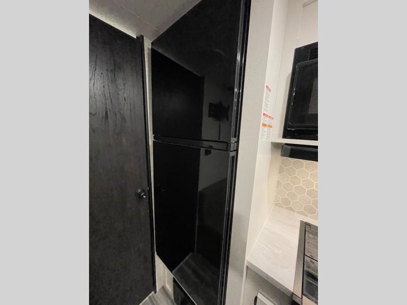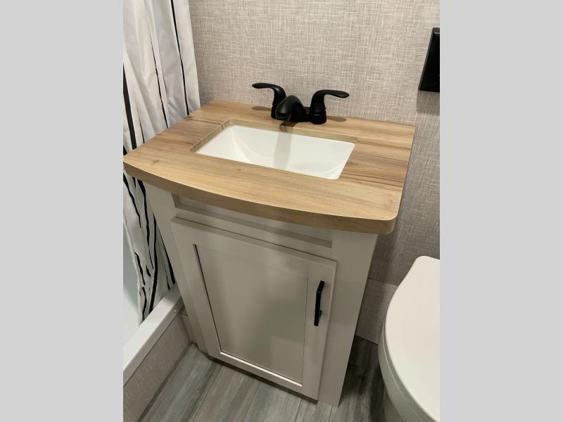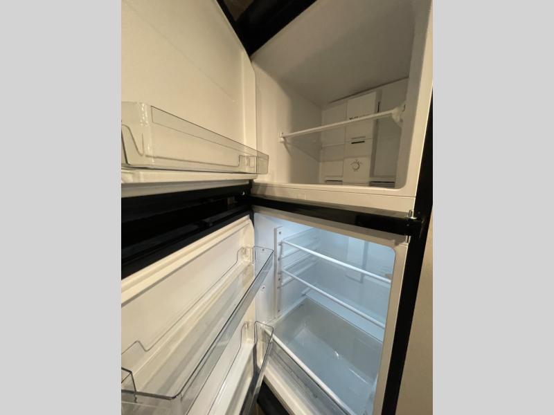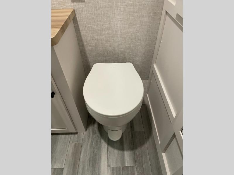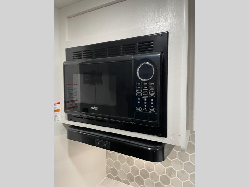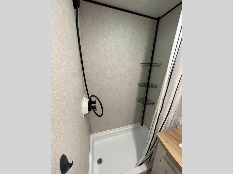 Head to the lake or the woods in this cozy travel trailer that can sleep three to four each night. There is a bed up front with dual wardrobes on either side of the bed, plus a booth dinette for guests. You will appreciate plenty of overhead storage for all your belongings, and the full rear bath is both spacious and tucked away for privacy. This model also has everything needed each day to prepare at-home meals, including a microwave oven and a two burner cooktop.