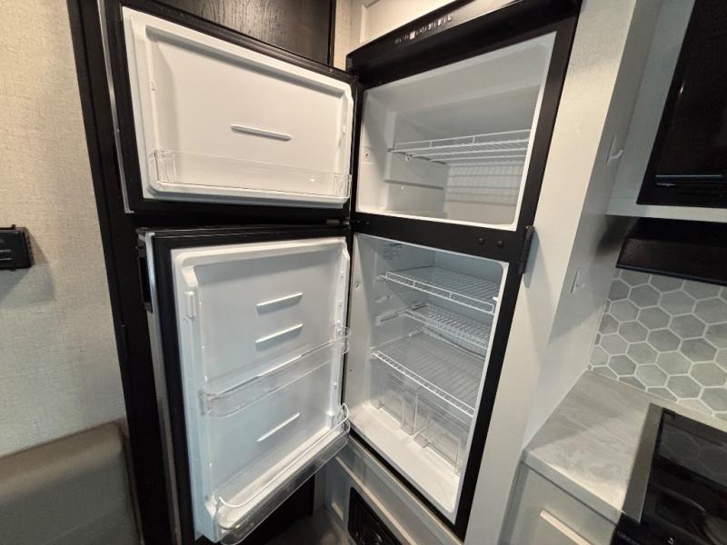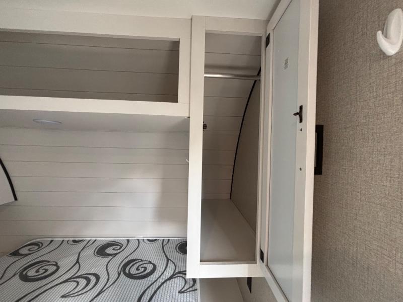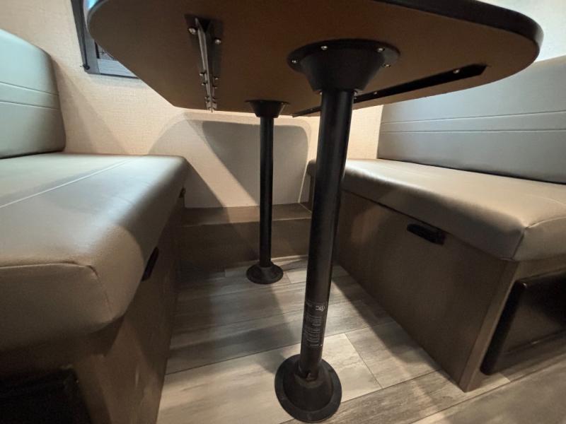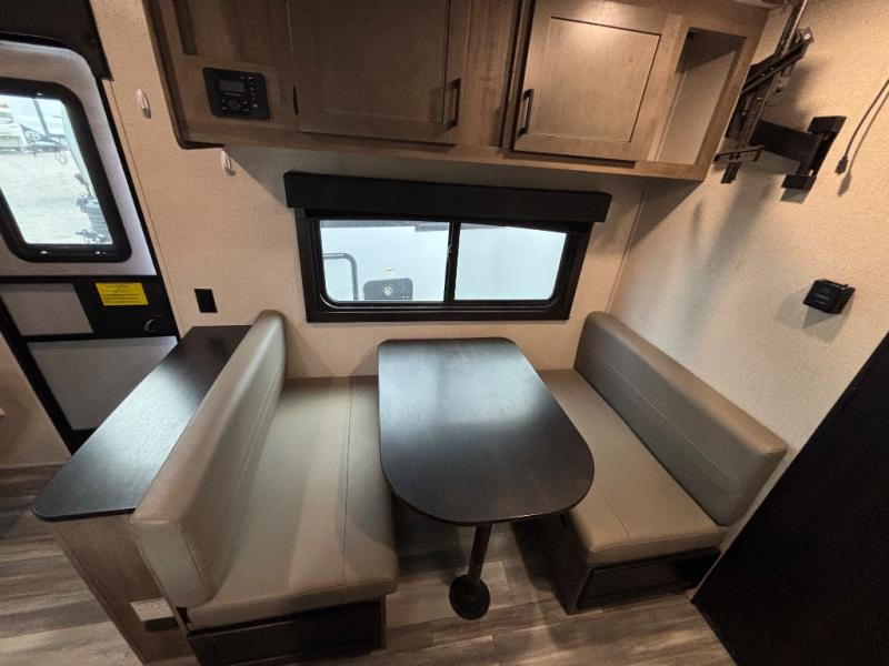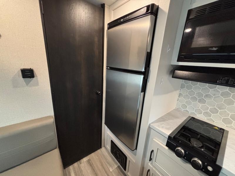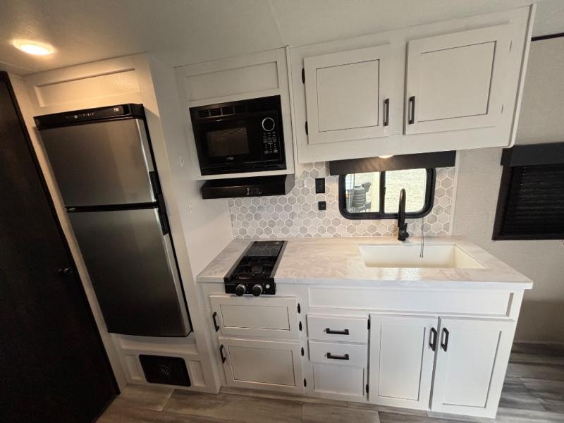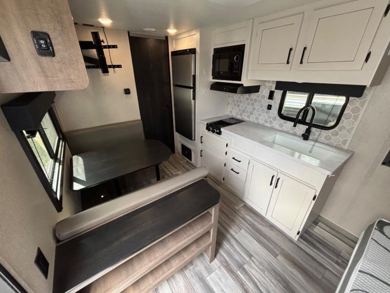 Head to the lake or the woods in this cozy travel trailer that can sleep three to four each night. There is a bed up front with dual wardrobes on either side of the bed, plus a booth dinette for guests. You will appreciate plenty of overhead storage for all your belongings, and the full rear bath is both spacious and tucked away for privacy. This model also has everything needed each day to prepare at-home meals, including a microwave oven and a two burner cooktop.