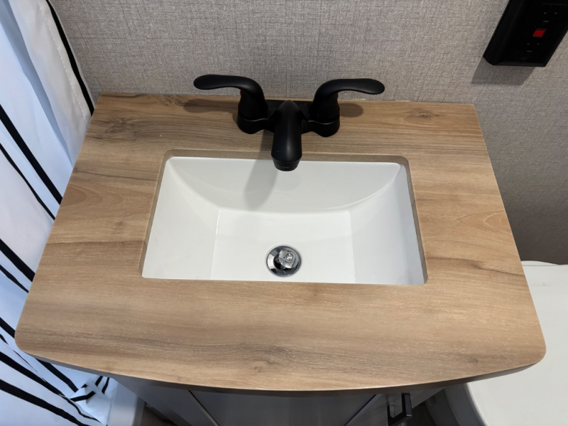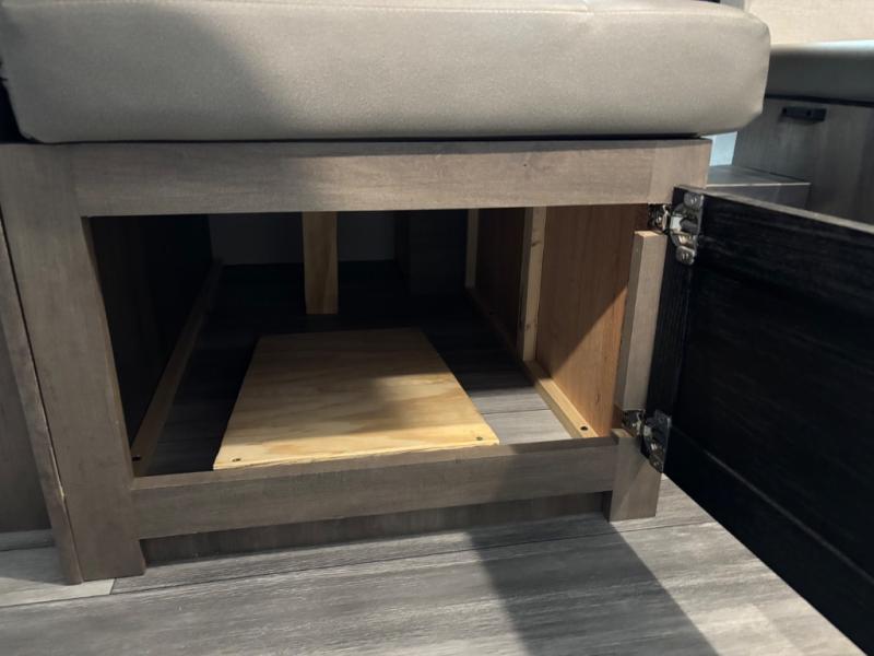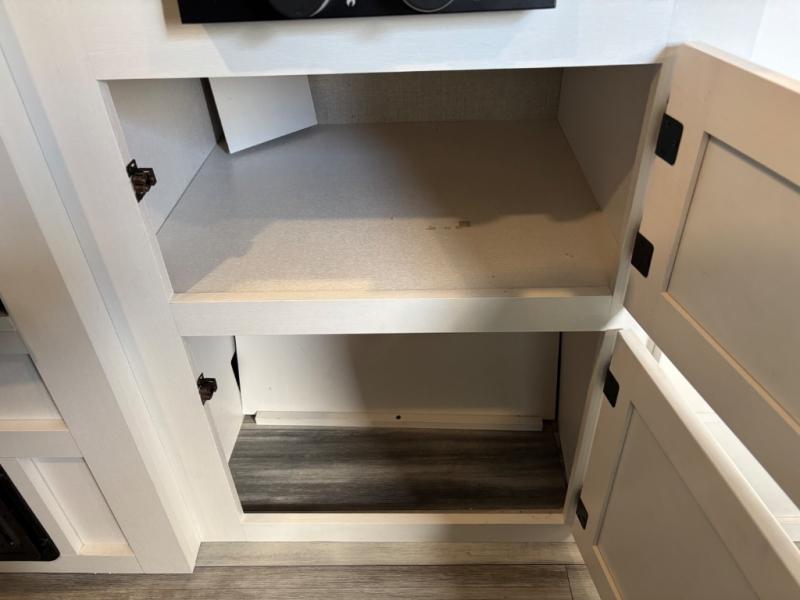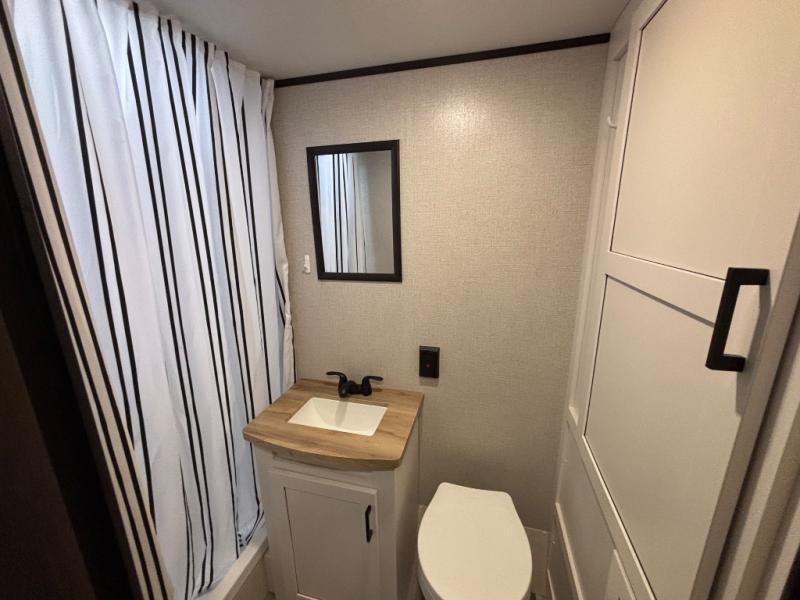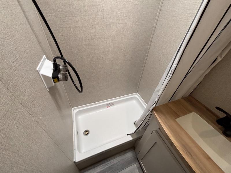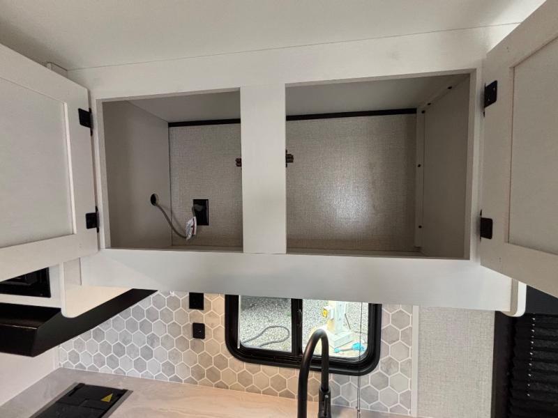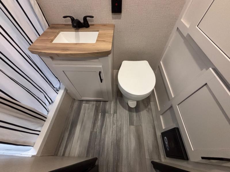 Head to the lake or the woods in this cozy travel trailer that can sleep three to four each night. There is a bed up front with dual wardrobes on either side of the bed, plus a booth dinette for guests. You will appreciate plenty of overhead storage for all your belongings, and the full rear bath is both spacious and tucked away for privacy. This model also has everything needed each day to prepare at-home meals, including a microwave oven and a two burner cooktop.
