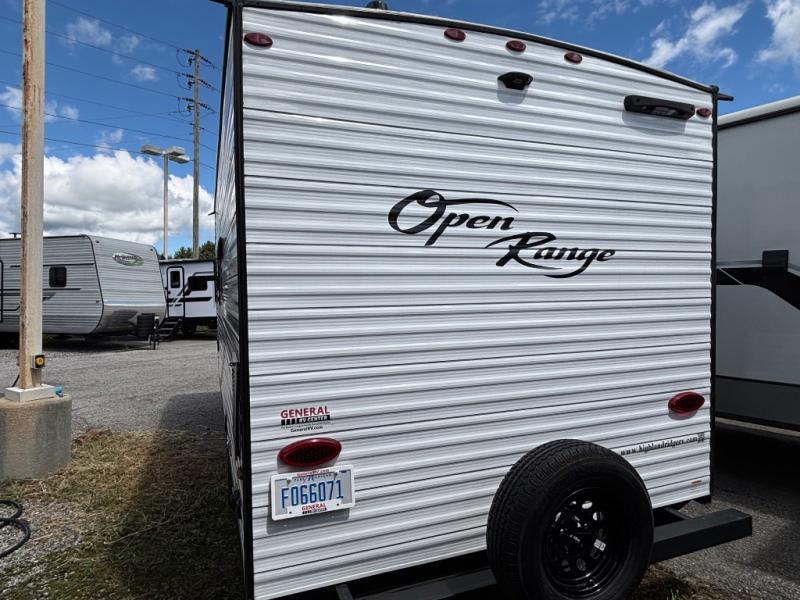 The affordable Open Range Conventional travel trailers by Highland Ridge are ready to meet your camping needs! You will appreciate the durable Magnum Roof system, plus each model is constructed with black front diamond plate protection, 5/8" main floor decking, and self-adjusting electric brakes with E-Z Lube axles for smooth towing. The 81" interior height means you won't feel cramped when relaxing with friends and family, and the residential vinyl flooring throughout is easy to clean, which will be perfect if you're camping with little ones or pets. These models also include an AM/FM/Bluetooth radio with indoor/outdoor speakers, a digital TV antenna that will go perfectly with the optional Smart TV, plus a 13,500 BTU roof mounted A/C to keep you cool on those hot summer months.