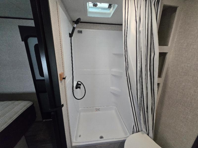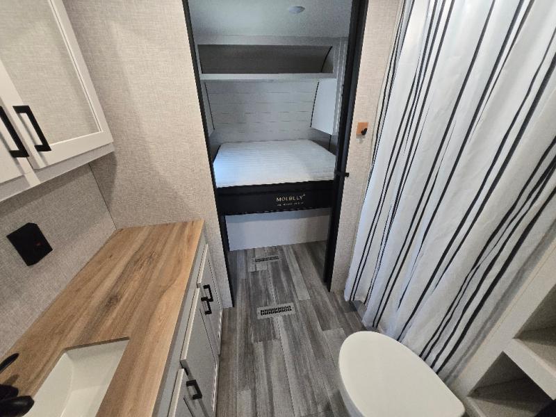 Eat, sleep, play, and relax in this travel trailer perfect for six! You will love to visit with friends on the tri-fold sofa and U-shaped dinette in the rear living area, and there is an entertainment center here where you can add an optional Smart TV. Freshen up in the spacious walk-through bath that includes a large shower and tons of counter space, and the front master bedroom will feel just like home. Here, you'll find an easy lift bed with storage, dual wardrobes, and your own exterior entry door!