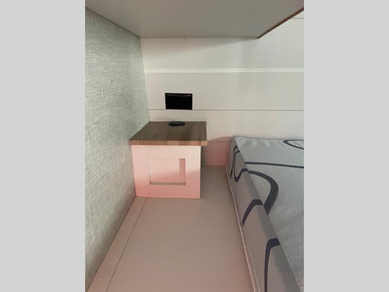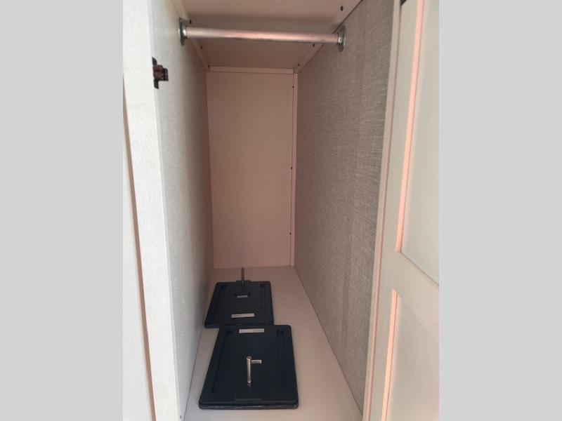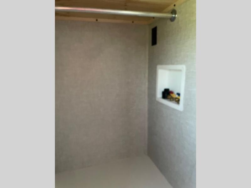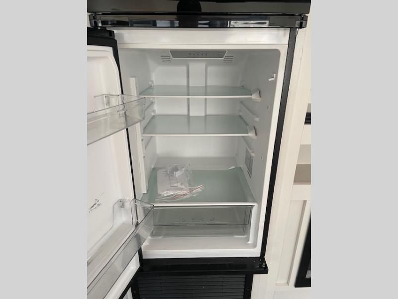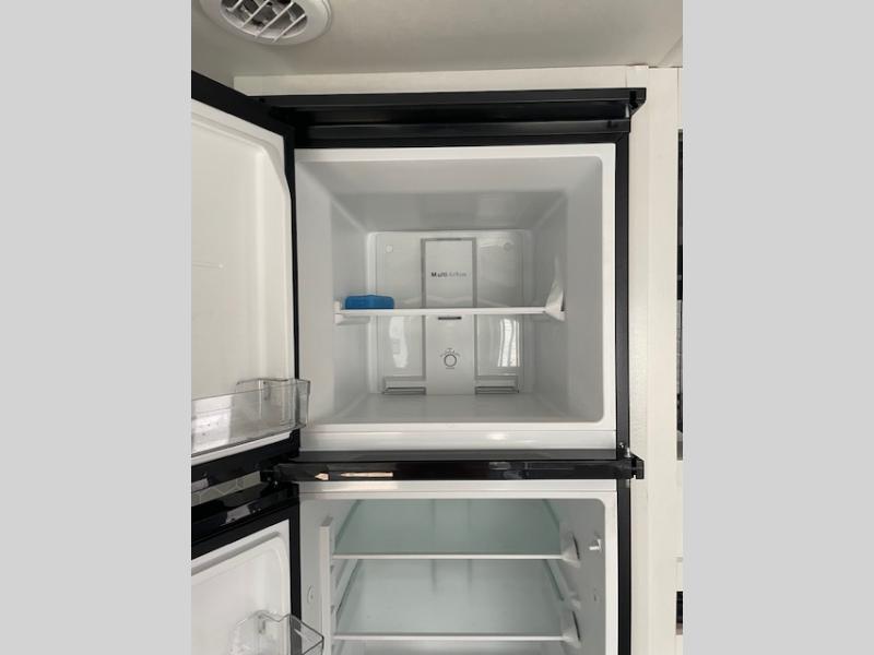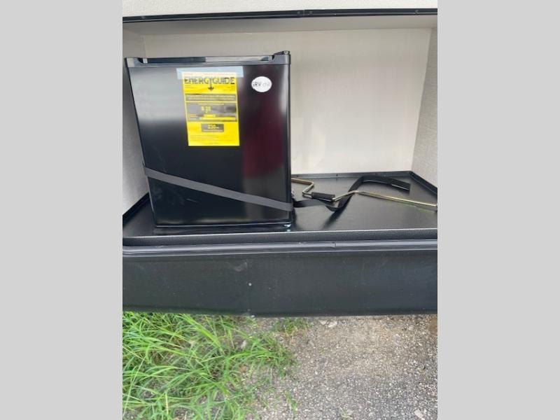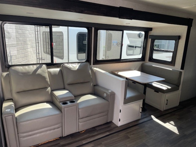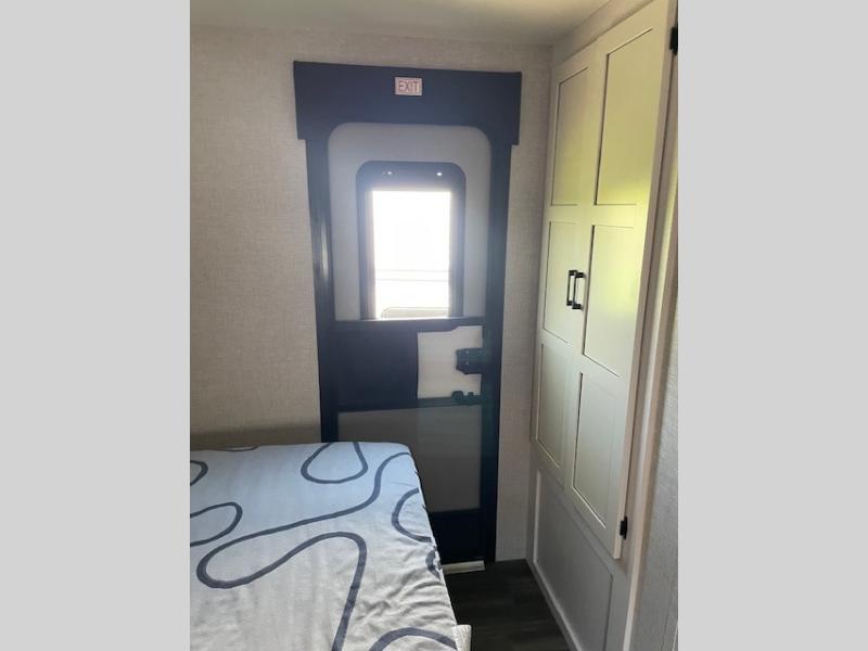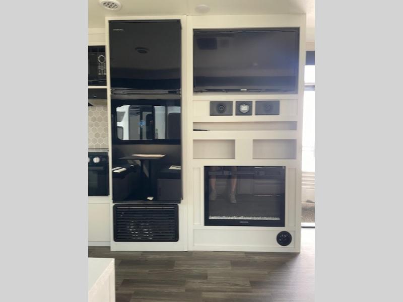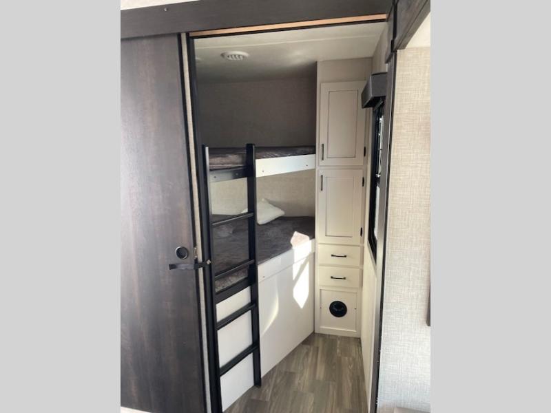 You can bring the whole family with you in this travel trailer! Your family and/or friends will appreciate having their own privacy with the rear bunkhouse which includes a set of queen bunks and a wardrobe for their clothes. You will have your own privacy with a separate front private bedroom which has a 72" x 80" king bed with wardrobes on either side, a closet that is prepped to add an optional washer and dryer, and even one of the dual entry doors to the unit. Keep everyone's bellies full creating meals and snacks with the three burner cooktop, 10 cu. ft. refrigerator, and the handy countertop extension. Enjoy your meals together as a family at the booth dinette then play a card game or relax on the theater seating across from the entertainment center. You even have an outside kitchen with a refrigerator to keep your beverage cold while you cook!