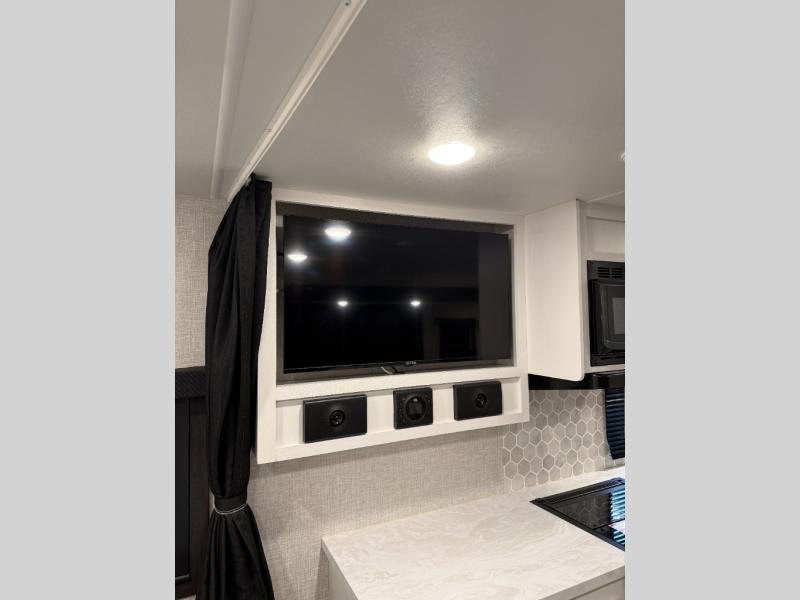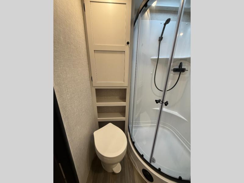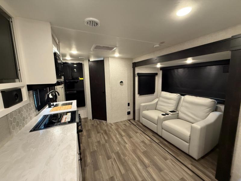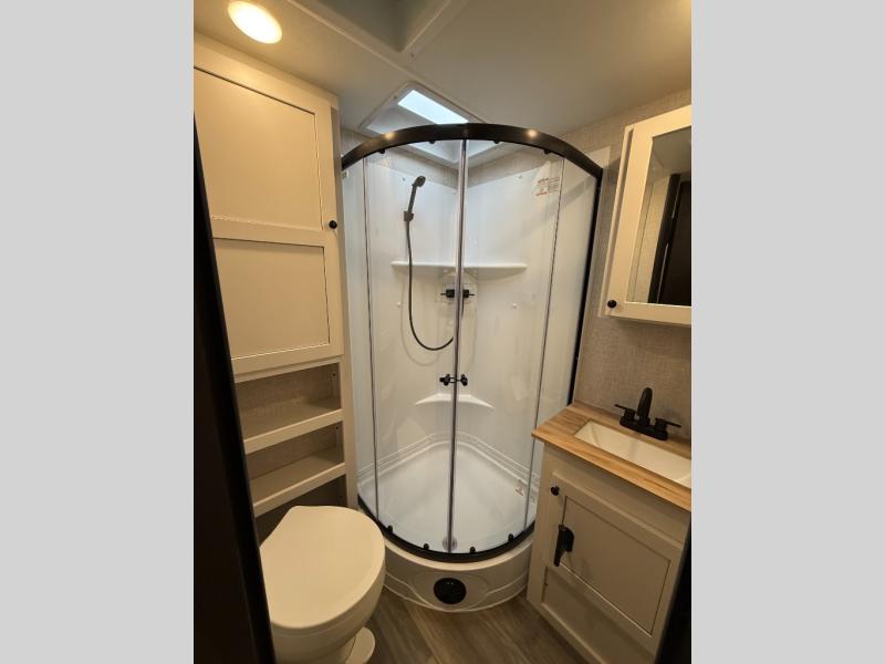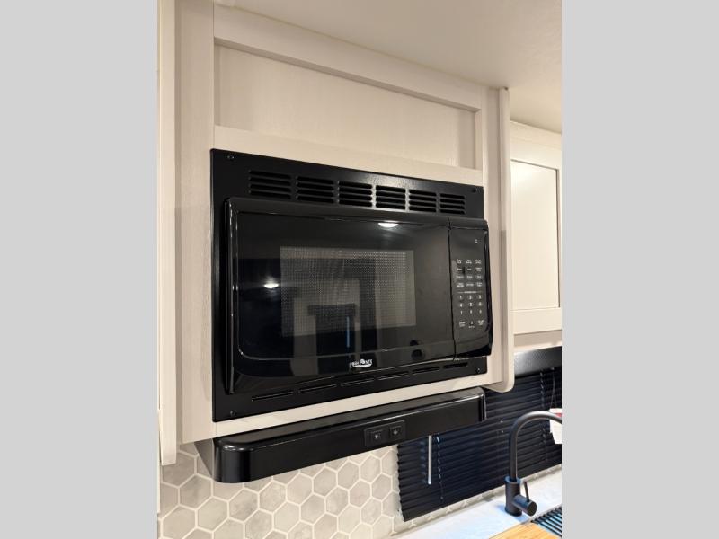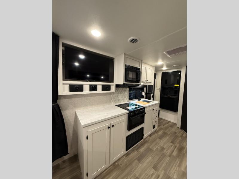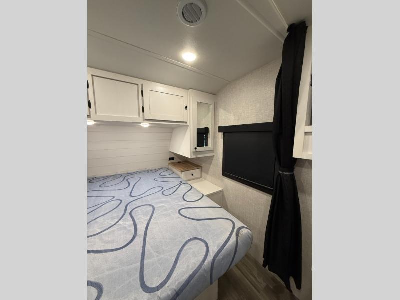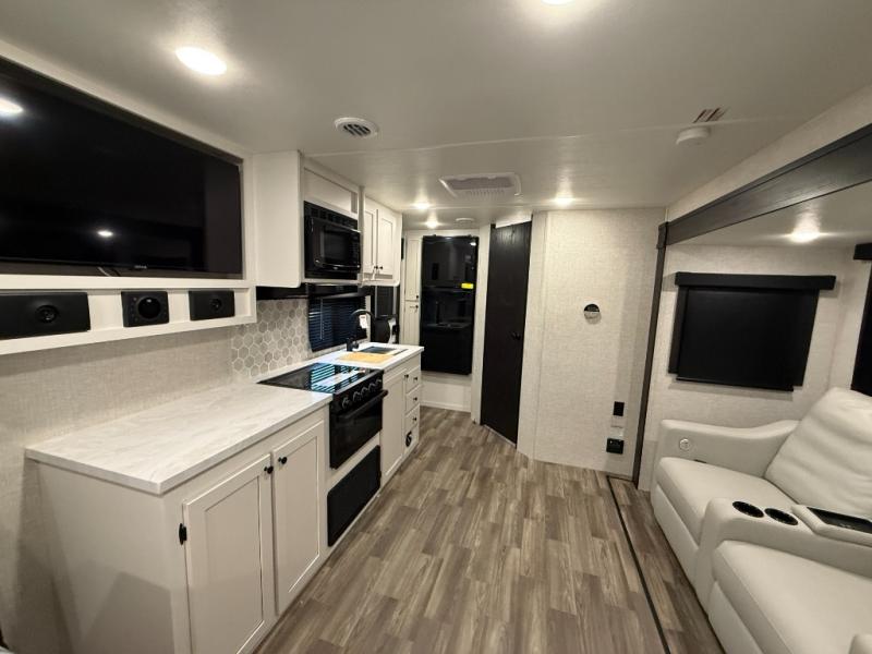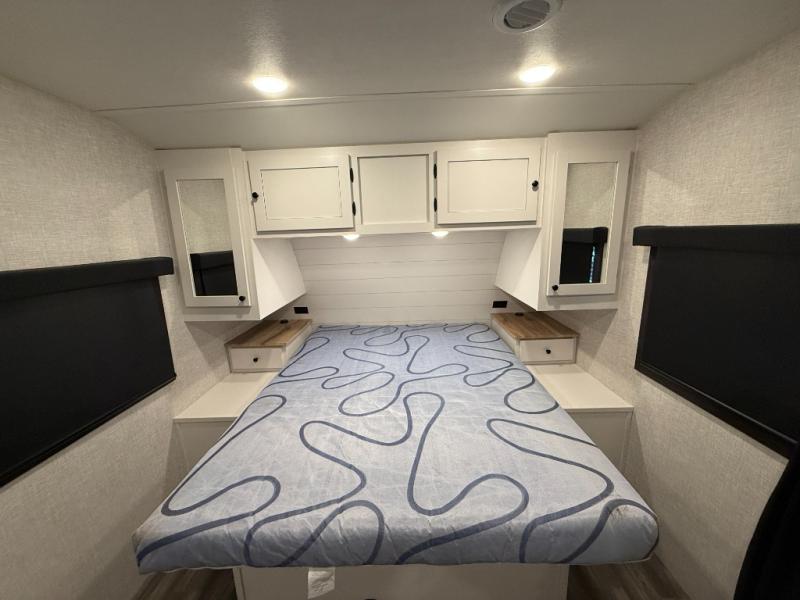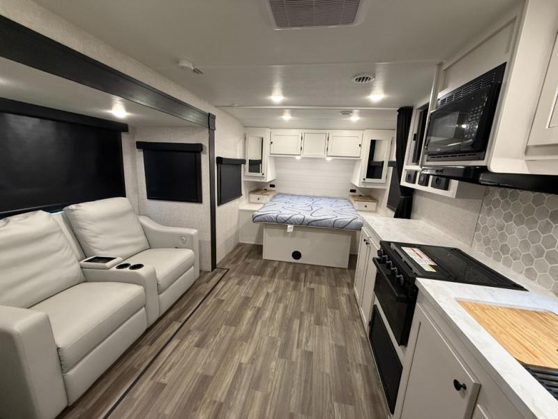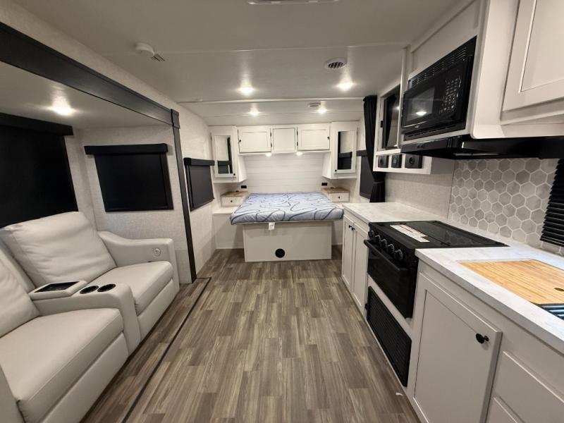 This travel trailer is the perfect couple's getaway! It features a front queen bed with wardrobes on either side for your clothes, overhead cabinets, and a privacy curtain to draw at night. You can prepare your best meals with the three burner cooktop with a 17" oven, enjoy them at the L-sofa with a table which is conveniently across from the entertainment center that has a smart HDTV, and store any leftovers in the 10 cu. ft. refrigerator. The rear corner bathroom has a radius shower to freshen up in each morning, a medicine cabinet to store your toiletries, and a linen closet to keep your towels close.